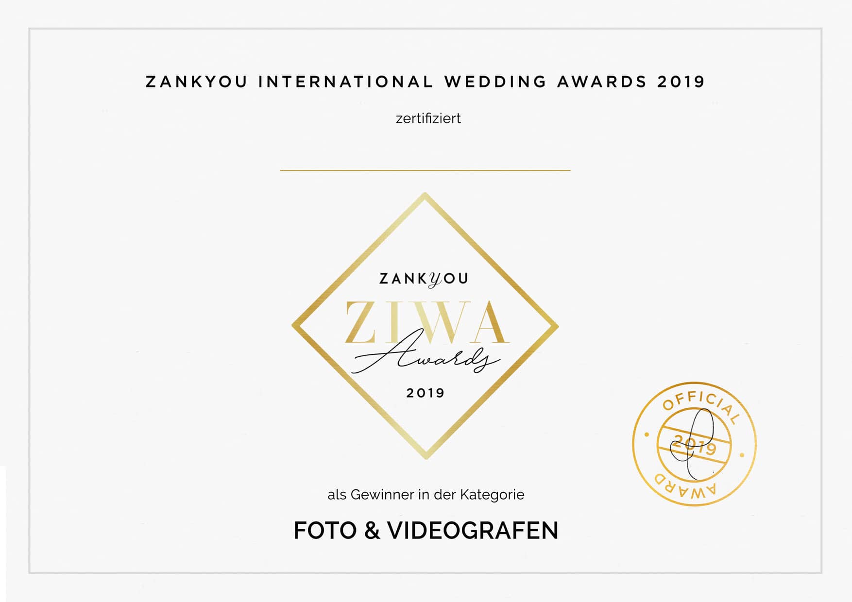 - 2019 Gewinner in der Kategorie Fotografie Film bei Zankyou – ZIWA Awards