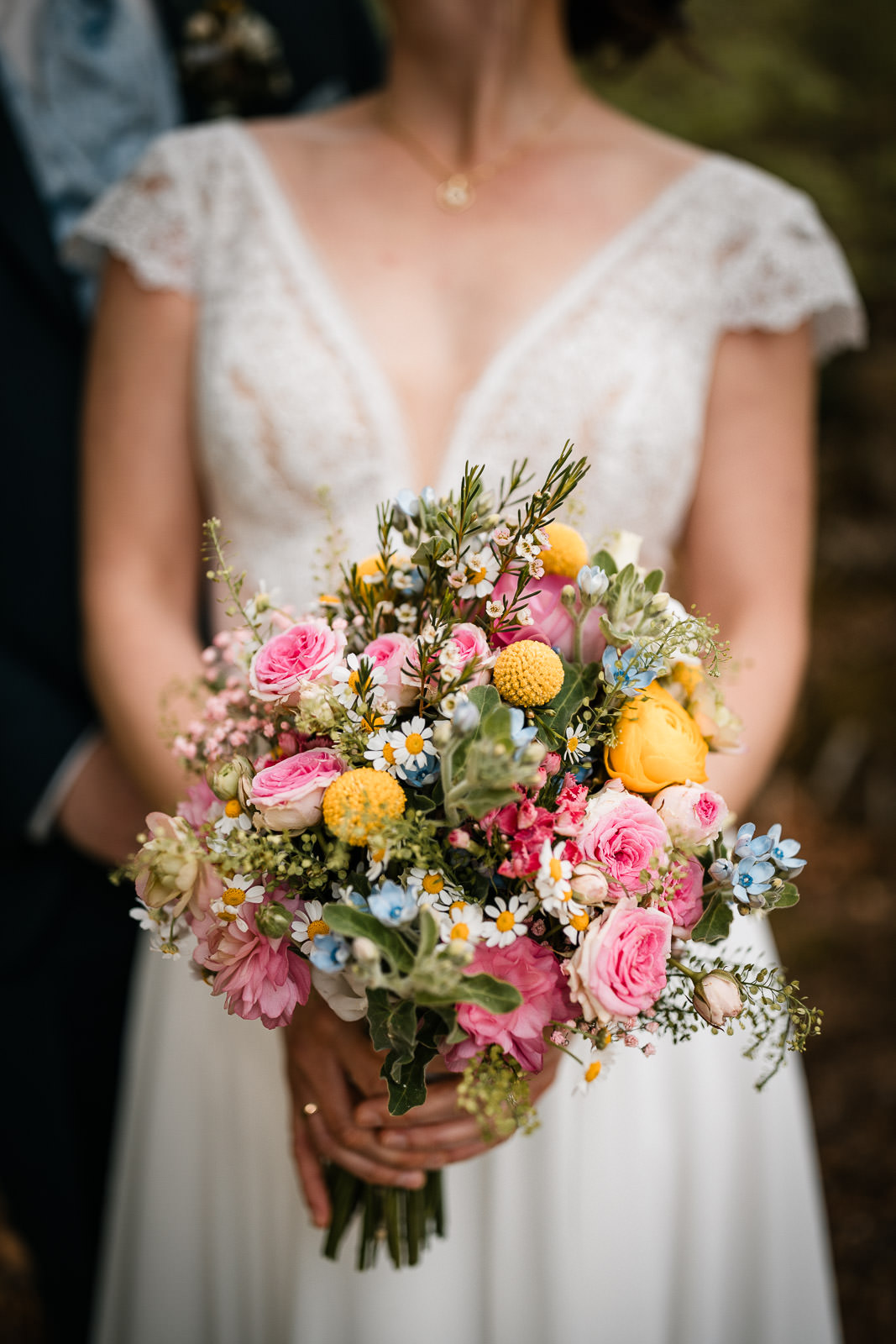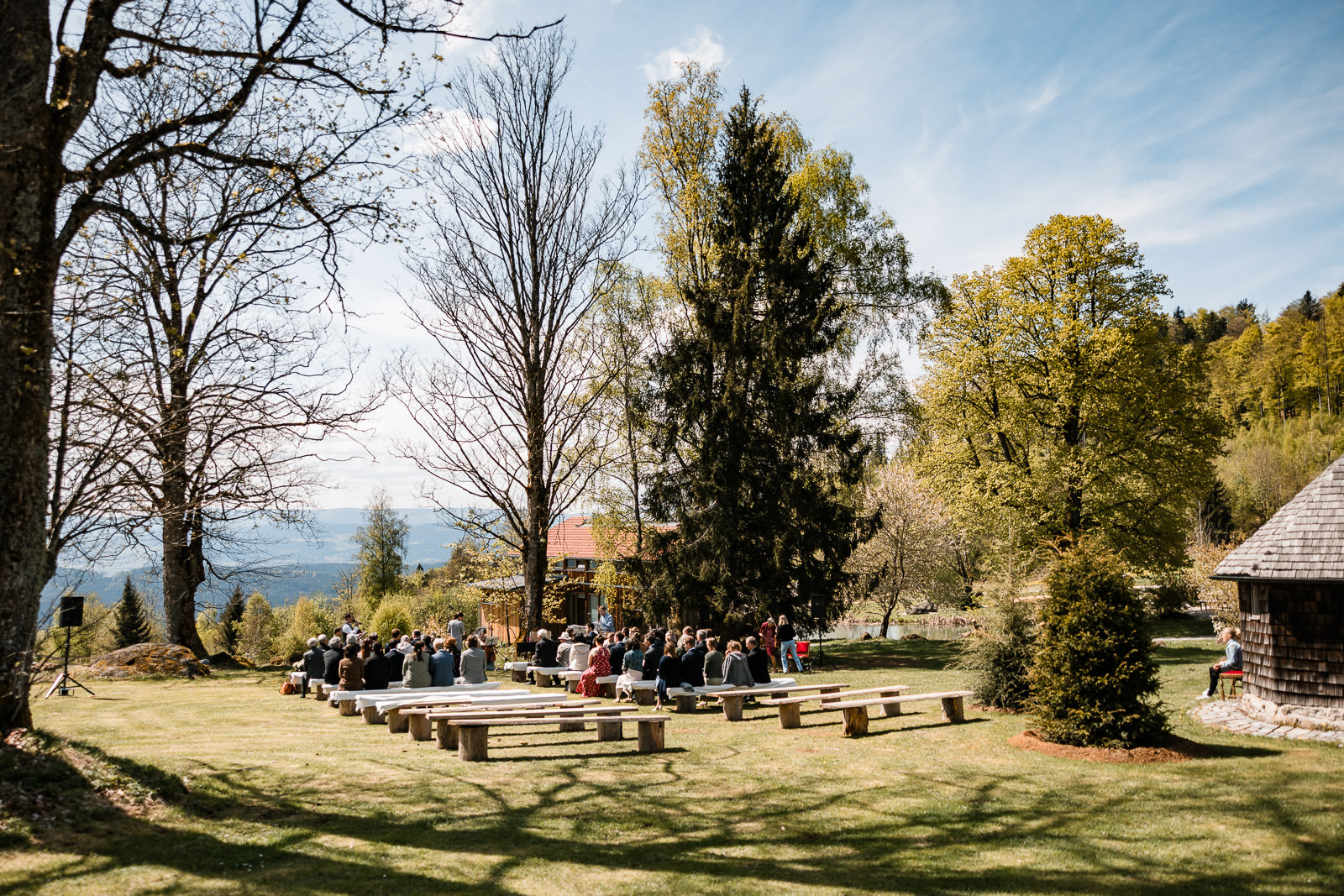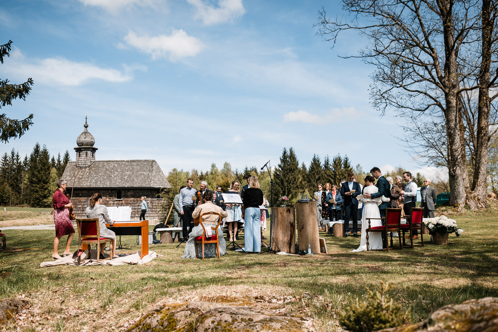 Die freie Trauung fand auf der Almwiese statt, umgeben von Natur und Weite. Im Mittelpunkt standen persönliche Worte, ehrliche Emotionen und die gemeinsame Geschichte von Bettina und Jonas. Ohne formelle Vorgaben entstand eine Zeremonie, die ruhig, emotional und sehr nahbar war – genau das, was sich viele Paare für ihre Hochzeit im Bayerischen Wald wünschen.