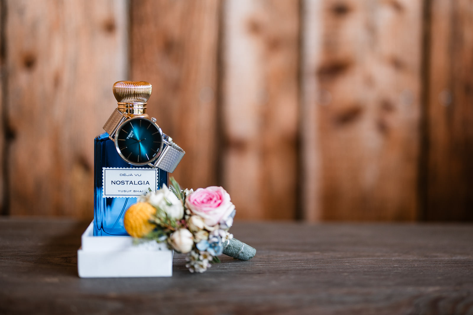 Die Kombination aus Holz, Naturmaterialien und Landschaft sorgt für eine zeitlose Bildwirkung – ideal für moderne Hochzeitsfotografie.
