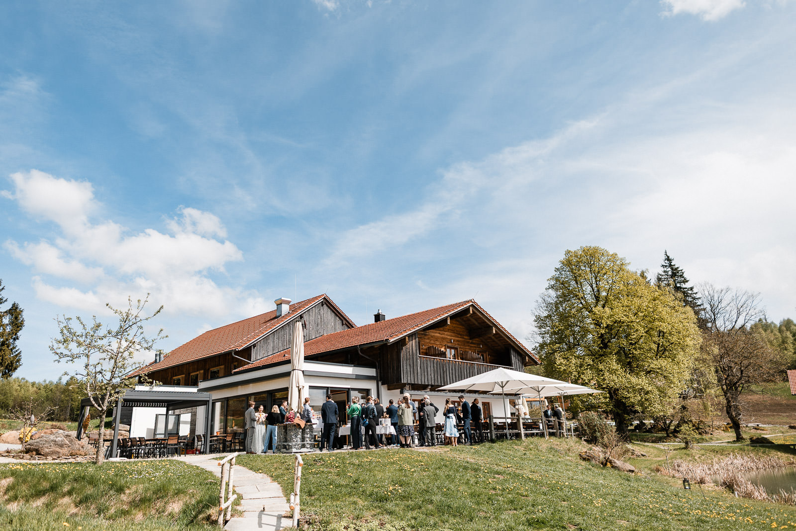 Nach der Trauung wurde auf der Terrasse der Gutsalm angestoßen. Die entspannte Stimmung, gute Gespräche und der Blick über den Bayerischen Wald prägten den weiteren Verlauf des Tages. Für Hochzeitsreportagen sind diese Phasen besonders wertvoll – hier entstehen die ehrlichsten Bilder.