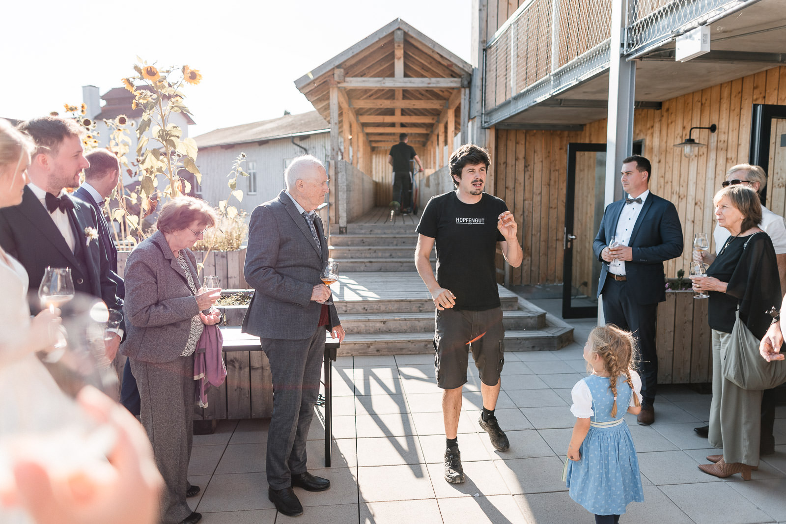 Der Empfang zwischen den Hopfenanlagen sorgt für eine lockere und natürliche Stimmung. Die Kombination aus Weitblick und Natur hebt sich deutlich von klassischen Locations ab.