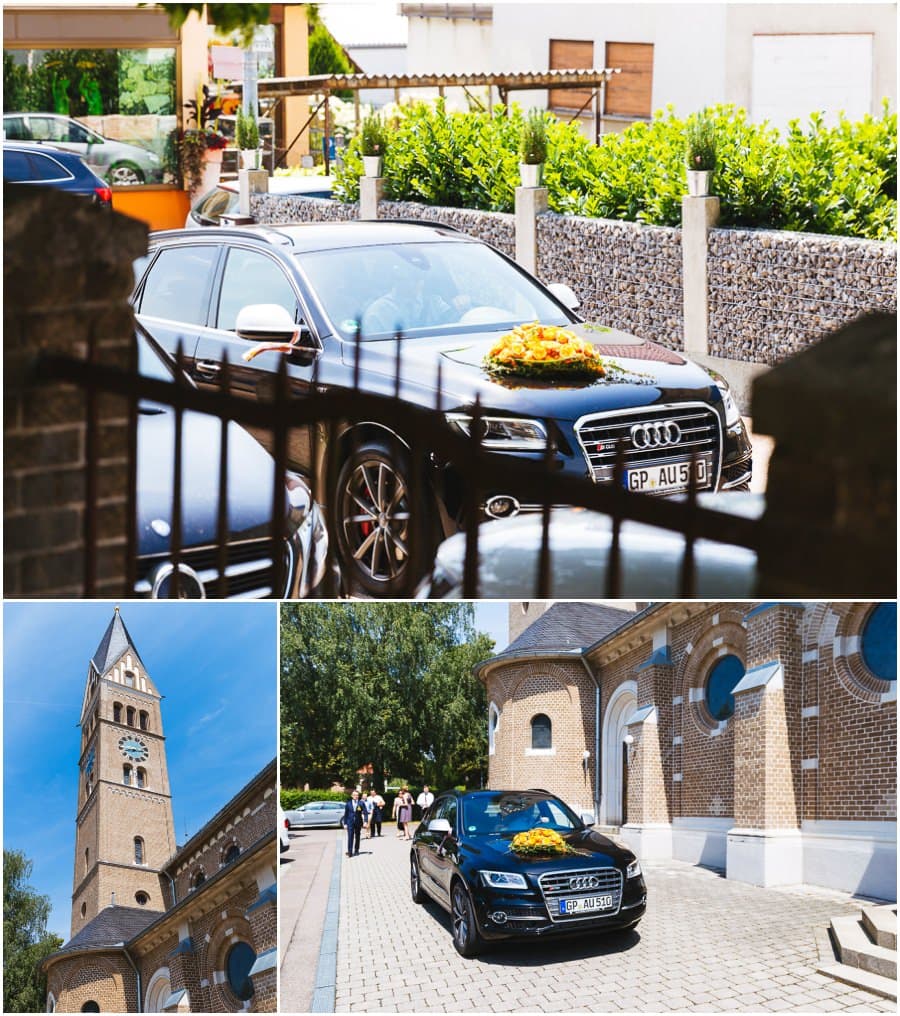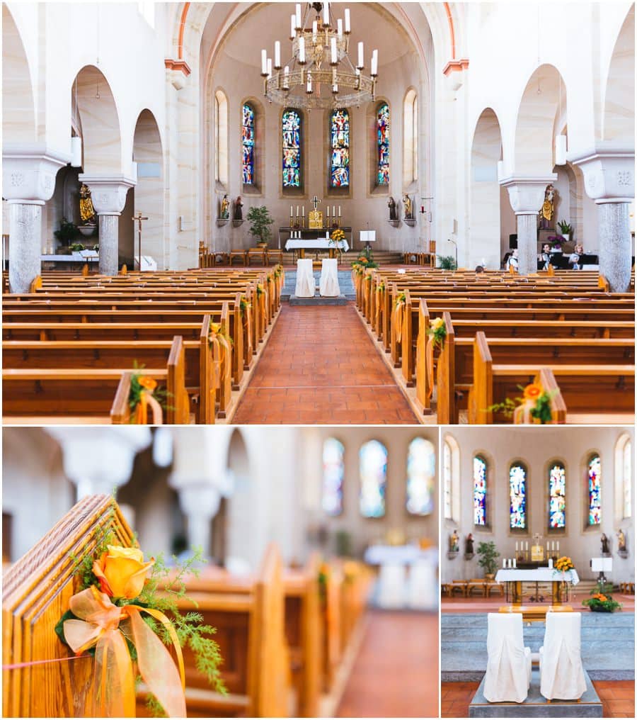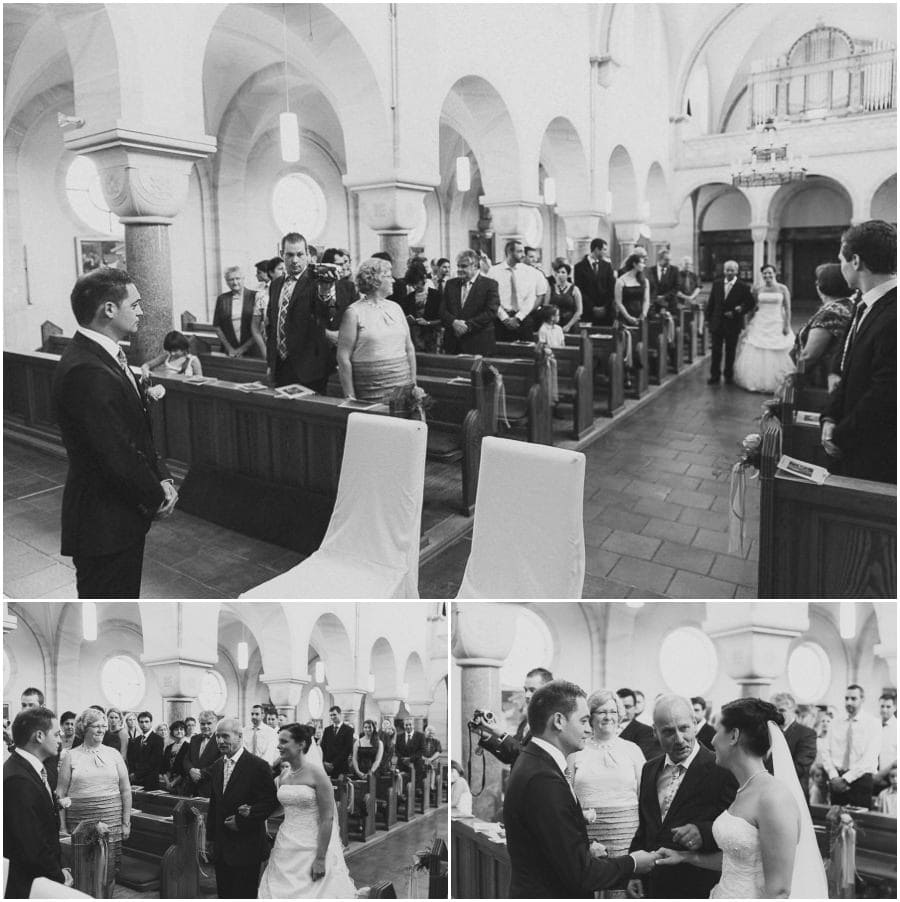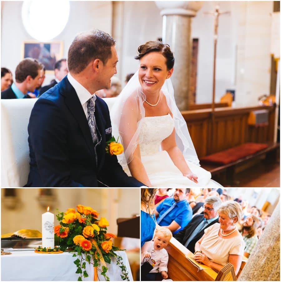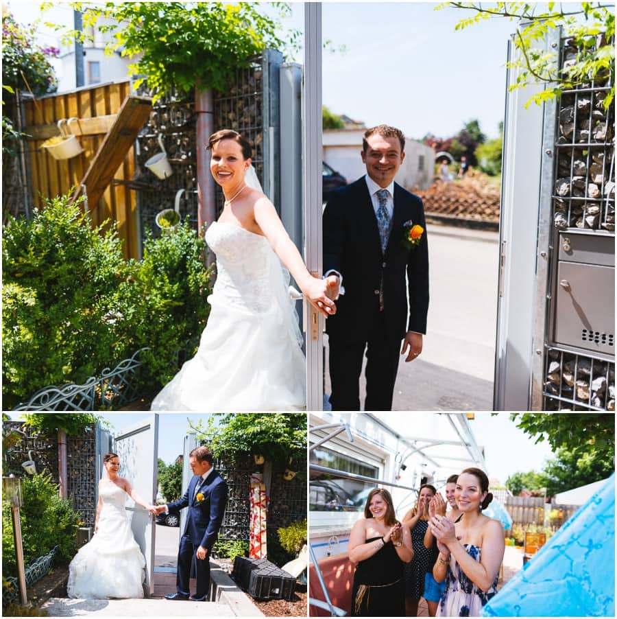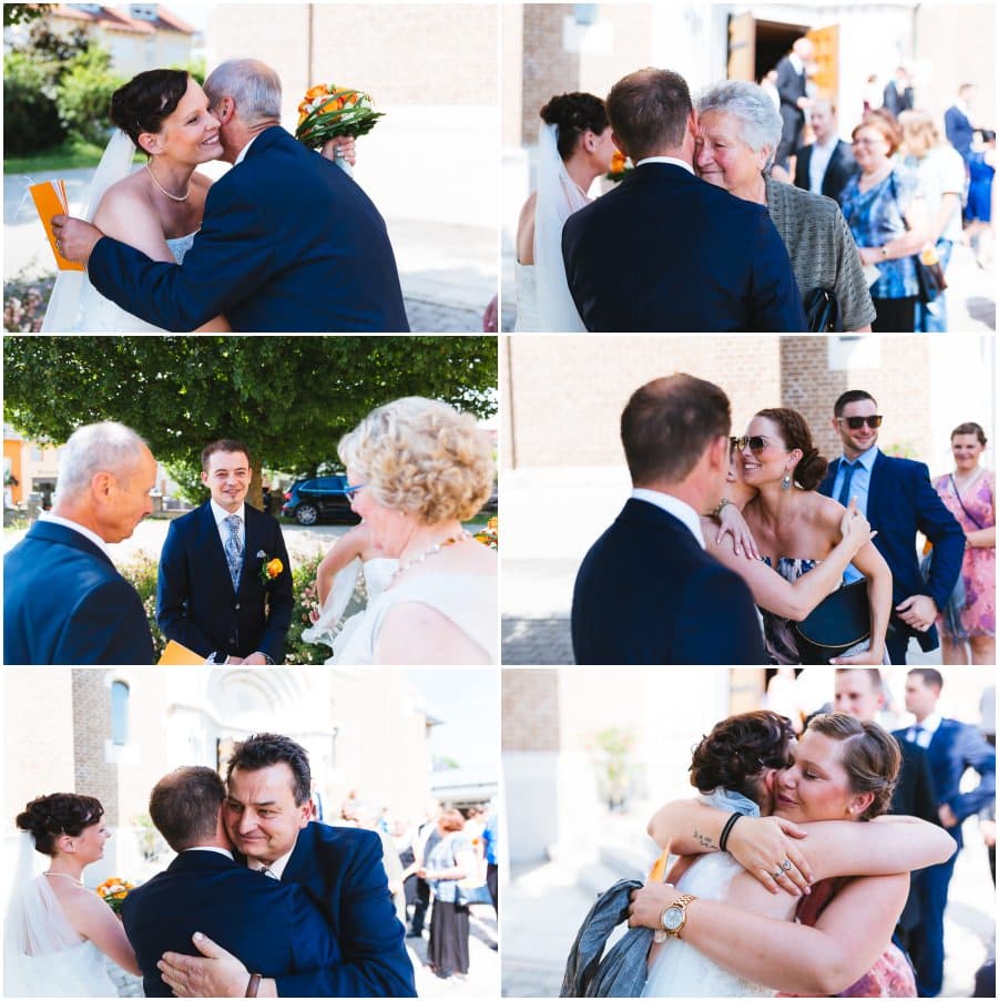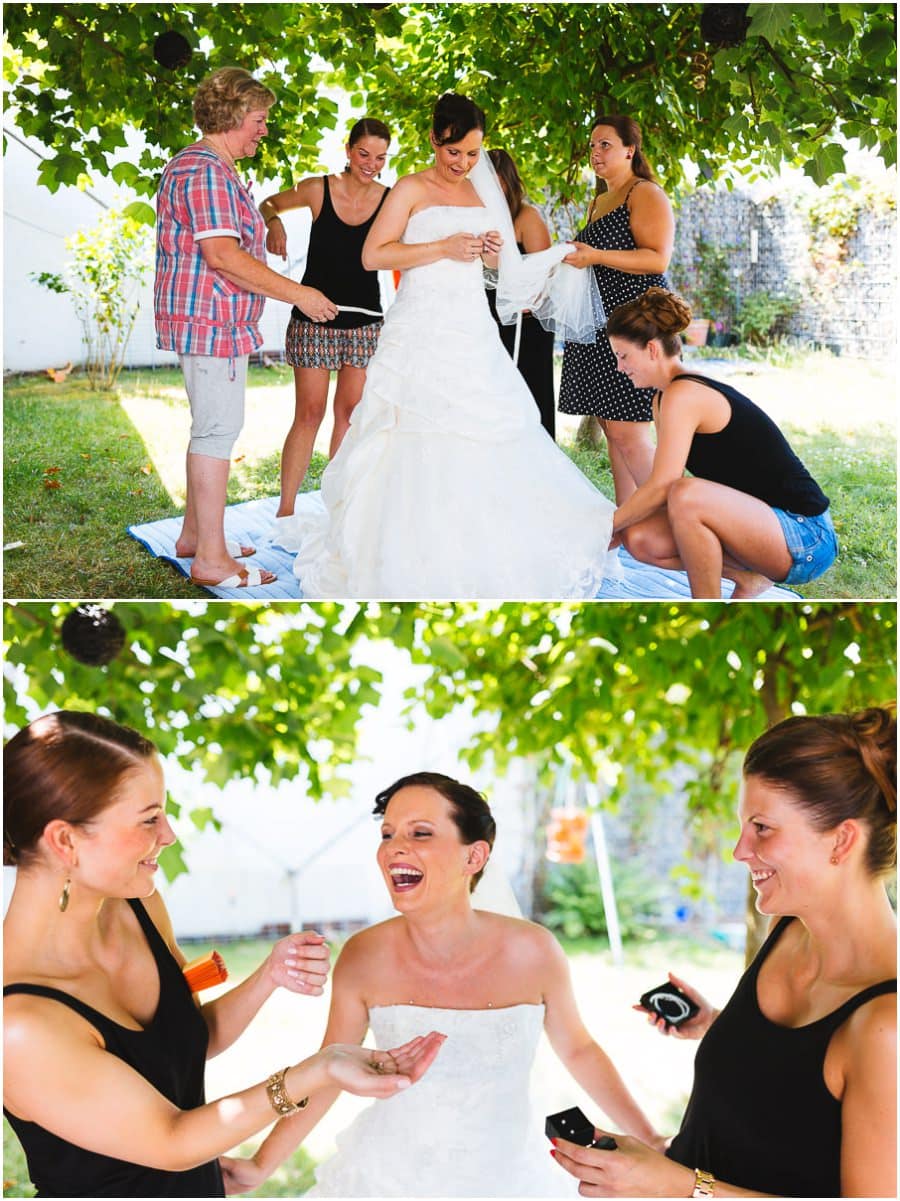 Das Getting-Ready verlegte Stefanie kurzerhand – aufgrund der teilweise unerträglichen Hitze – nach draußen, dort zog sie sich dann im kühleren Schatten ihr Brautkleid an, wobei ihre Mutter und Freundinnen ihr geholfen haben. Kurze Zeit später war das erste zusammentreffen der beiden, der sogenannte First Look. Jochen war sichtlich gerührt von der Schönheit seiner Braut. Es ist immer wieder schön zu sehen, welche Emotionen sich in diesem Moment treffen. Für mich als Hochzeitsfotograf ein absolut atemberaubender Moment. Anschließend ging es zur kirchlichen Trauung in der Nahe gelegenen Kirche. Nach der Trauung ging es direkt zur Feierlocation, dort wurde bis in die Nacht hinein gefeiert.