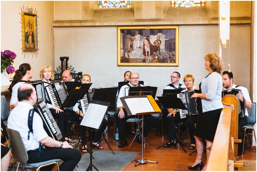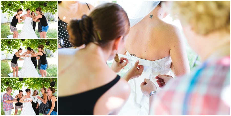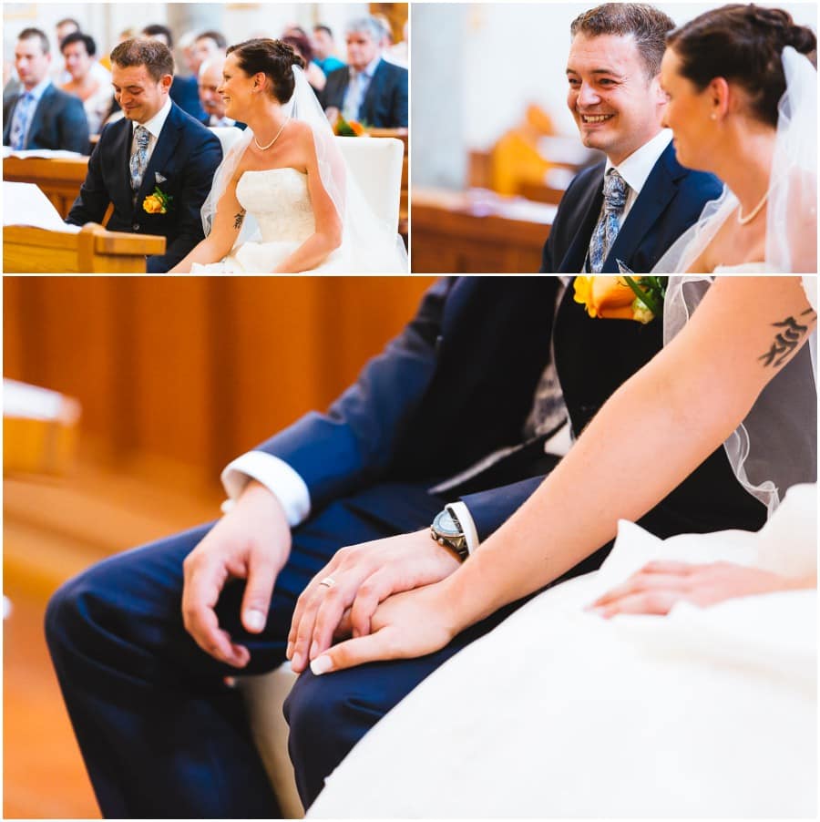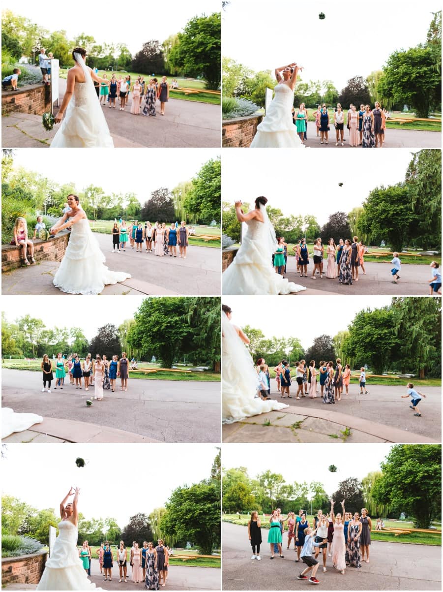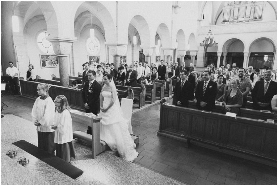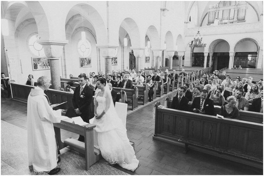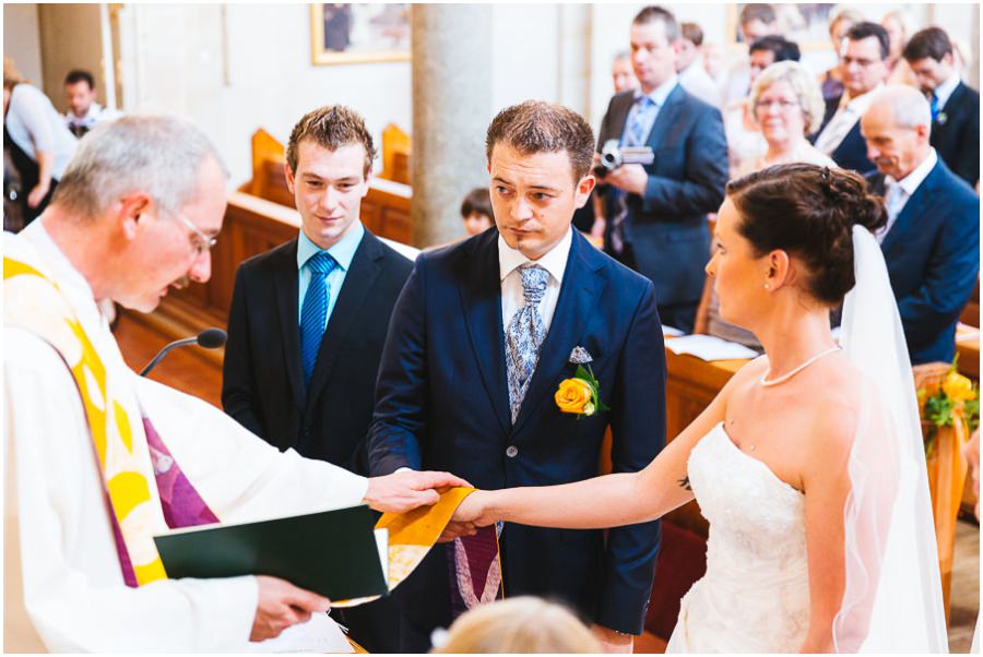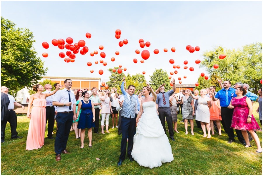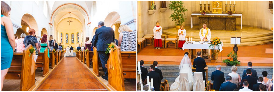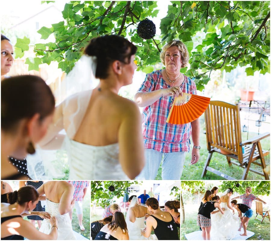 Das Getting-Ready verlegte Stefanie kurzerhand – aufgrund der teilweise unerträglichen Hitze – nach draußen, dort zog sie sich dann im kühleren Schatten ihr Brautkleid an, wobei ihre Mutter und Freundinnen ihr geholfen haben. Kurze Zeit später war das erste zusammentreffen der beiden, der sogenannte First Look. Jochen war sichtlich gerührt von der Schönheit seiner Braut. Es ist immer wieder schön zu sehen, welche Emotionen sich in diesem Moment treffen. Für mich als Hochzeitsfotograf ein absolut atemberaubender Moment. Anschließend ging es zur kirchlichen Trauung in der Nahe gelegenen Kirche. Nach der Trauung ging es direkt zur Feierlocation, dort wurde bis in die Nacht hinein gefeiert.