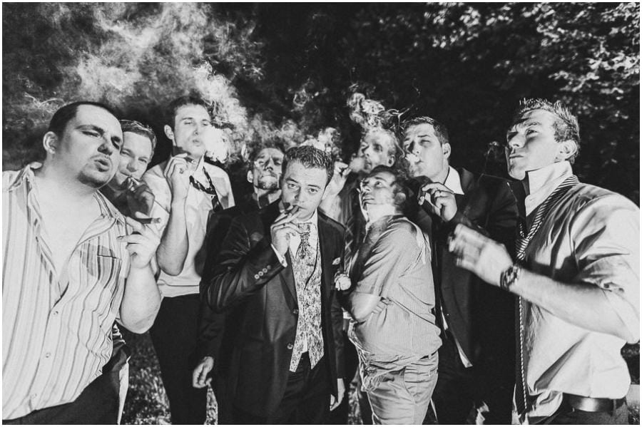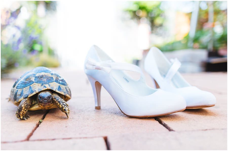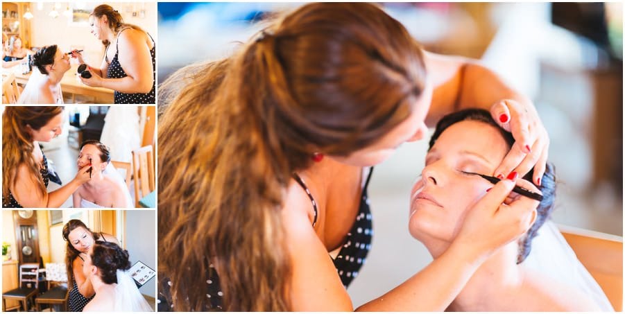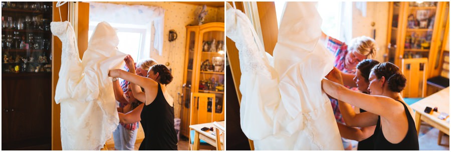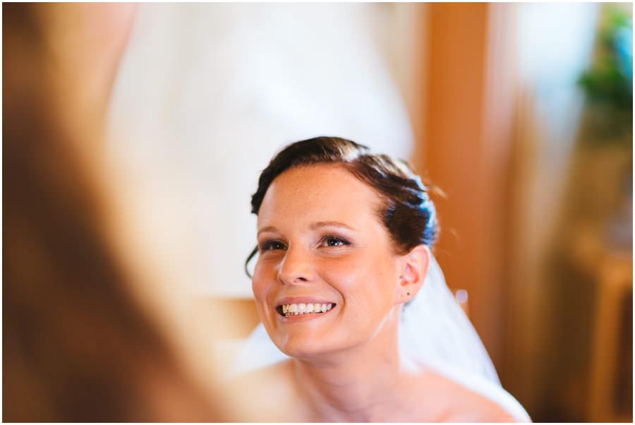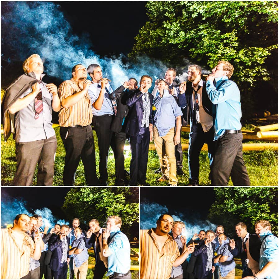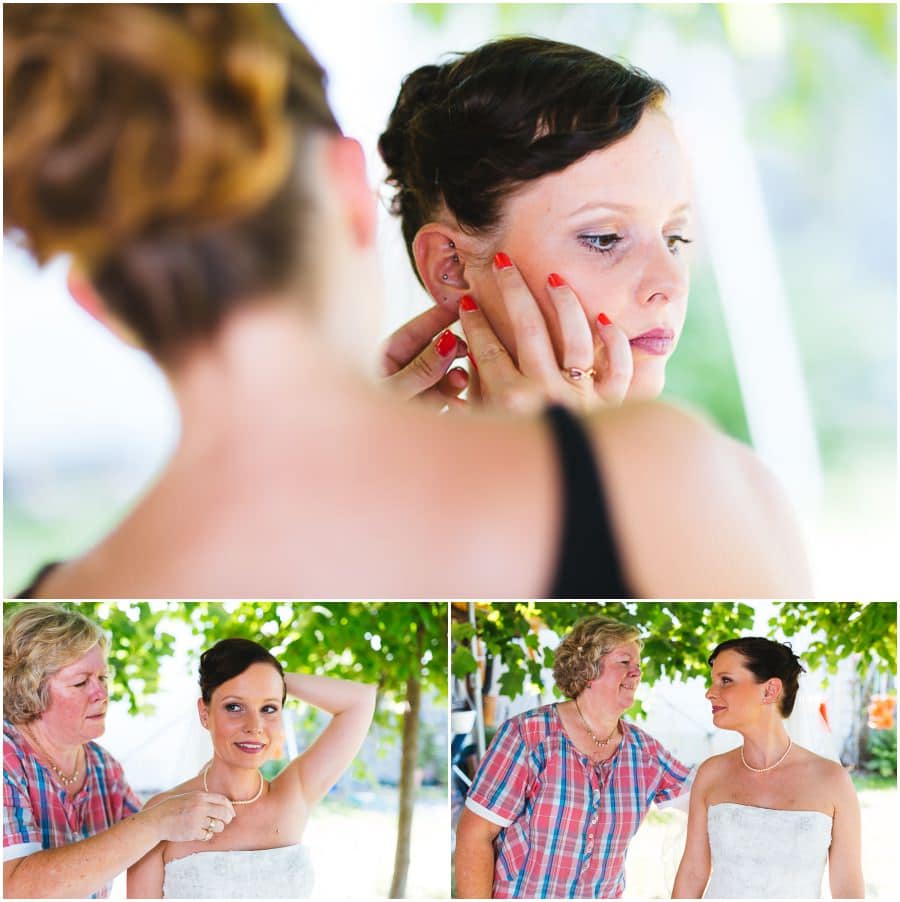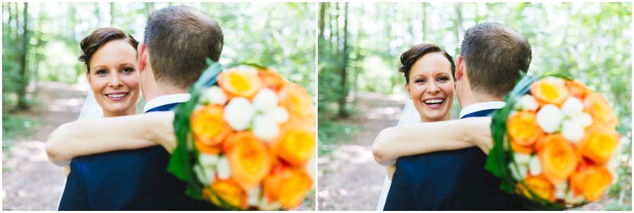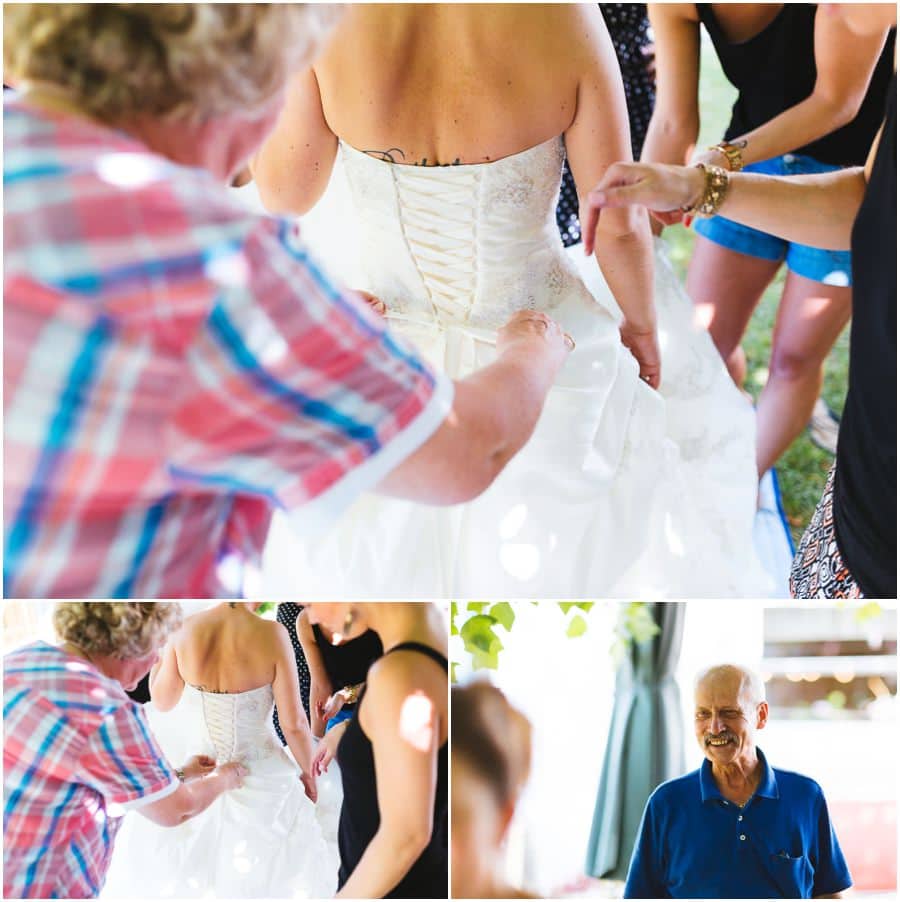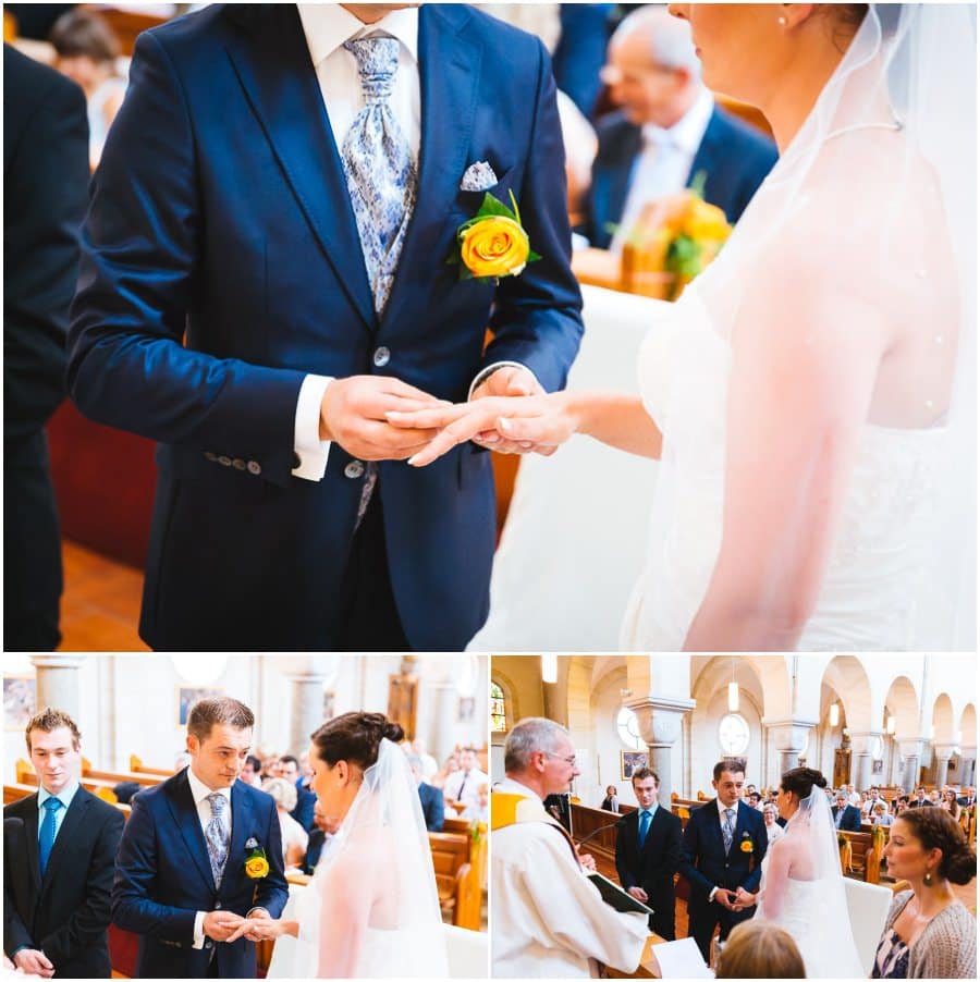 Das Getting-Ready verlegte Stefanie kurzerhand – aufgrund der teilweise unerträglichen Hitze – nach draußen, dort zog sie sich dann im kühleren Schatten ihr Brautkleid an, wobei ihre Mutter und Freundinnen ihr geholfen haben. Kurze Zeit später war das erste zusammentreffen der beiden, der sogenannte First Look. Jochen war sichtlich gerührt von der Schönheit seiner Braut. Es ist immer wieder schön zu sehen, welche Emotionen sich in diesem Moment treffen. Für mich als Hochzeitsfotograf ein absolut atemberaubender Moment. Anschließend ging es zur kirchlichen Trauung in der Nahe gelegenen Kirche. Nach der Trauung ging es direkt zur Feierlocation, dort wurde bis in die Nacht hinein gefeiert.