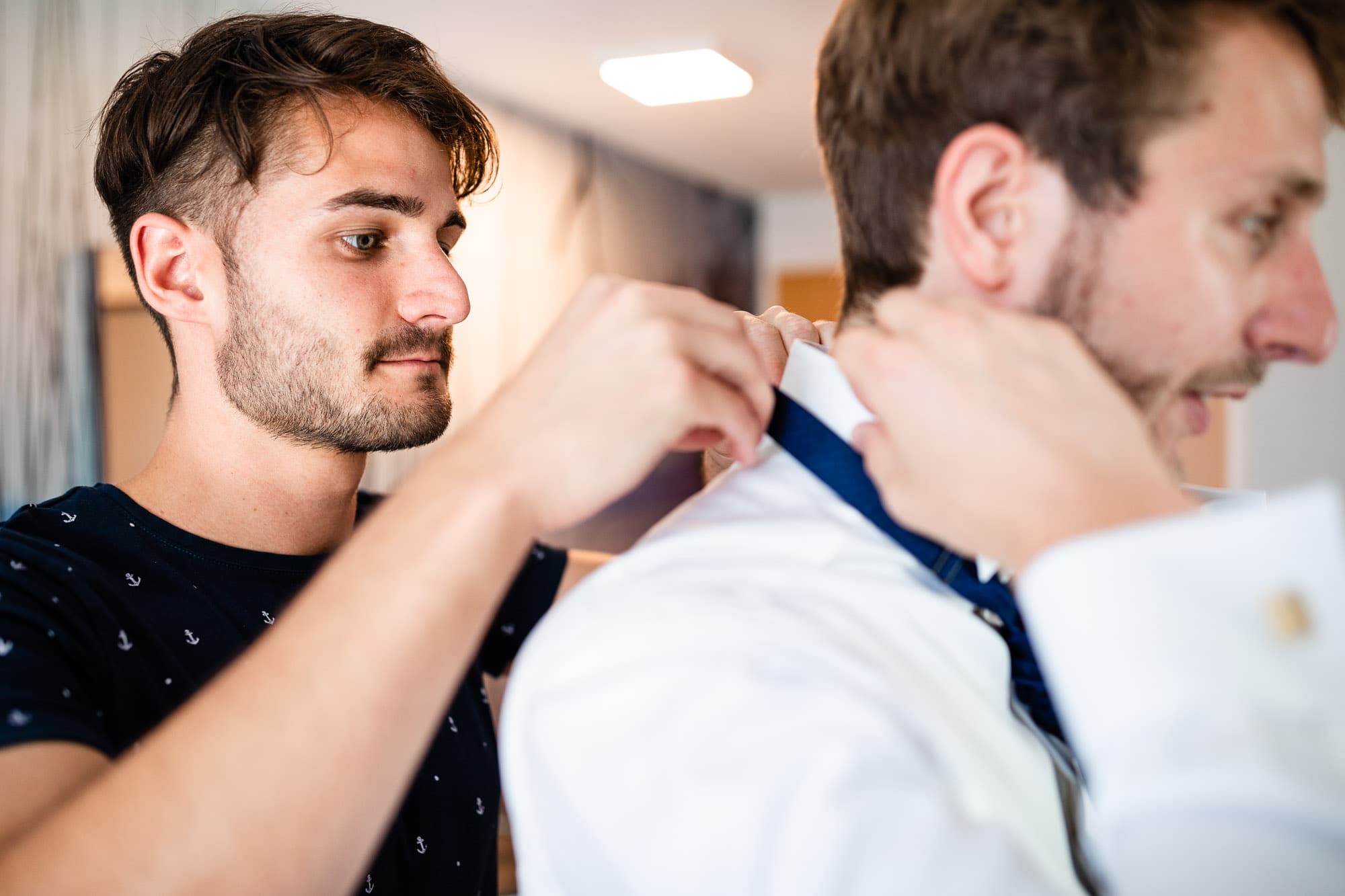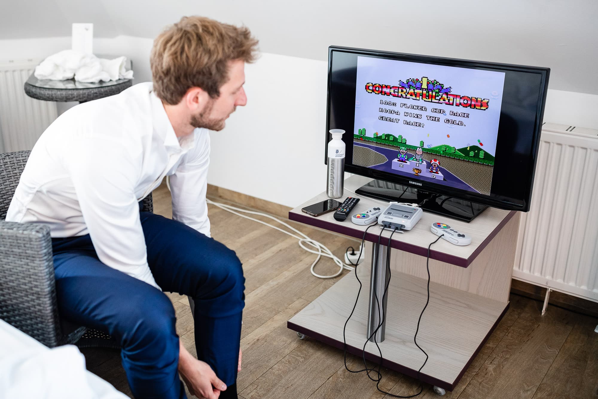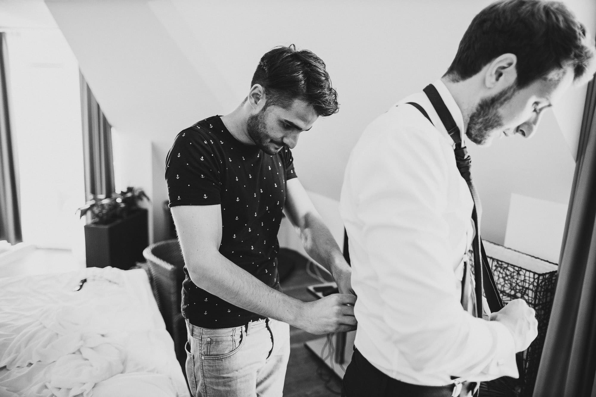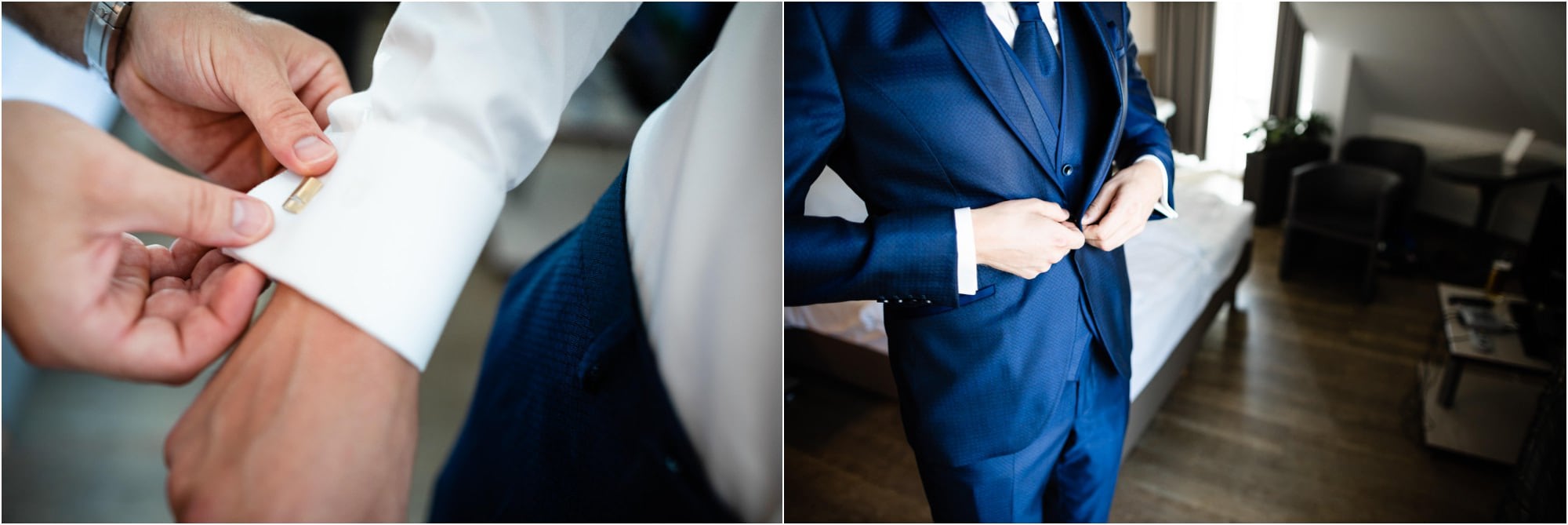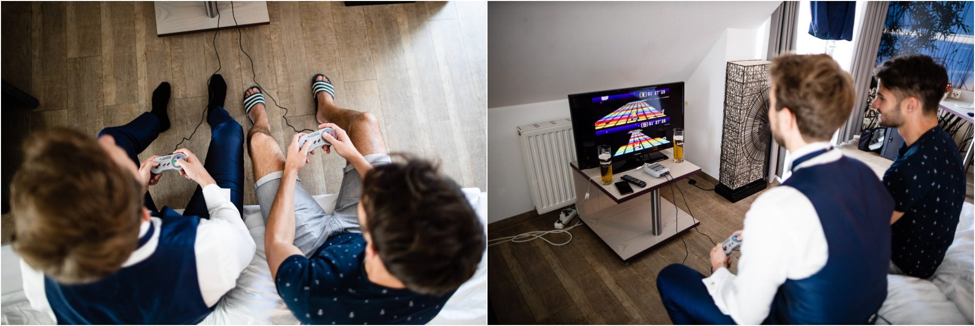 Nach dem Getting-Ready bei Nadine ging ich ein paar Hotelzimmertüren weiter und klopfte an die Zimmertüre in dem sich Stefan fertig machte. Auch hier wurde ich mit einem sehr strahlendem und freudigem Ausdruck von seinem Bruder – der Trauzeuge – empfangen. Die beiden waren die Ruhe selbst und gönnten sich erst einmal ein kühles Blondes und eine Partie Mario Kart. Da die Zeit dann doch langsam knapp wurde, zog sich Stefan weiter an wobei ihm sein Bruder die Manschettenknöpfe anlegte und ihm in die Weste geholfen hat. Als Stefan fertig gestylt war, nahm er sich einige Minuten Zeit und las sein Gelübde nochmals durch. Nun ist er ready für seine Braut – es gab noch ein Handschlag mit seinem Bruder und dann ging er direkt los zum First Look.