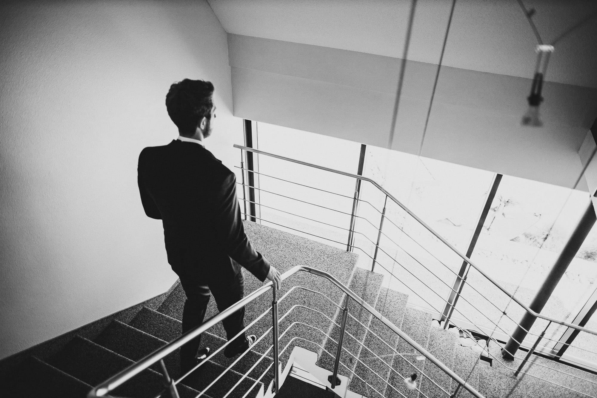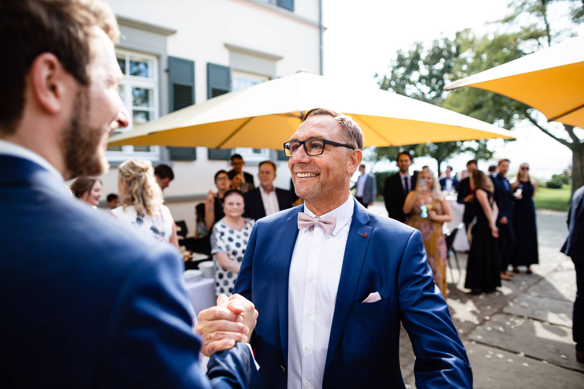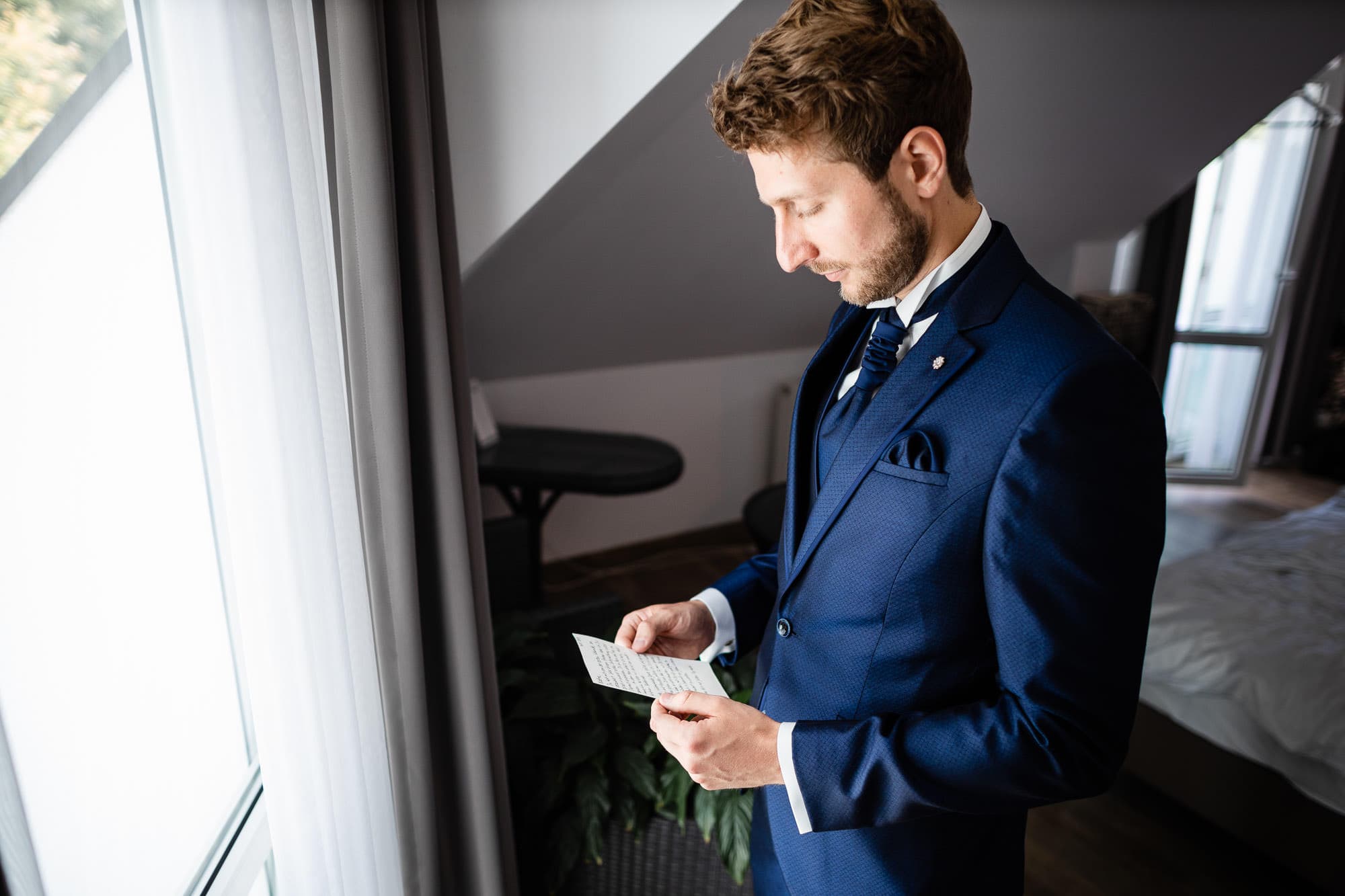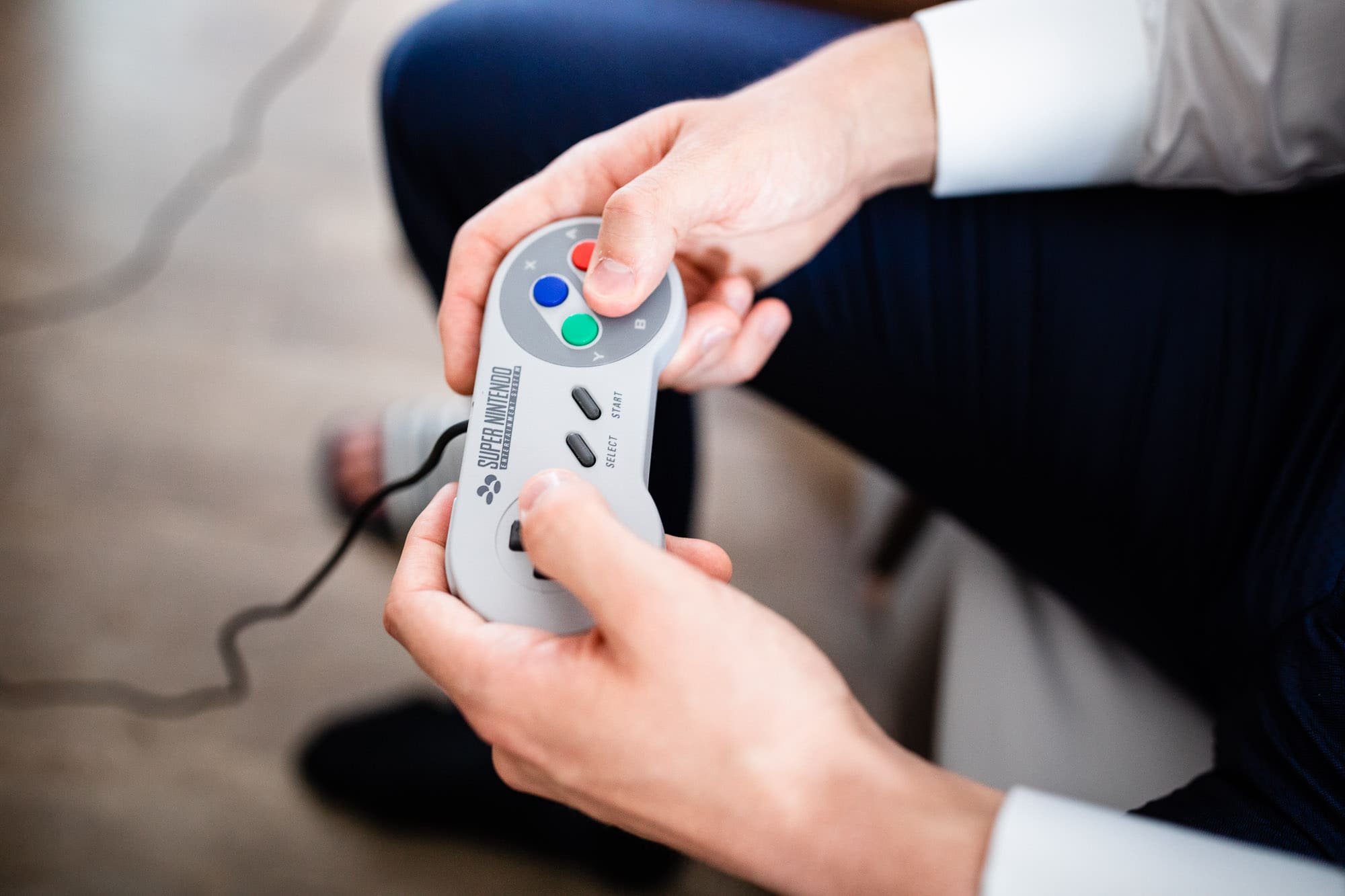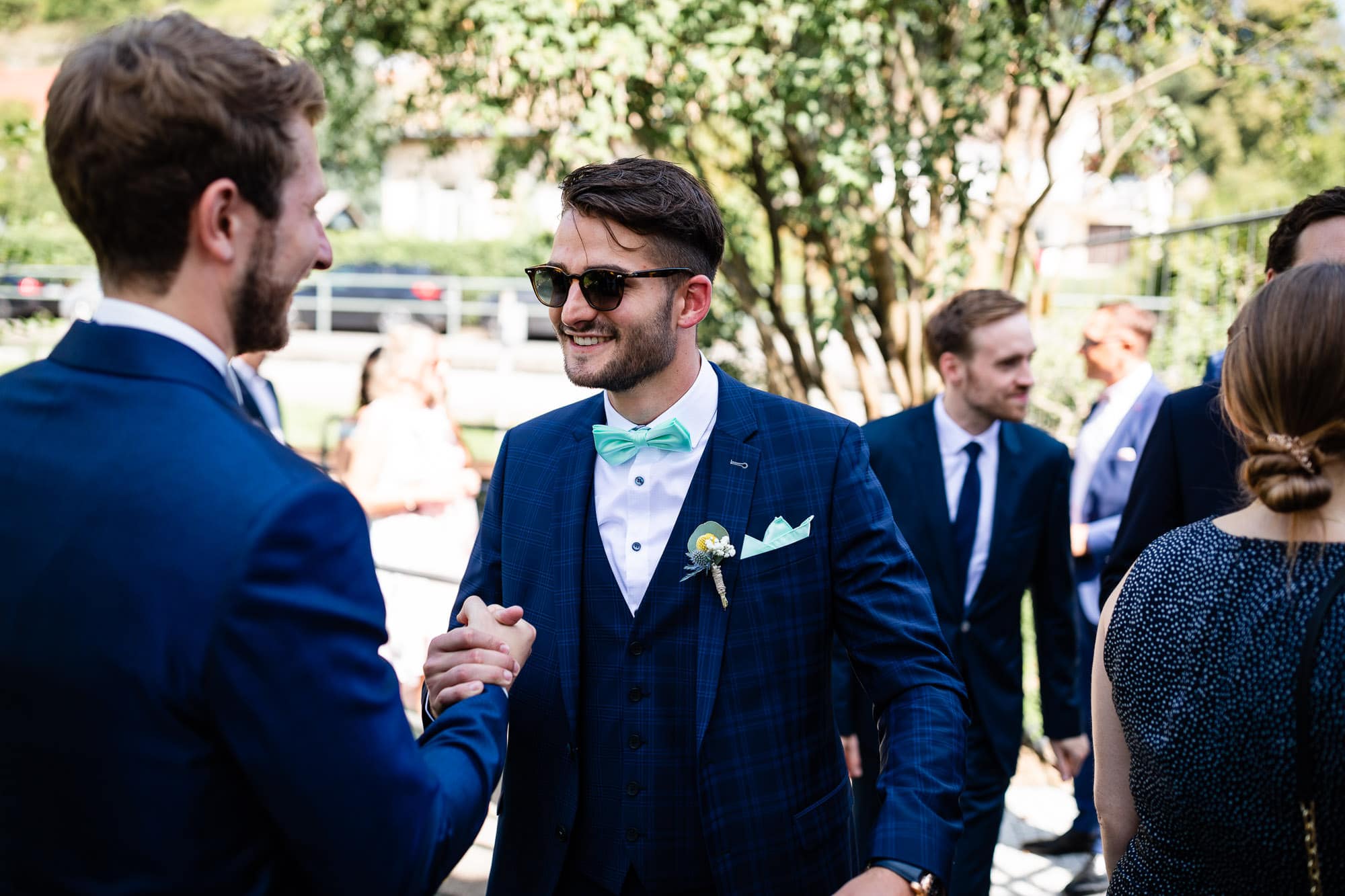 Nach dem Getting-Ready bei Nadine ging ich ein paar Hotelzimmertüren weiter und klopfte an die Zimmertüre in dem sich Stefan fertig machte. Auch hier wurde ich mit einem sehr strahlendem und freudigem Ausdruck von seinem Bruder – der Trauzeuge – empfangen. Die beiden waren die Ruhe selbst und gönnten sich erst einmal ein kühles Blondes und eine Partie Mario Kart. Da die Zeit dann doch langsam knapp wurde, zog sich Stefan weiter an wobei ihm sein Bruder die Manschettenknöpfe anlegte und ihm in die Weste geholfen hat. Als Stefan fertig gestylt war, nahm er sich einige Minuten Zeit und las sein Gelübde nochmals durch. Nun ist er ready für seine Braut – es gab noch ein Handschlag mit seinem Bruder und dann ging er direkt los zum First Look.