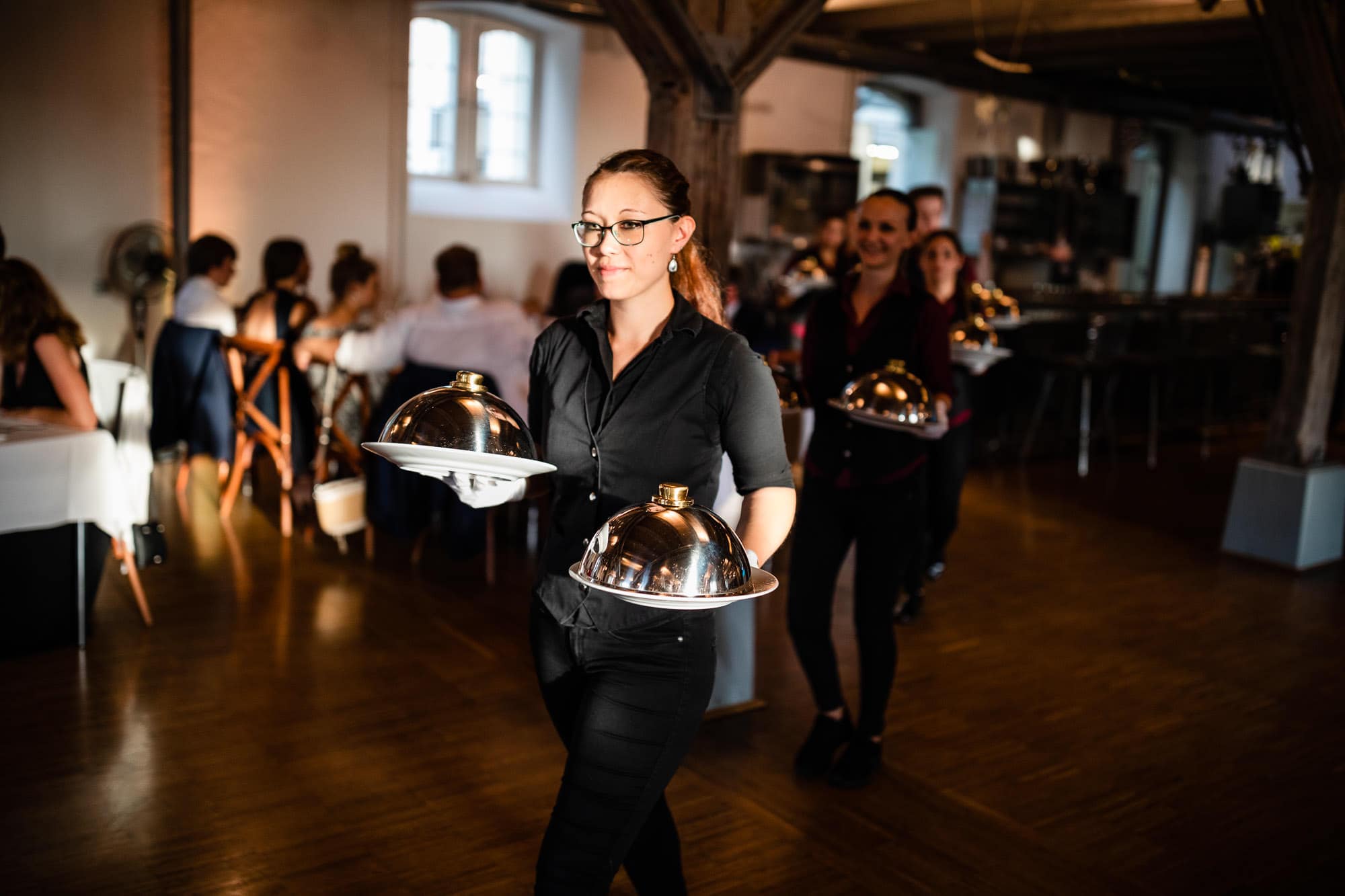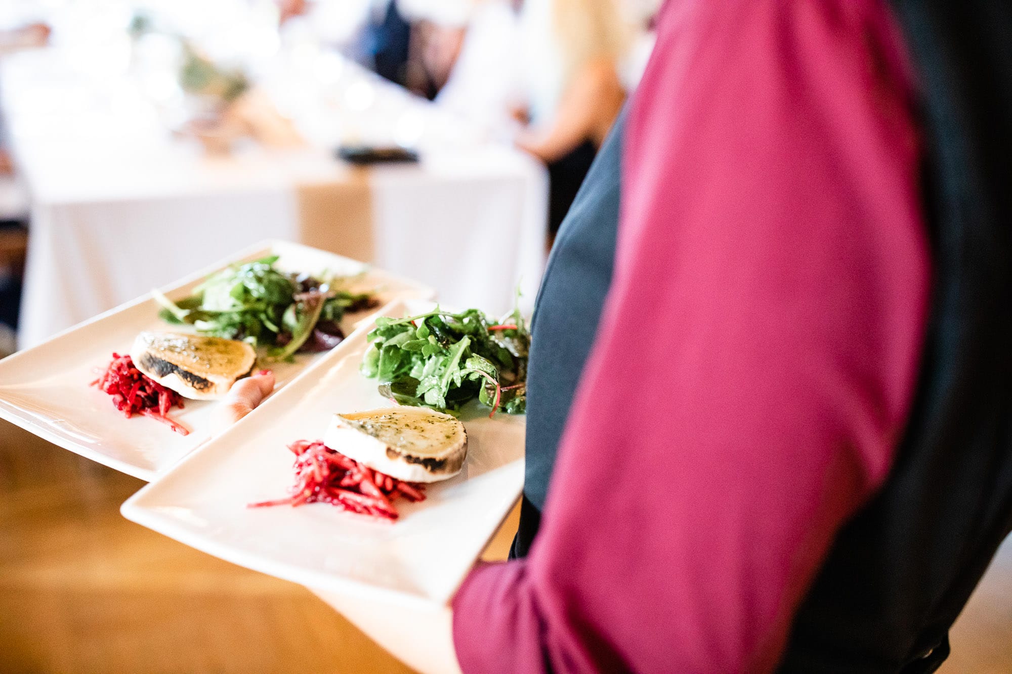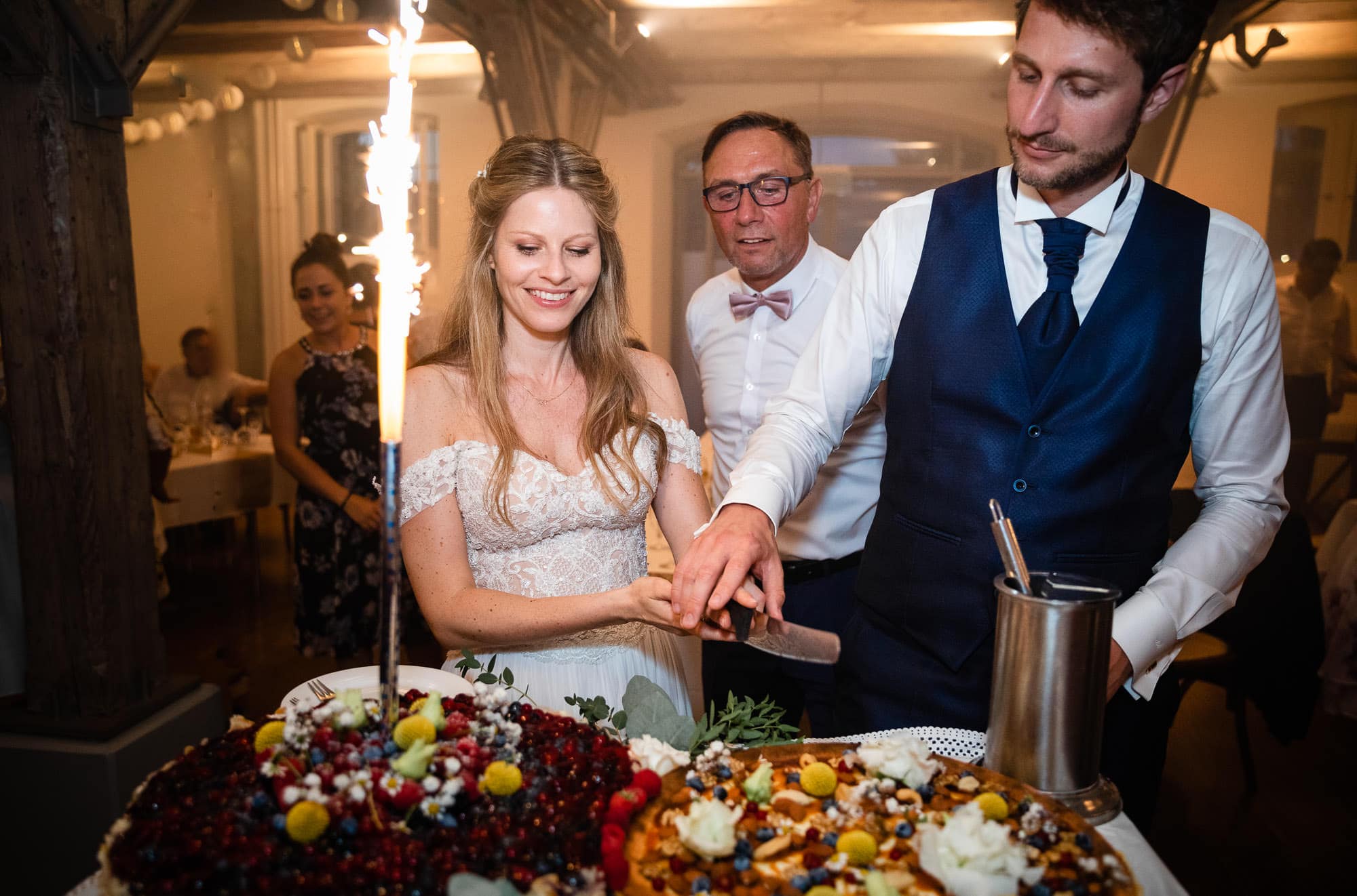 Was die Gäste nicht wussten, dass Nadine und Stefan nicht alleine durch den Spalierweg laufen werden, sondern mit zwei voran laufenden Musikern – Die Musikband Echt Tirol. Als Nadine und Stefan mit Livemusik um die Ecke bogen, mit den zwei voran laufenden Musikern, grölten und applaudierten ihre Gäste. Die Stimmung war bereits zu diesem Zeitpunkt auf Hochtouren. Freudig und in bester Stimmung wurde dem Brautpaar gratuliert, während der Sekt und die Canapés vom Team des Zollhaus verteilt wurden. Nach der Gratulation ging es direkt mit dem Abendprogramm weiter. Nach dem Abendessen haben Nadine und Stefan im Kreise ihrer Liebsten und Applaus und Beifall ihre Hochzeitstorte angeschnitten – somit war das Dessertbuffet eröffnet.