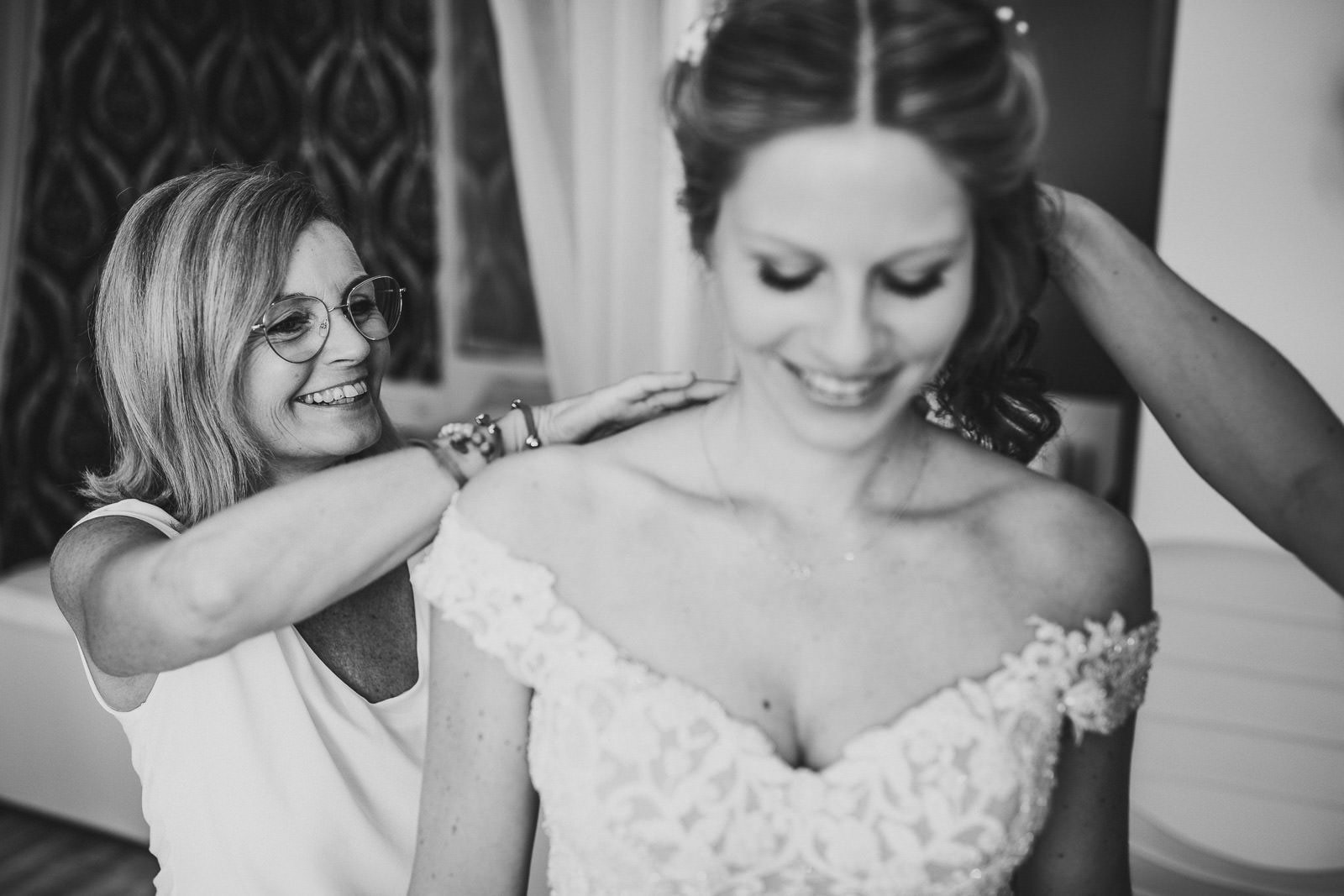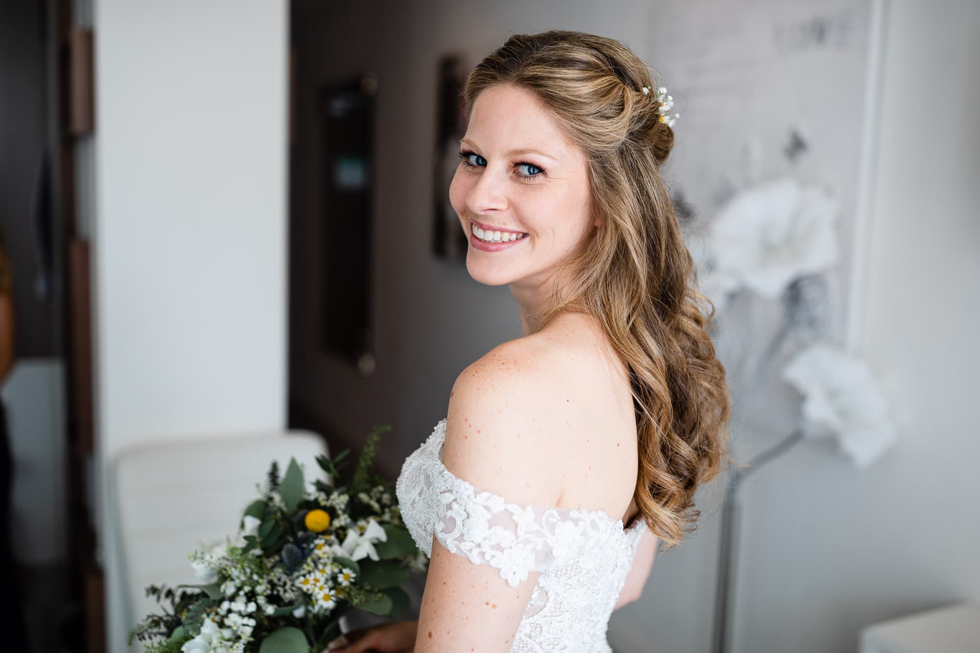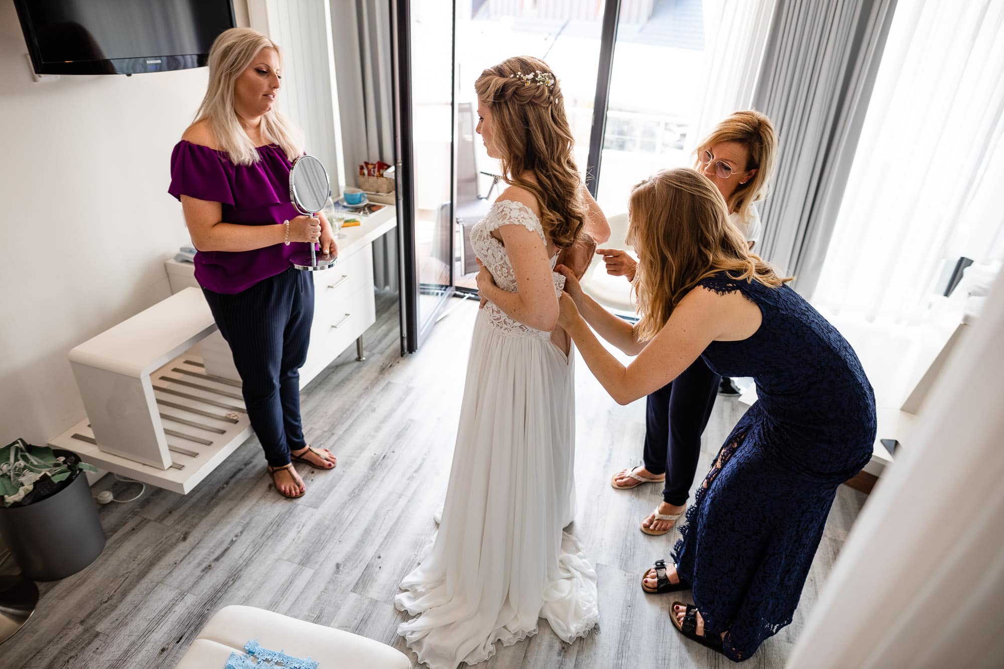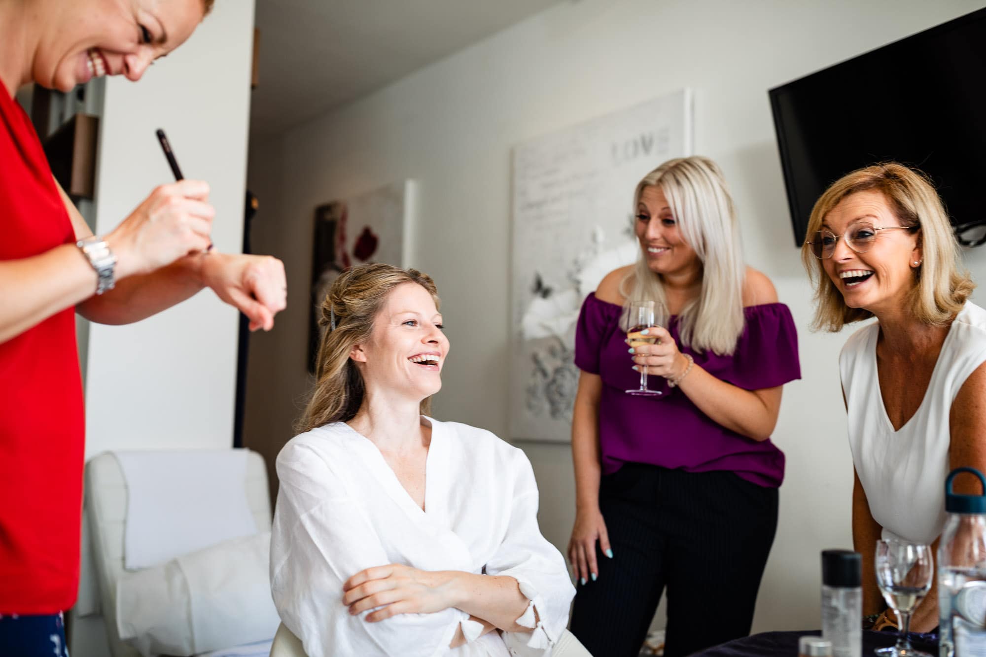 Für das Getting Ready wählten die beiden das sehr moderne und schicke Hotel – das Seehotel Adler in Ludwigshafen aus. Dies liegt direkt am traumhaften Ufer des Bodensees. Zudem ist die Feierlocation, das Zollhaus Ludwigshafen nur wenige Gehminuten vom Hotel entfernt – einfach eine perfekte Lage. Im Hotel angekommen ging ich direkt in das Stockwerk, in dem Nadine sich bereits für ihre Hochzeit vorbereitete. Das Seehotel Adler stellte Nadine eine helle und bezaubernde Hochzeitssuite zur Verfügung. Als die Brautfrisur sowie das Make-up vollendet waren, übergab die Brautmutter Nadine während einer rührenden Rede eine kleine weiße Schatulle – bekomme jetzt noch Gänsehaut, wenn ich an diesen emotionalen Moment zurückdenke. Unter Tränen und voller Rührung öffnete Nadine die Schatulle – in ihr lag eine sehr edle und schöne Armbanduhr. Alle Anwesenden halfen Nadine in ihr Brautkleid zu schlüpfen – wow, was für ein traumhaft schönes Brautkleid. Eins stand zu diesem Moment fest: Stefan konnte sich auf seine bezaubernde Braut mehr als freuen.