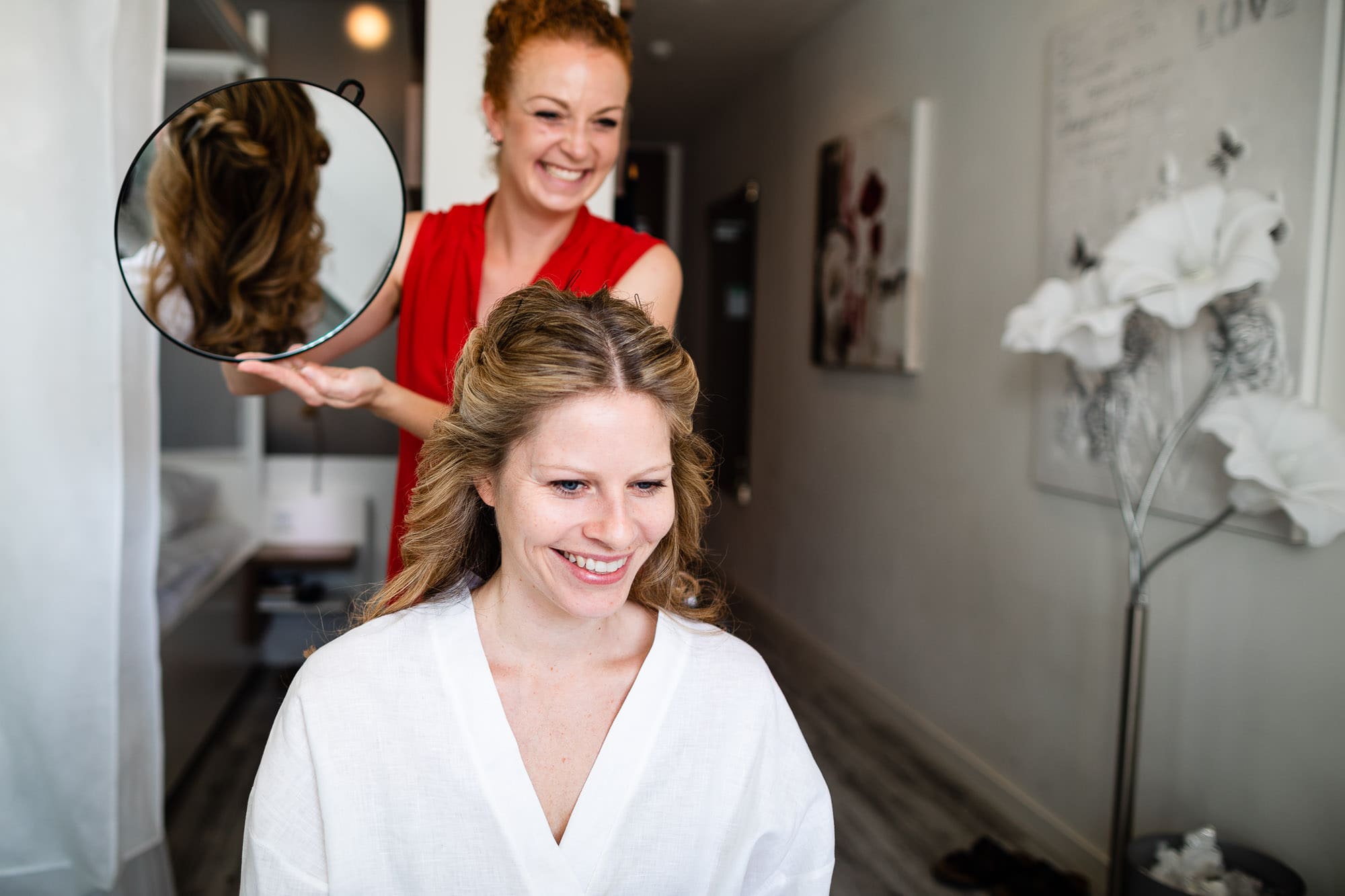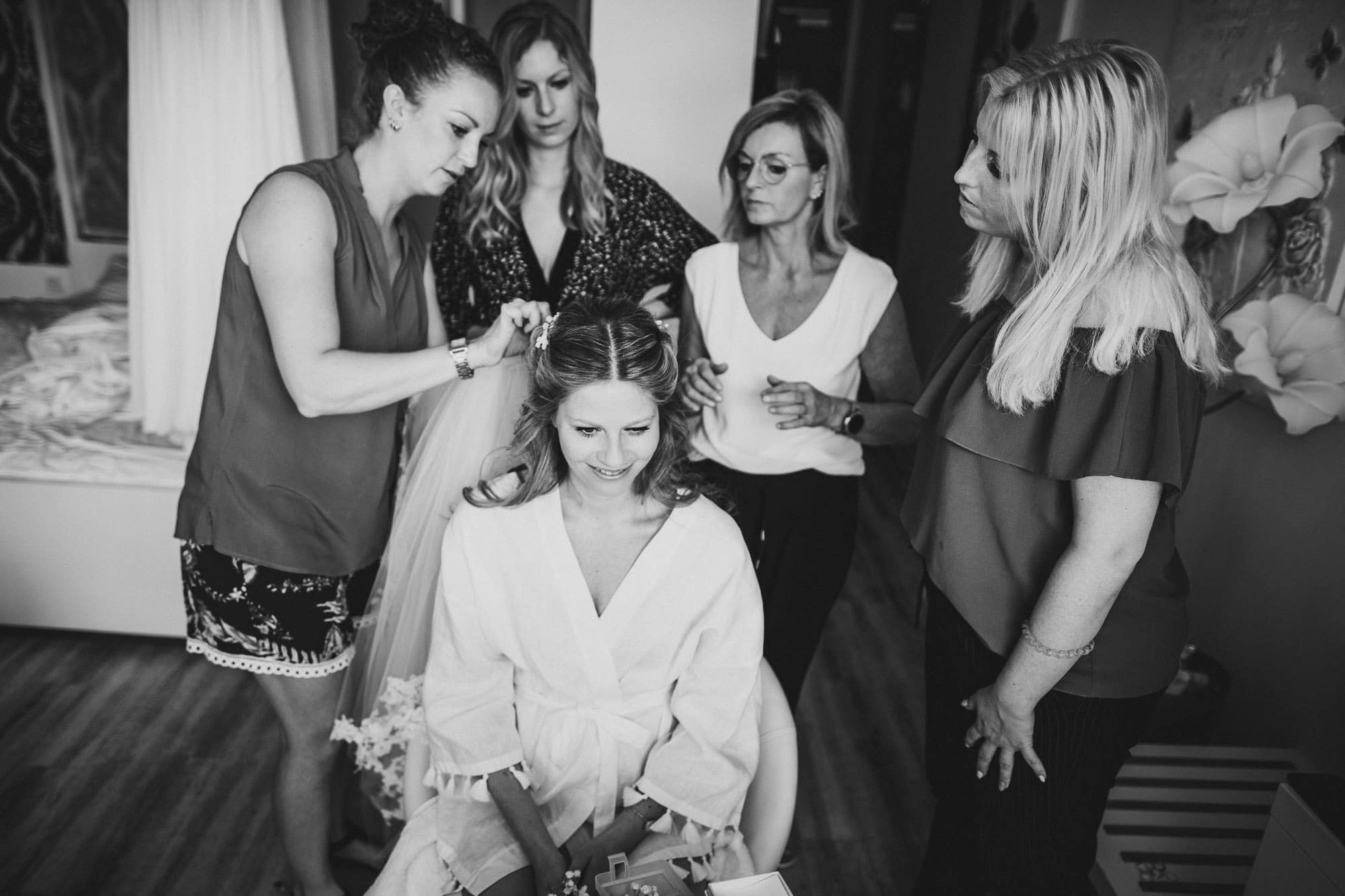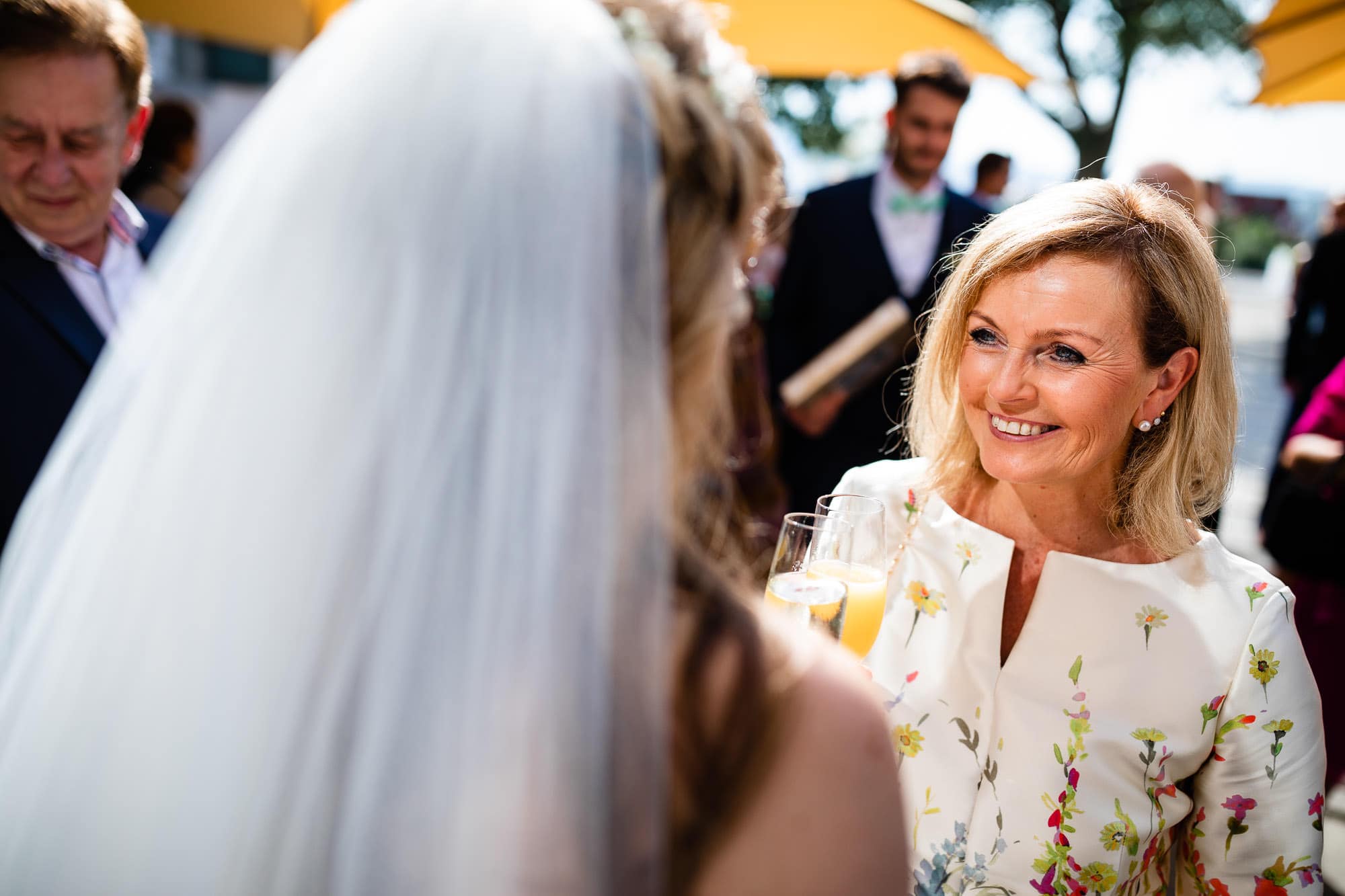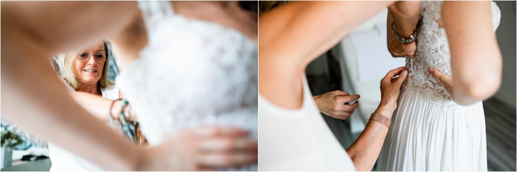 Für das Getting Ready wählten die beiden das sehr moderne und schicke Hotel – das Seehotel Adler in Ludwigshafen aus. Dies liegt direkt am traumhaften Ufer des Bodensees. Zudem ist die Feierlocation, das Zollhaus Ludwigshafen nur wenige Gehminuten vom Hotel entfernt – einfach eine perfekte Lage. Im Hotel angekommen ging ich direkt in das Stockwerk, in dem Nadine sich bereits für ihre Hochzeit vorbereitete. Das Seehotel Adler stellte Nadine eine helle und bezaubernde Hochzeitssuite zur Verfügung. Als die Brautfrisur sowie das Make-up vollendet waren, übergab die Brautmutter Nadine während einer rührenden Rede eine kleine weiße Schatulle – bekomme jetzt noch Gänsehaut, wenn ich an diesen emotionalen Moment zurückdenke. Unter Tränen und voller Rührung öffnete Nadine die Schatulle – in ihr lag eine sehr edle und schöne Armbanduhr. Alle Anwesenden halfen Nadine in ihr Brautkleid zu schlüpfen – wow, was für ein traumhaft schönes Brautkleid. Eins stand zu diesem Moment fest: Stefan konnte sich auf seine bezaubernde Braut mehr als freuen.