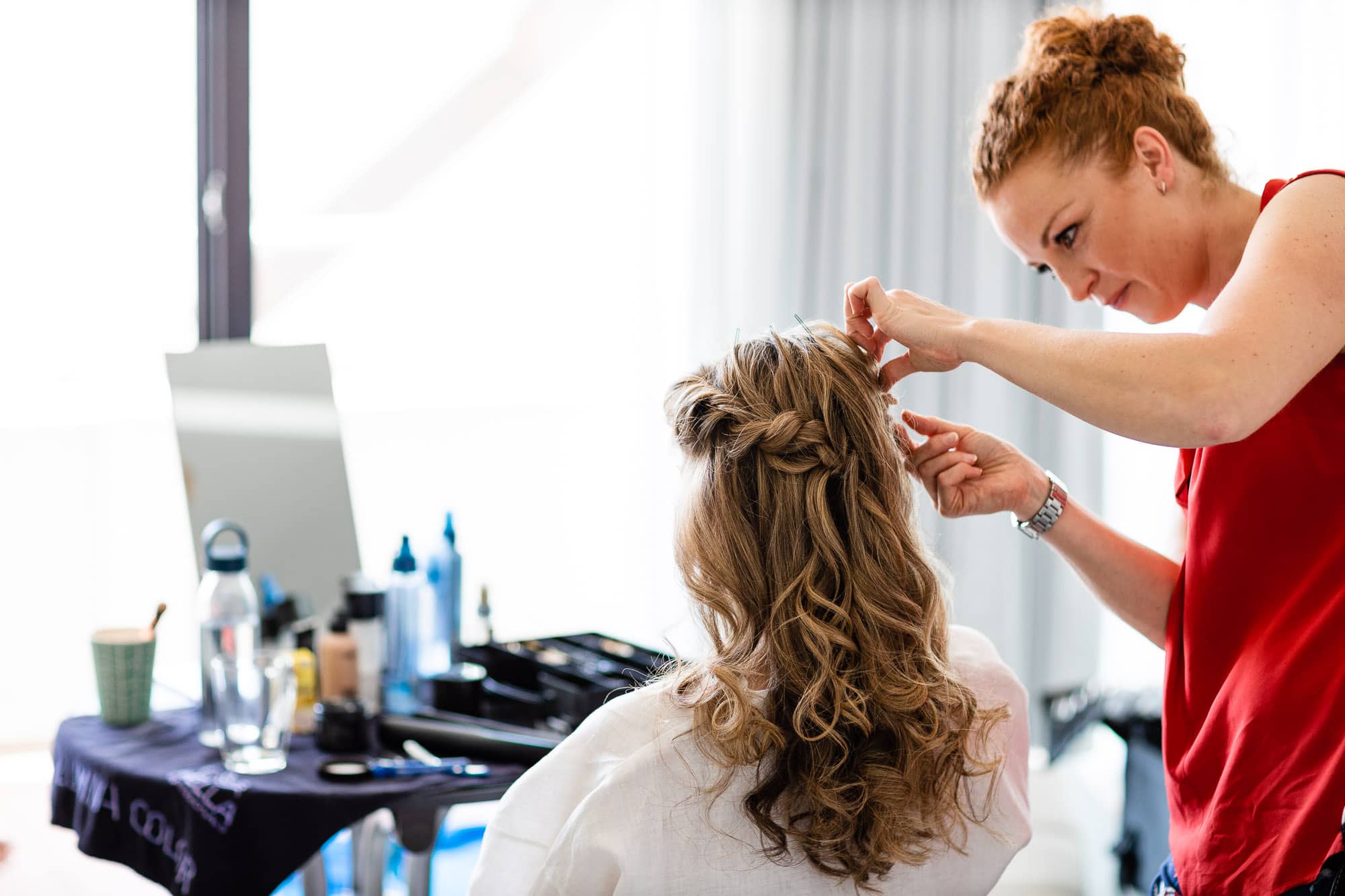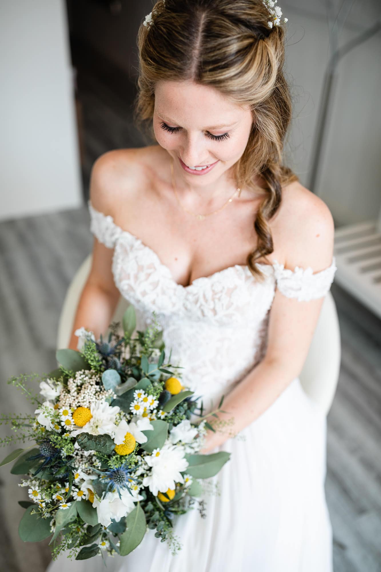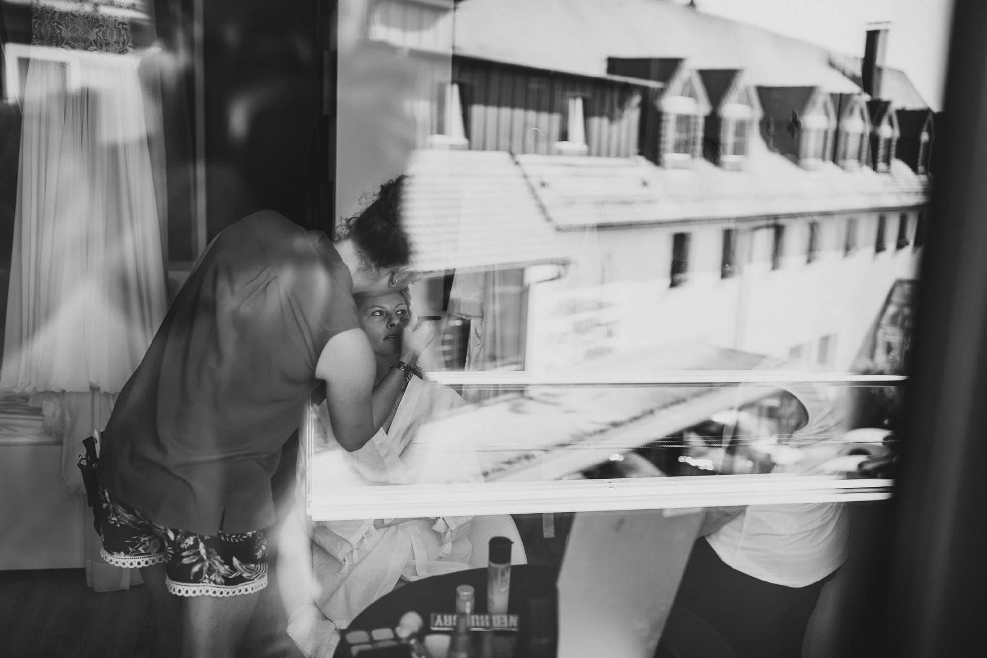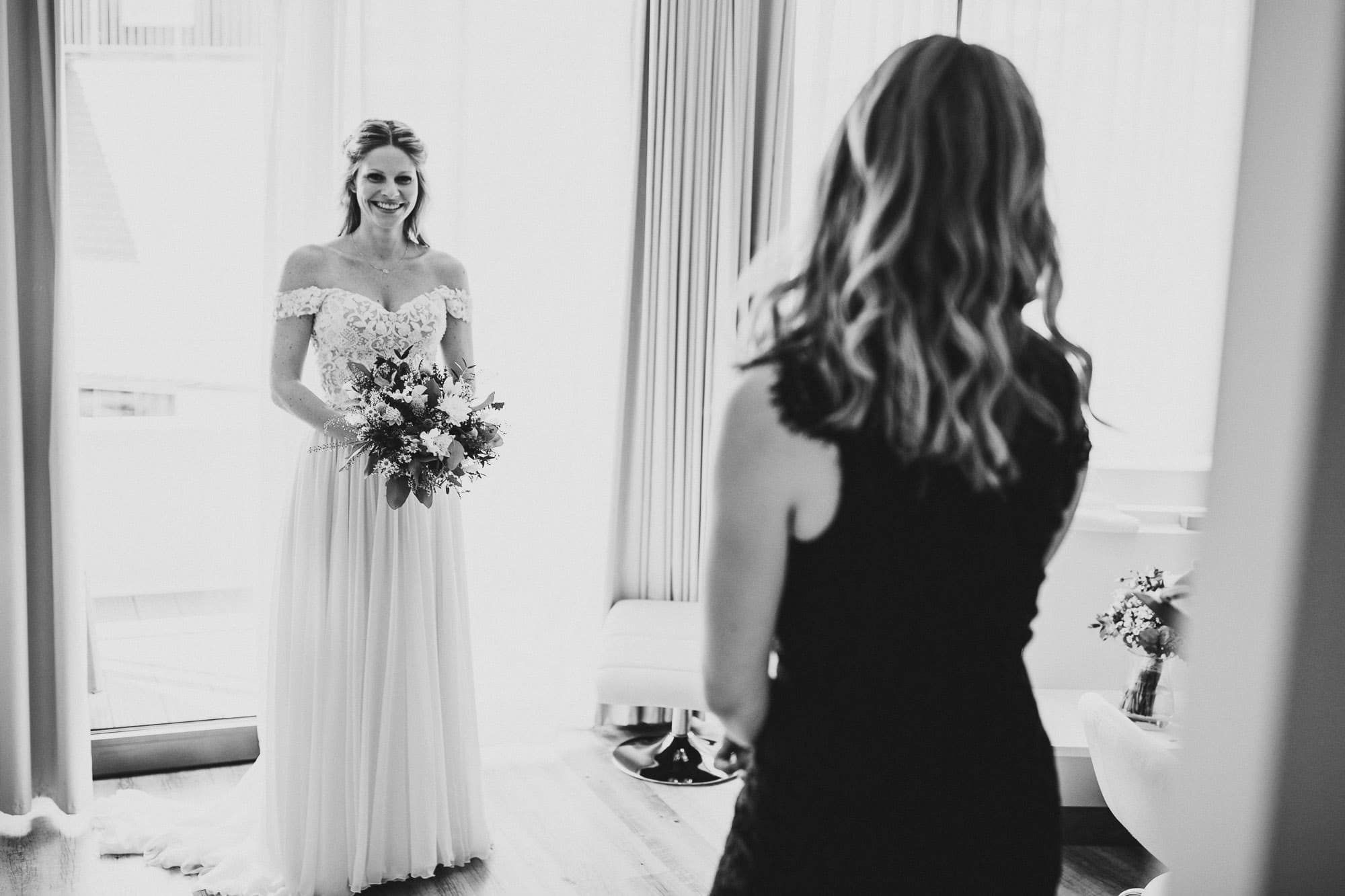 Für das Getting Ready wählten die beiden das sehr moderne und schicke Hotel – das Seehotel Adler in Ludwigshafen aus. Dies liegt direkt am traumhaften Ufer des Bodensees. Zudem ist die Feierlocation, das Zollhaus Ludwigshafen nur wenige Gehminuten vom Hotel entfernt – einfach eine perfekte Lage. Im Hotel angekommen ging ich direkt in das Stockwerk, in dem Nadine sich bereits für ihre Hochzeit vorbereitete. Das Seehotel Adler stellte Nadine eine helle und bezaubernde Hochzeitssuite zur Verfügung. Als die Brautfrisur sowie das Make-up vollendet waren, übergab die Brautmutter Nadine während einer rührenden Rede eine kleine weiße Schatulle – bekomme jetzt noch Gänsehaut, wenn ich an diesen emotionalen Moment zurückdenke. Unter Tränen und voller Rührung öffnete Nadine die Schatulle – in ihr lag eine sehr edle und schöne Armbanduhr. Alle Anwesenden halfen Nadine in ihr Brautkleid zu schlüpfen – wow, was für ein traumhaft schönes Brautkleid. Eins stand zu diesem Moment fest: Stefan konnte sich auf seine bezaubernde Braut mehr als freuen.