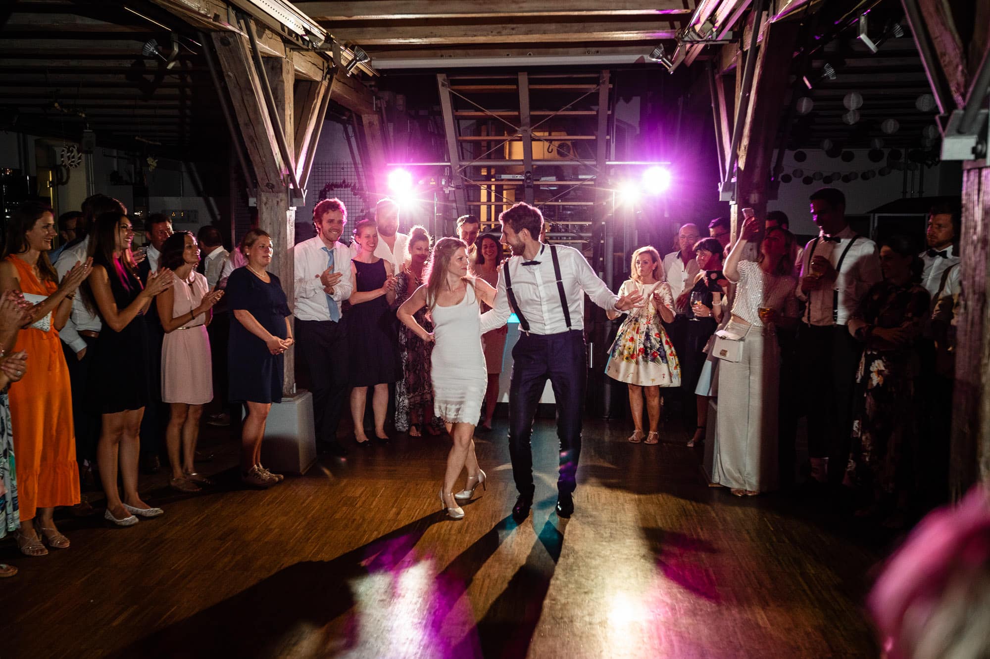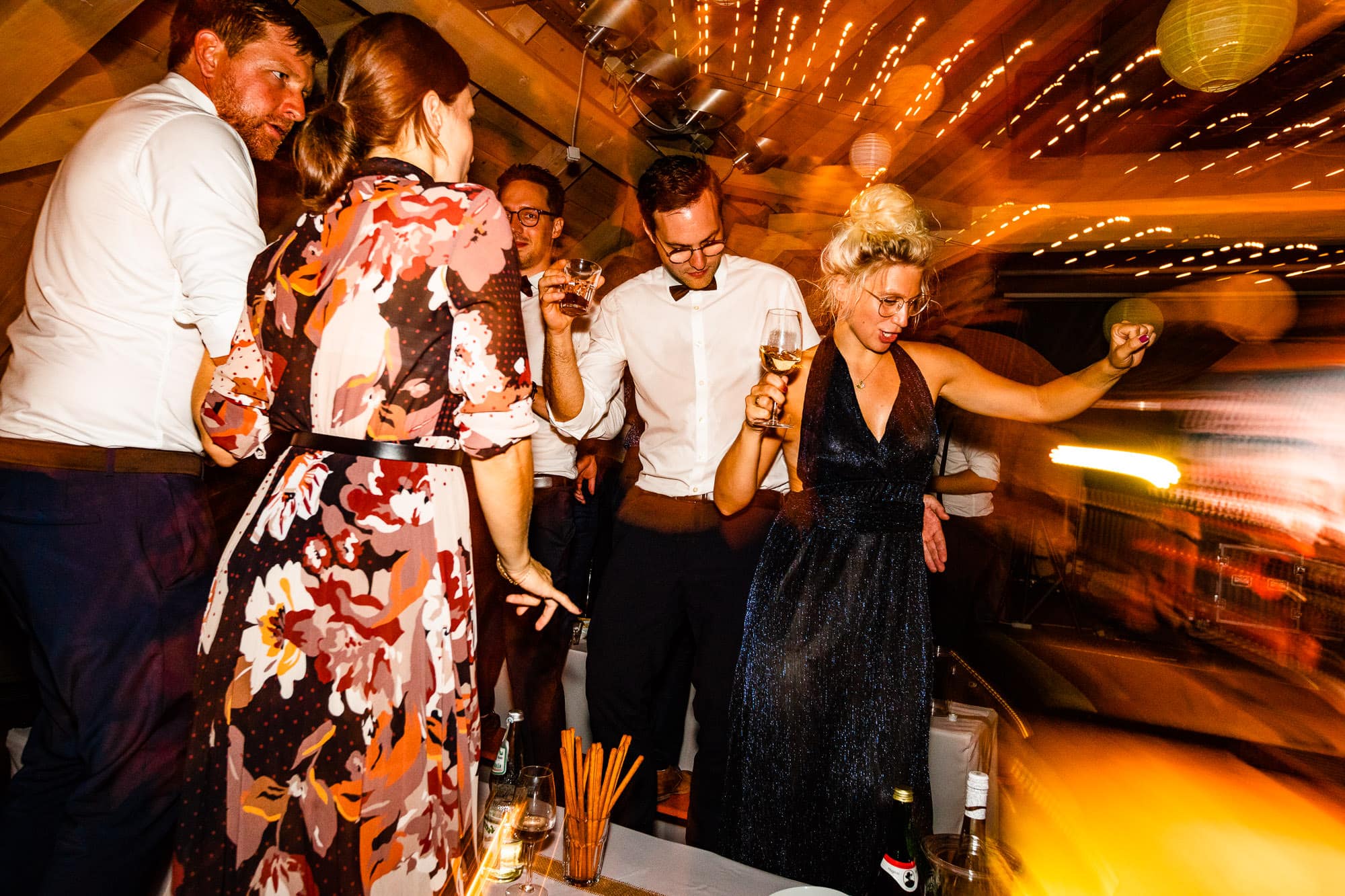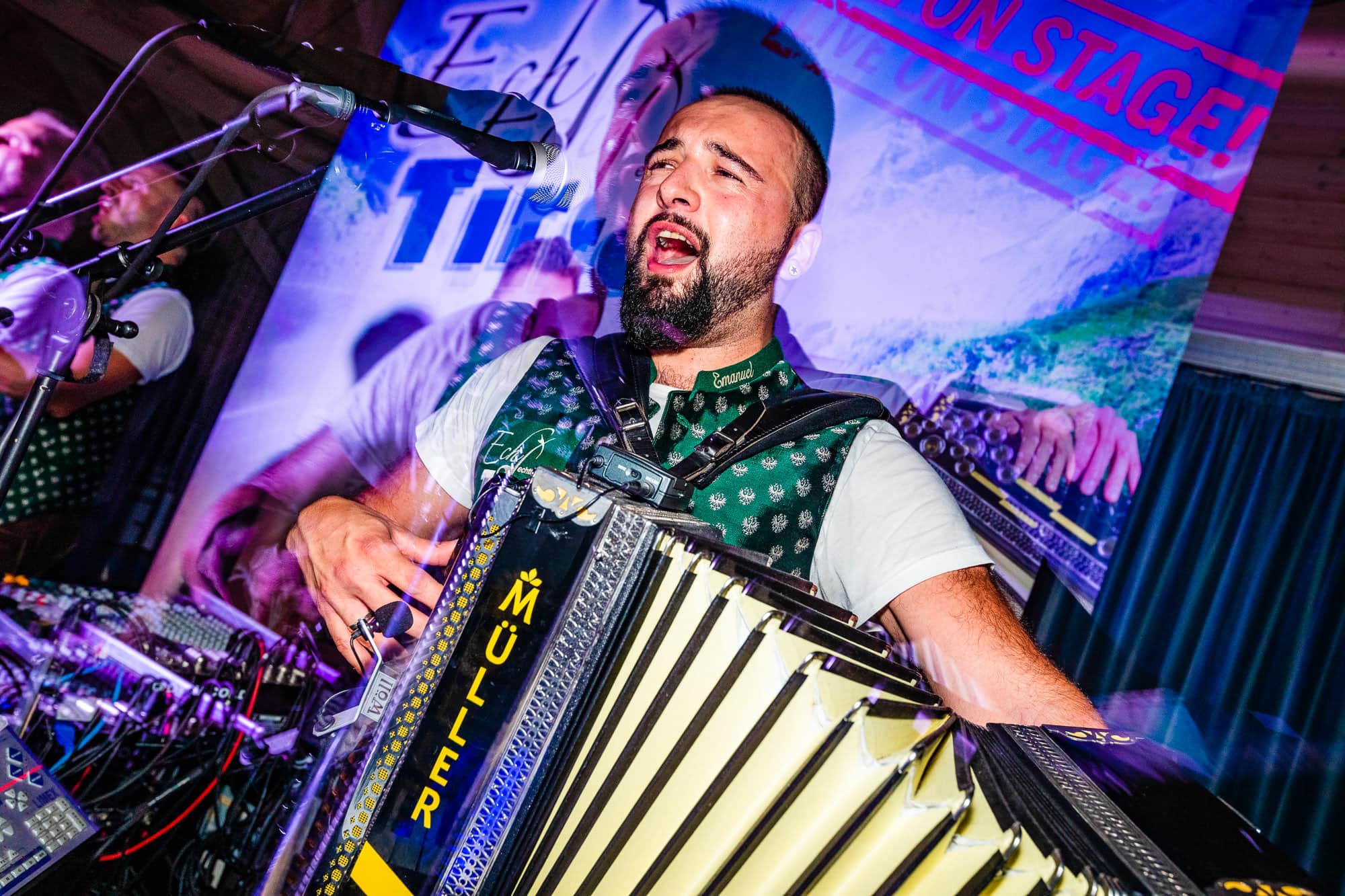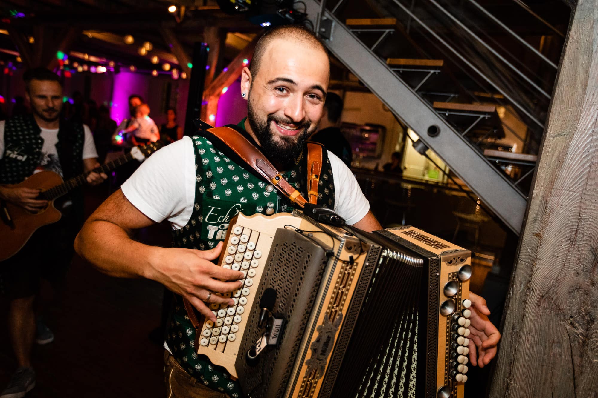 Kurze Zeit später ging es einen Stock höher, dort wartete bereits die Band „Echt Tirol“ auf seine Partygäste. Die Jungs wissen genau, wie sie die Stimmung ihrer Gäste von Null auf 100 aufheizen. Sie drehten direkt auf und wieder war die Stimmung im vollen Gange. Die stimmungsvolle Musik untermalte das Toben auf den Tischen und Bänken. Keiner der Gäste stand still – es ging auch nicht :) Die Musik war super gewählt und hat perfekt zum Ambiente gepasst. Die Feier nahm ihren Lauf. Etwas später luden Nadine und Stefan in das untere Stockwerk ein. Die Gäste stellten sich um das Brautpaar herum, während die Musik aus den Boxen ertönte und Nadine und Stefan ihren Hochzeitstanz vollzogen. Nach und nach zog das Brautpaar ihre Liebsten mit auf die Tanzfläche. Sie feierten weit in morgendlichen Stunden.