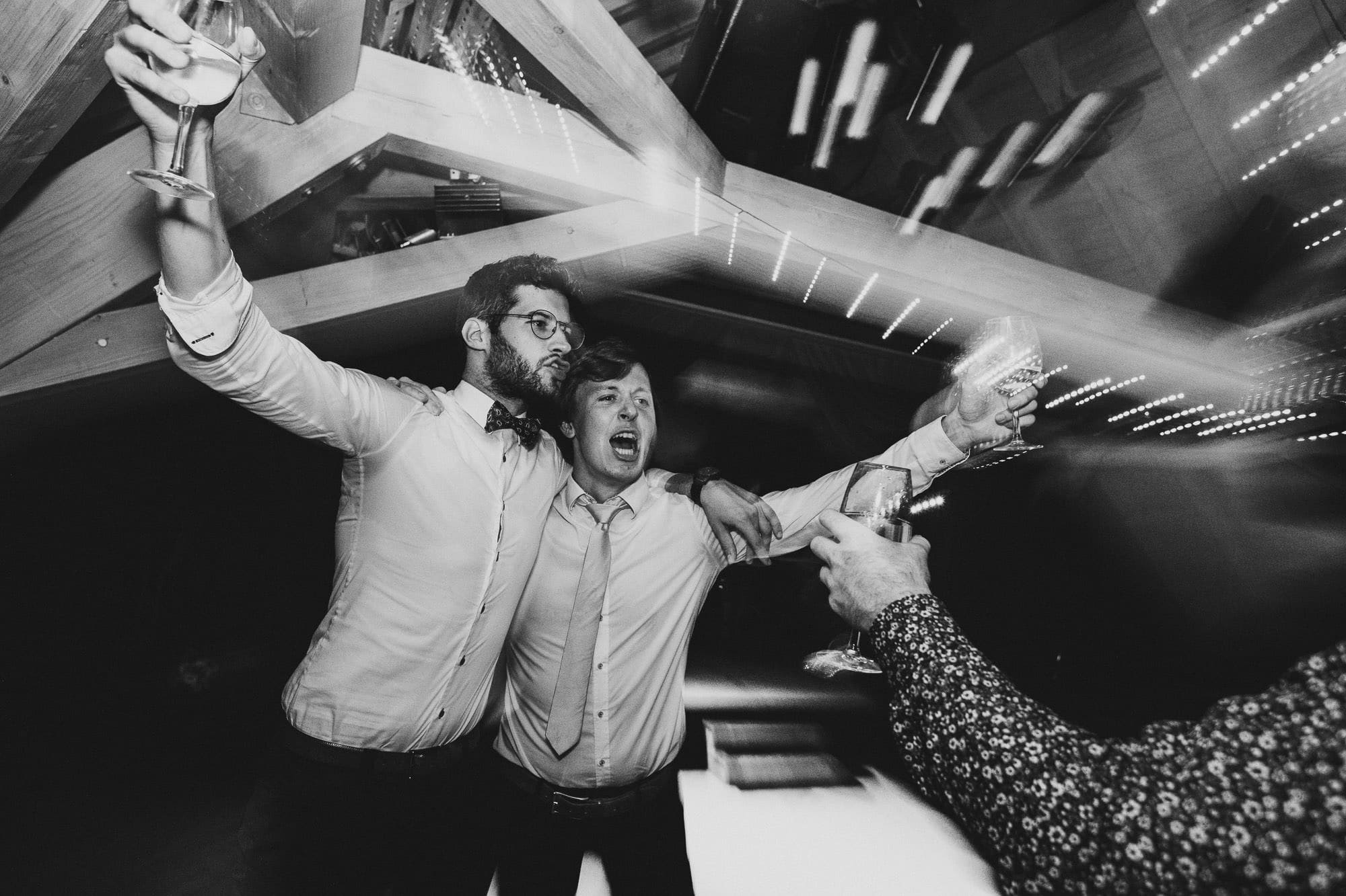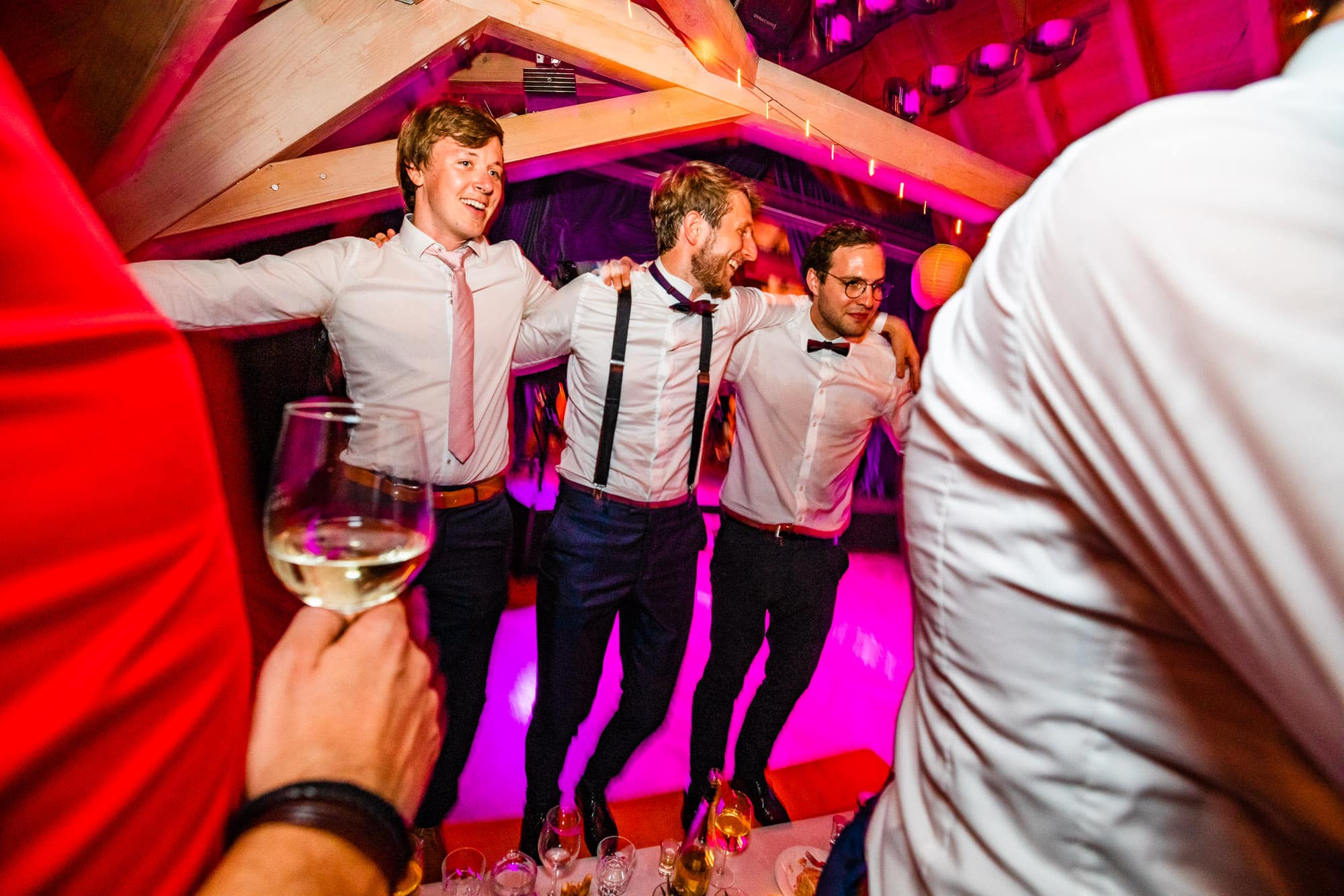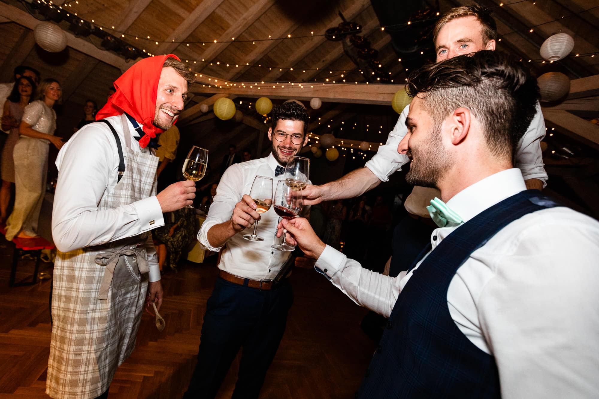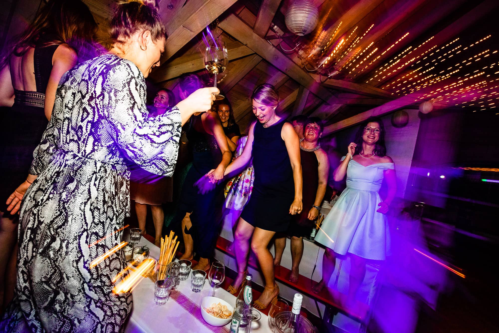 Kurze Zeit später ging es einen Stock höher, dort wartete bereits die Band „Echt Tirol“ auf seine Partygäste. Die Jungs wissen genau, wie sie die Stimmung ihrer Gäste von Null auf 100 aufheizen. Sie drehten direkt auf und wieder war die Stimmung im vollen Gange. Die stimmungsvolle Musik untermalte das Toben auf den Tischen und Bänken. Keiner der Gäste stand still – es ging auch nicht :) Die Musik war super gewählt und hat perfekt zum Ambiente gepasst. Die Feier nahm ihren Lauf. Etwas später luden Nadine und Stefan in das untere Stockwerk ein. Die Gäste stellten sich um das Brautpaar herum, während die Musik aus den Boxen ertönte und Nadine und Stefan ihren Hochzeitstanz vollzogen. Nach und nach zog das Brautpaar ihre Liebsten mit auf die Tanzfläche. Sie feierten weit in morgendlichen Stunden.
