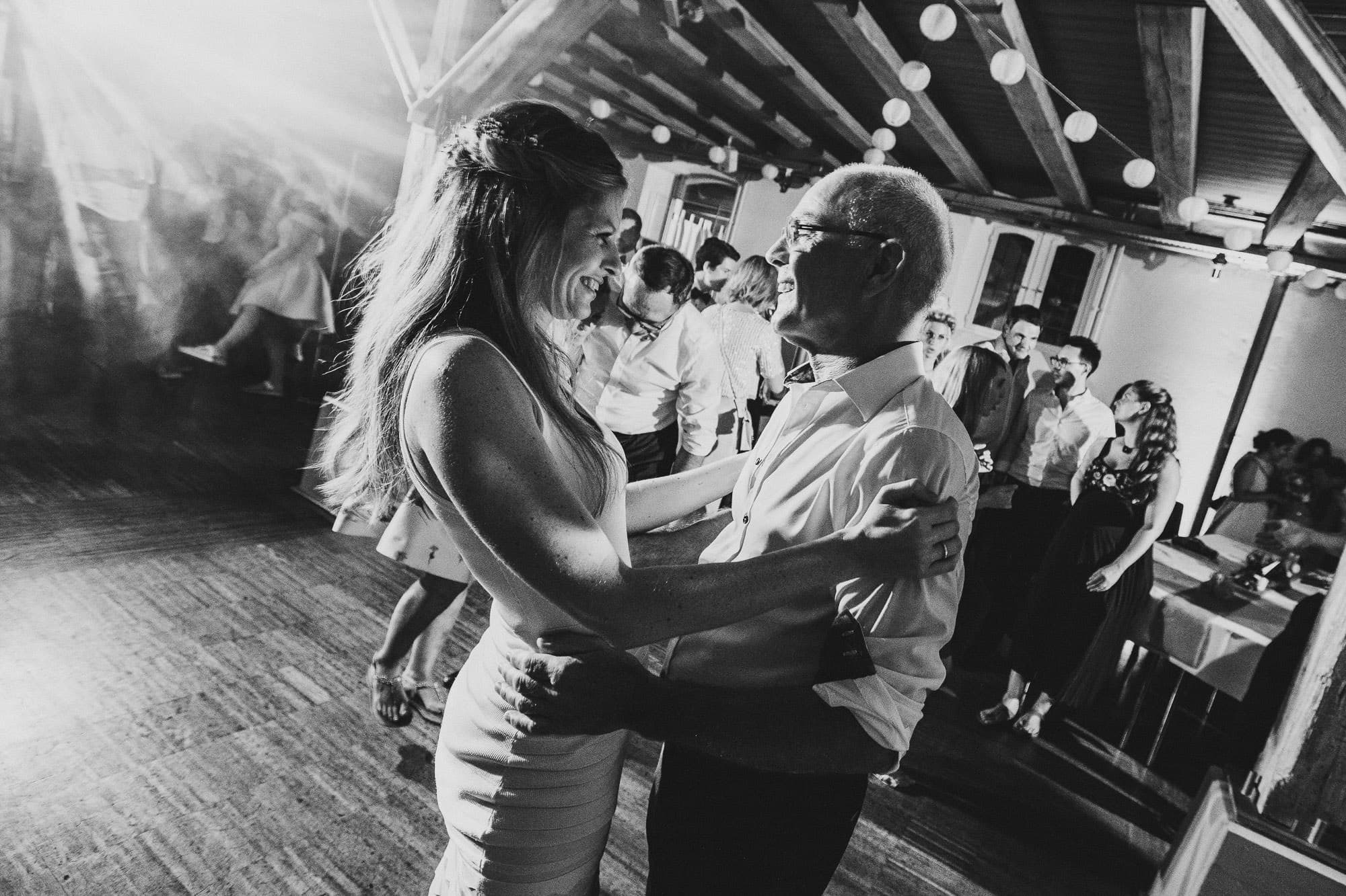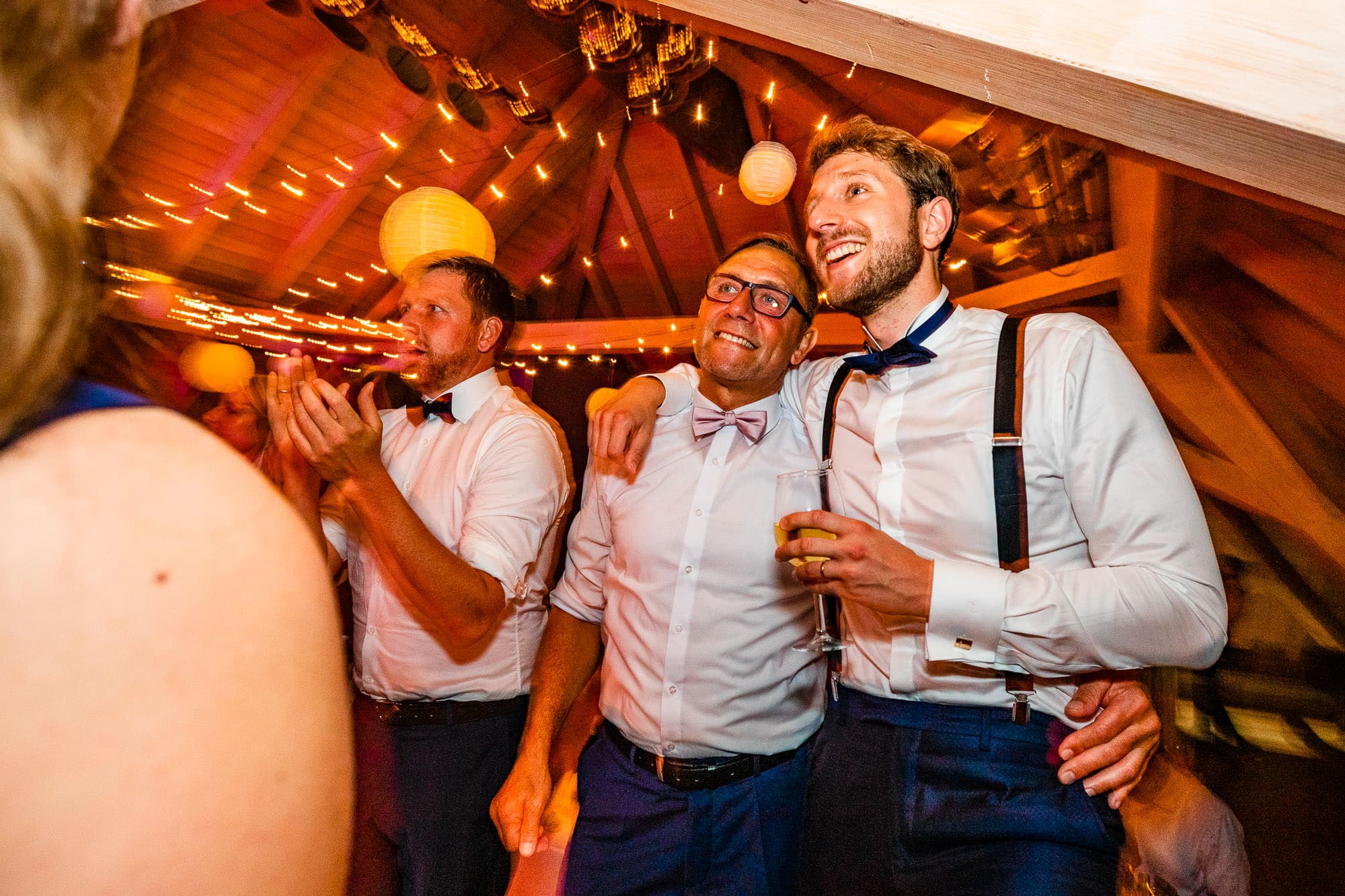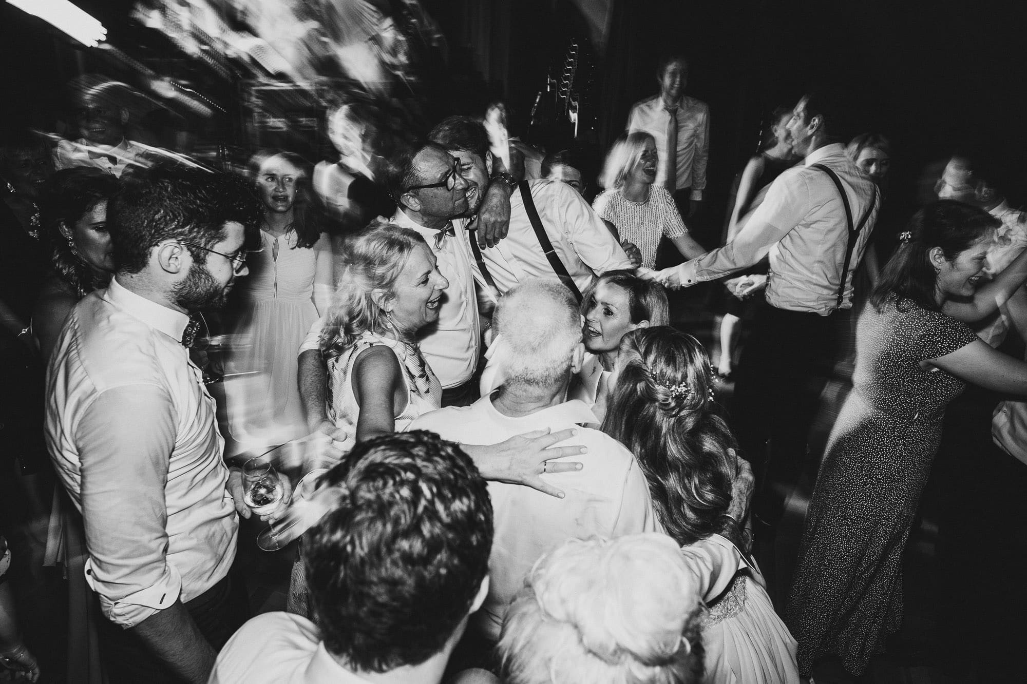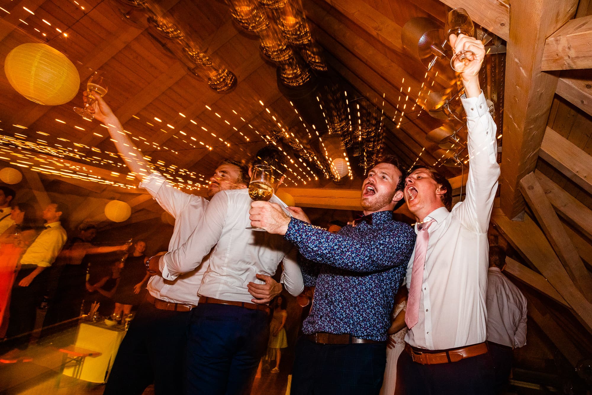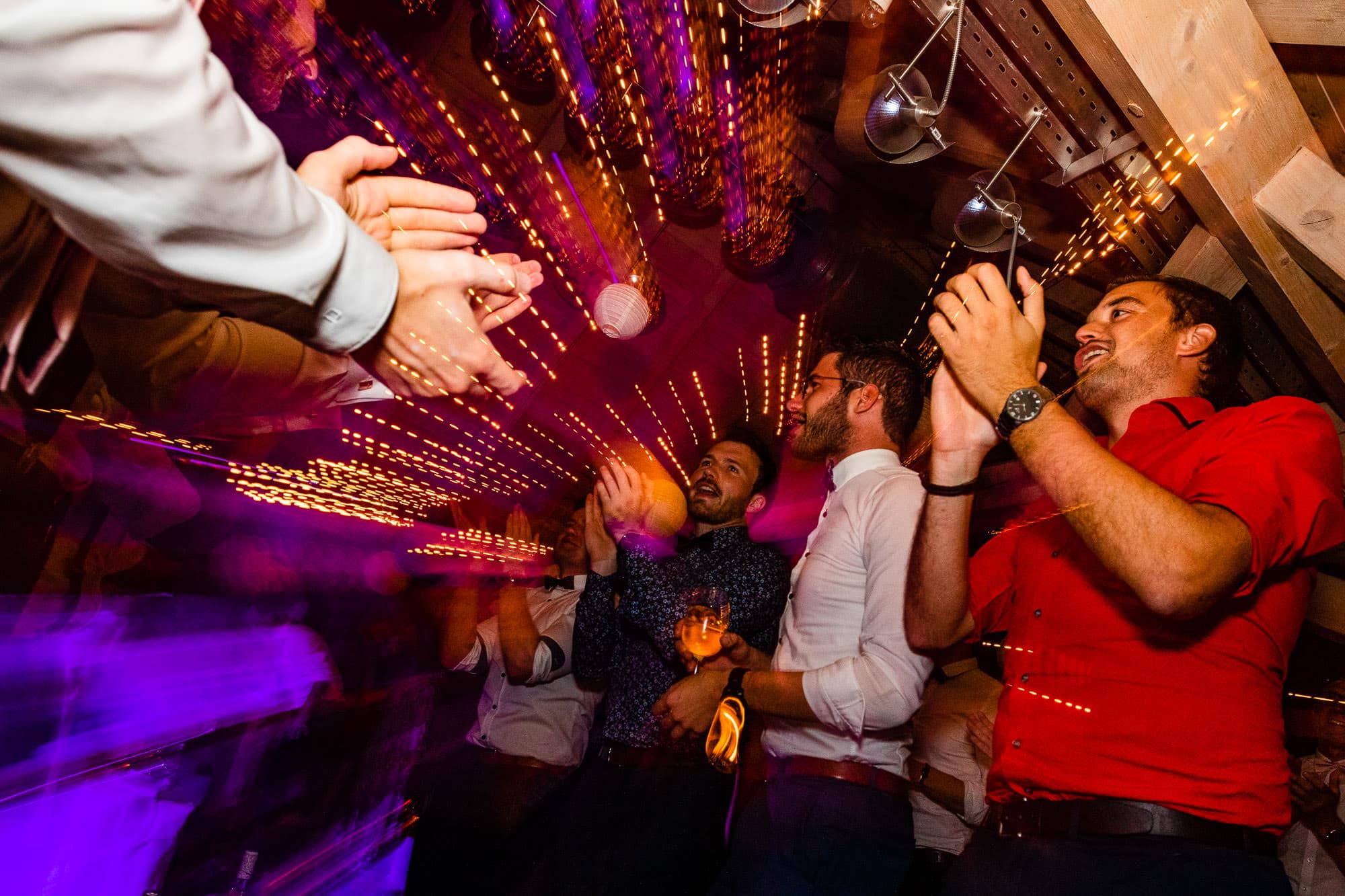 Kurze Zeit später ging es einen Stock höher, dort wartete bereits die Band „Echt Tirol“ auf seine Partygäste. Die Jungs wissen genau, wie sie die Stimmung ihrer Gäste von Null auf 100 aufheizen. Sie drehten direkt auf und wieder war die Stimmung im vollen Gange. Die stimmungsvolle Musik untermalte das Toben auf den Tischen und Bänken. Keiner der Gäste stand still – es ging auch nicht :) Die Musik war super gewählt und hat perfekt zum Ambiente gepasst. Die Feier nahm ihren Lauf. Etwas später luden Nadine und Stefan in das untere Stockwerk ein. Die Gäste stellten sich um das Brautpaar herum, während die Musik aus den Boxen ertönte und Nadine und Stefan ihren Hochzeitstanz vollzogen. Nach und nach zog das Brautpaar ihre Liebsten mit auf die Tanzfläche. Sie feierten weit in morgendlichen Stunden.