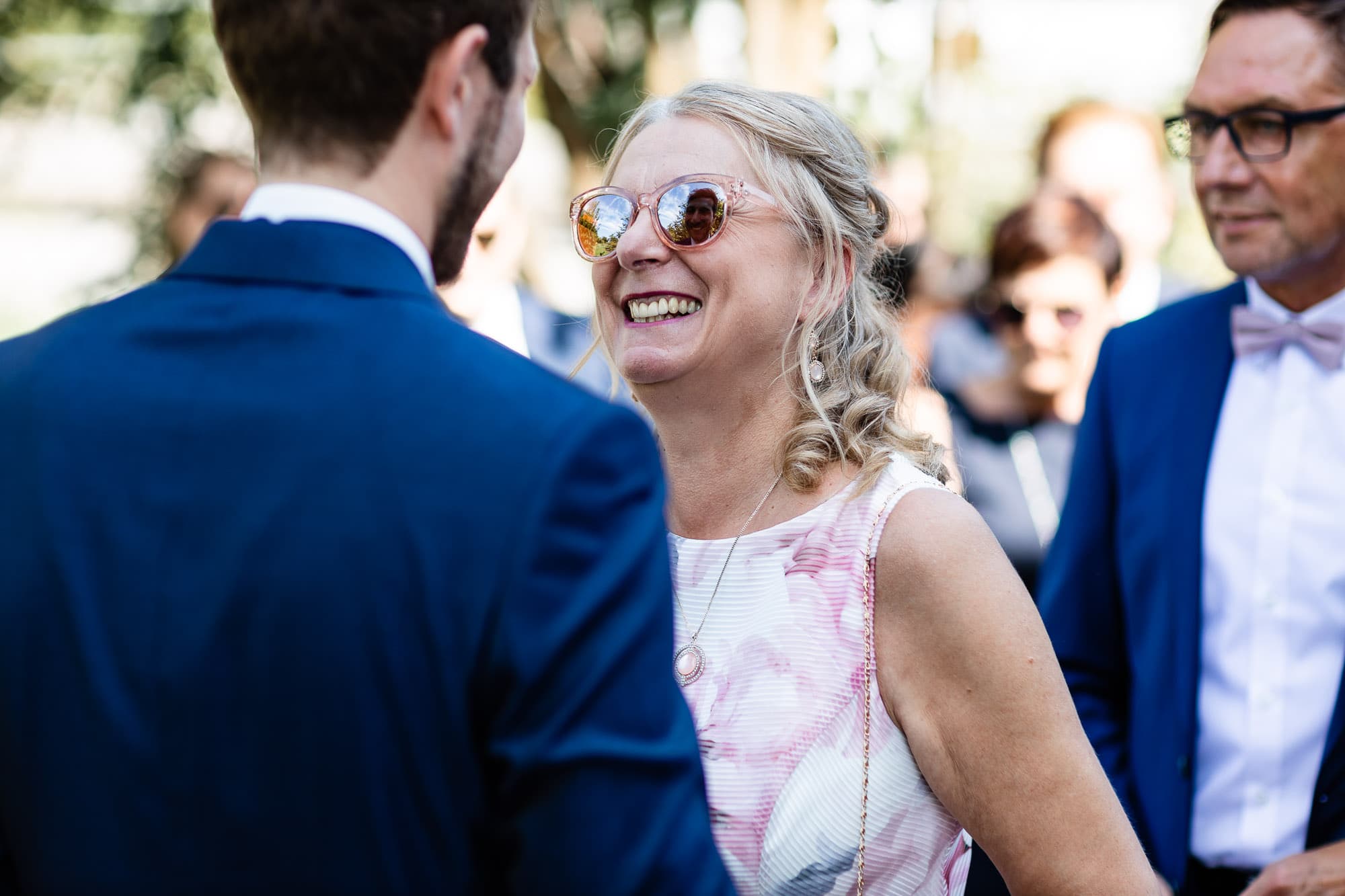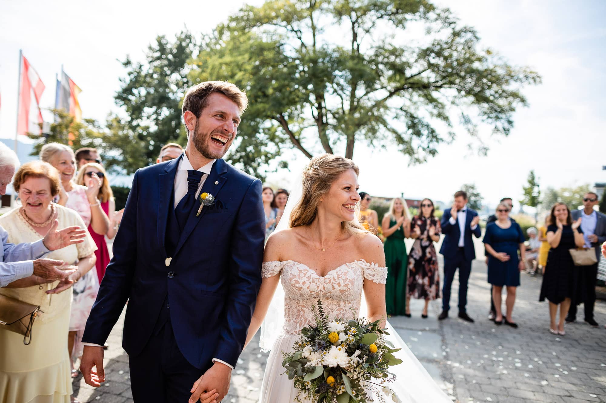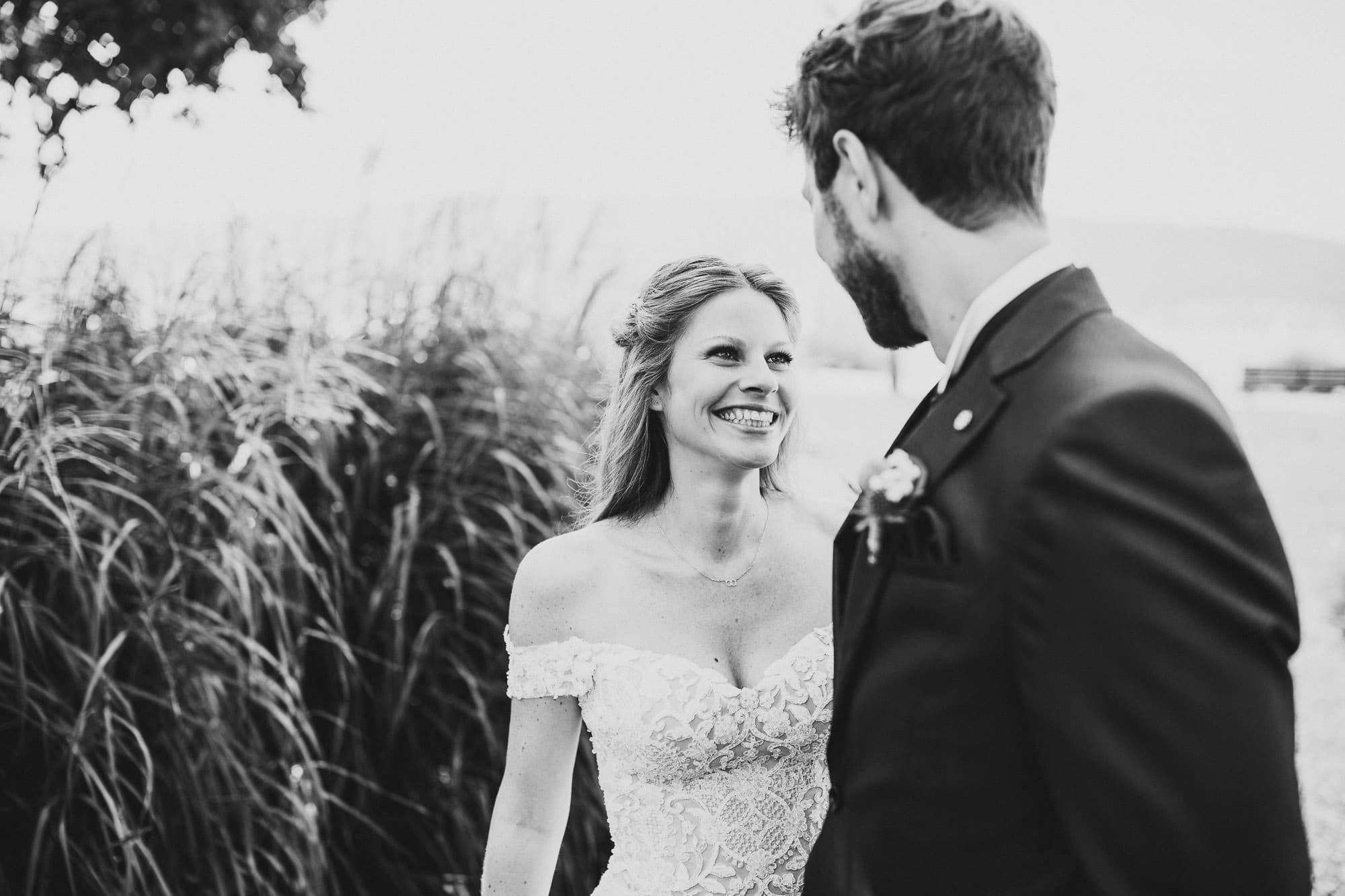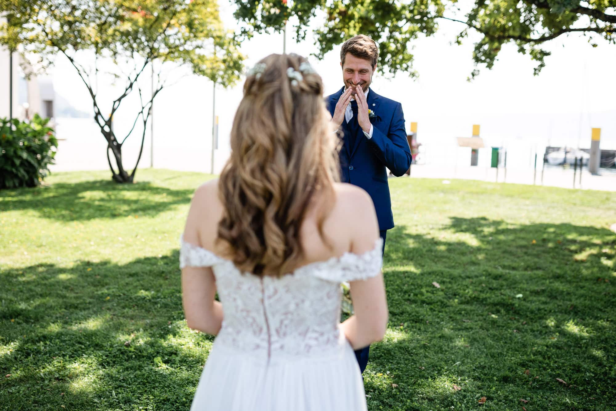 Die Anspannung war Stefan deutlich anzusehen, denn nun hieß es, dass er Nadine das erste Mal in ihrer Brautrobe sieht – was für ein knisternder, emotionaler und spannender Moment, ich liebe es :). Nadine ließ nicht lange auf sich warten. Die Sonne schmeichelte der Location und ließ um die beiden herum alles hell erstrahlen. Nun war der Moment, Nadine stand hinter ihrem Stefan – Stefan drehte sich um und die Zeit blieb für einen Moment stehen. Voller Erstaunen betrachtete Stefan seine Nadine – er nahm ihre Hand und Nadine drehte sich voller stolz vor ihm herum, um sich von allen Seiten zu zeigen. Es war unverkennbar, dass Stefan keinen Augenblick mehr seine Nadine aus den Augen ließ. Wir nutzen noch die Zeit vor der kirchlichen Trauung und nahmen wunderschöne Paarportraits in der Gartenanlage vor dem Zollhaus auf.