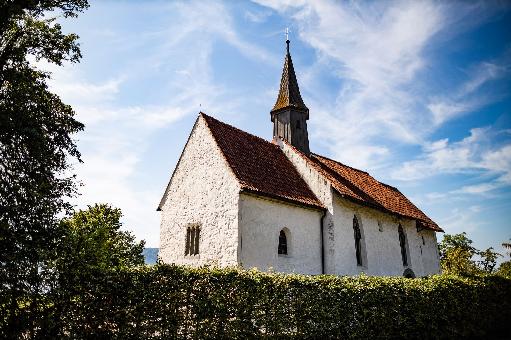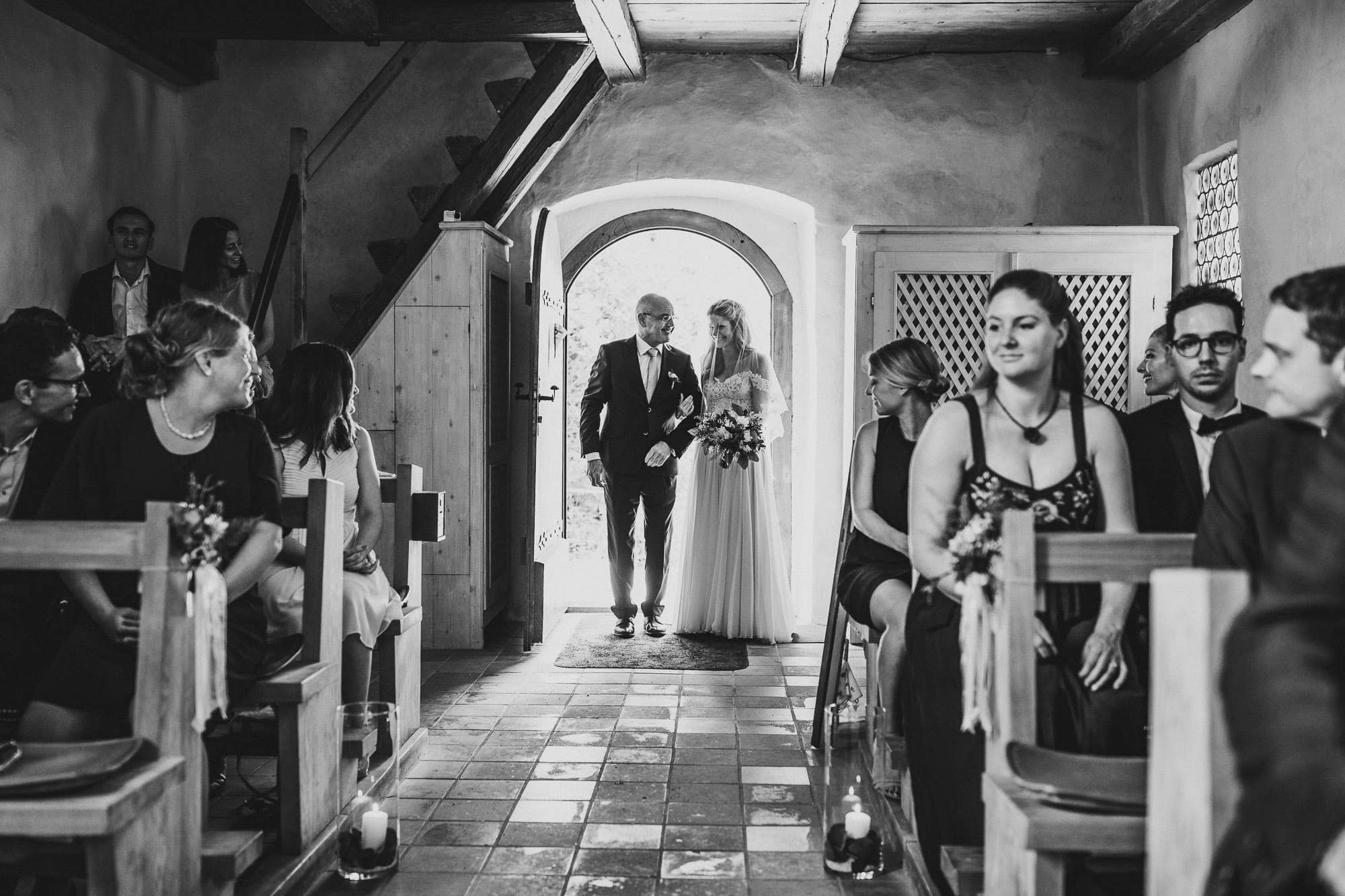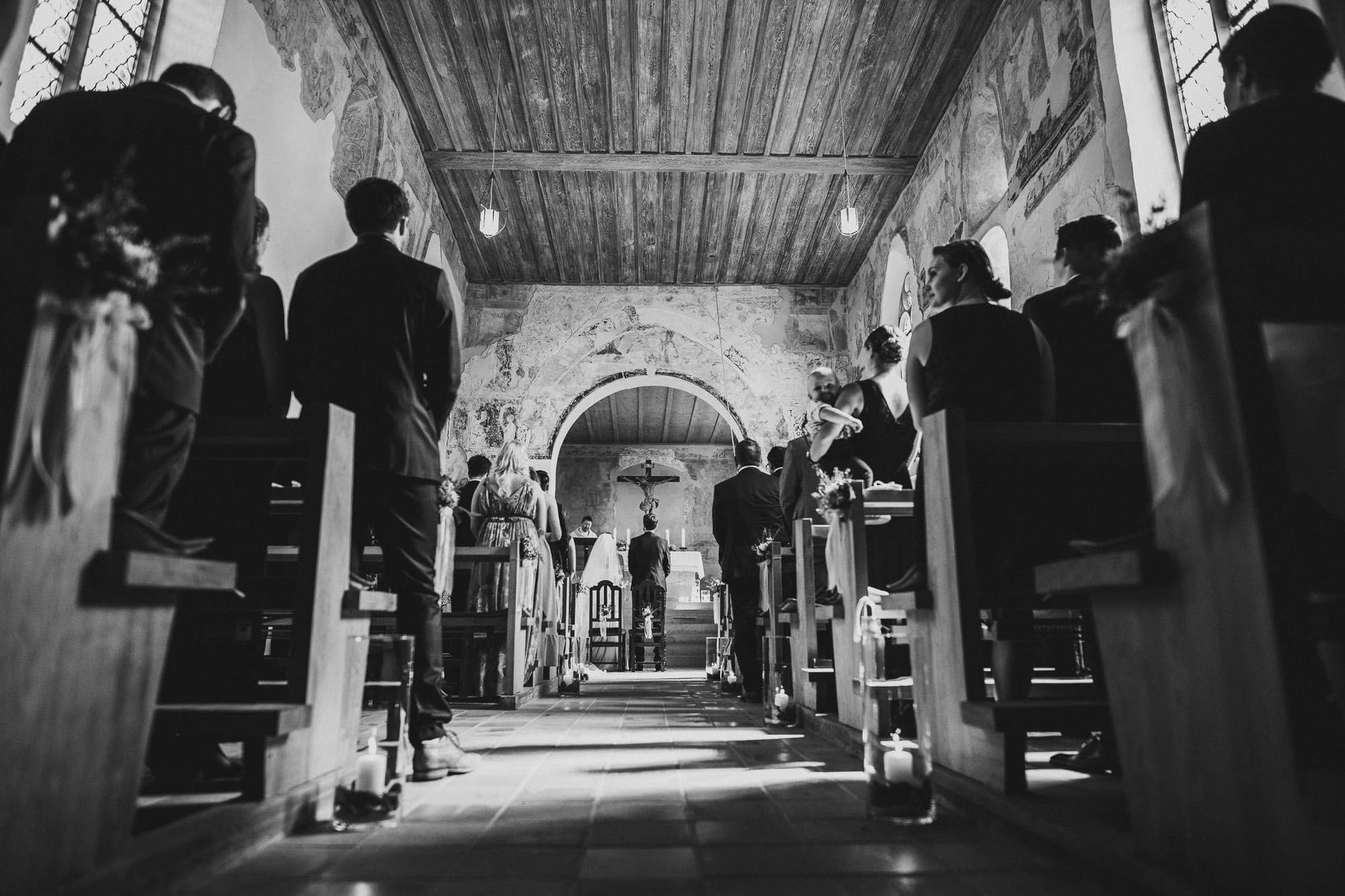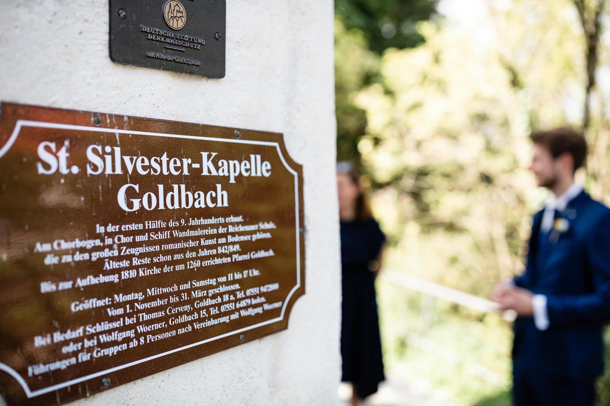 Anschließend fuhren wir gemeinsam zu der kleinen zauberhaften Kapelle im nahegelegenen Goldbach – St. Silvester-Kapelle. Dort wurde das Brautpaar von ihren Gästen herzlich empfangen. Stefan ging direkt in die Kapelle, um sich mit dem Pfarrer vor der Trauung upzudaten. Die Gäste nahmen nach und nach ihren Platz ein. Das Gemurmel wurde plötzlich ganz leise, als die Band anfing zu spielen und Nadine mit ihrem Vater an der Kapelleneingangstüre stand. Langsam und dem Takt entgegen liefen Nadine und ihr Vater den Gang entlang während ein raunen durch die Kapelle ging – die Hochzeitgäste waren vom Anblick der Braut sprachlos. Freude strahlend und unter Tränen übergab der Brautvater seine Tochter an den Bräutigam – immer wieder ein sehr emotionaler Moment. Stefan erhob den Schleicher aus Nadines Gesicht und strahlte sie gefühlt eine Ewigkeit an. Beide nahmen ihren Platz ein und die Hochzeitszeremonie nahm ihren Lauf. Die Trauung war sehr rührend und emotional – dieser Moment bleibt für immer in den Gedanken des Brautpaares sowie der geladenen Gäste. Nachdem Ja-Wort und der Trauung verließen Nadine und Stefan die Kapelle zuerst. Wir fuhren direkt in einen bezaubernden Wald in der Nähe von Sipplingen am Bodensee, um dort das Brautpaarshooting durchzuführen. Die Sonne hatte ihren perfekten Stand und das Licht schmeichelte der Kulisse. Kurze Zeit später waren die Aufnahmen gespeichert und wir fuhren zurück zur Feierlocation, an der bereits die Gäste im Spalier sehnsüchtig auf die Ehrengäste warteten.