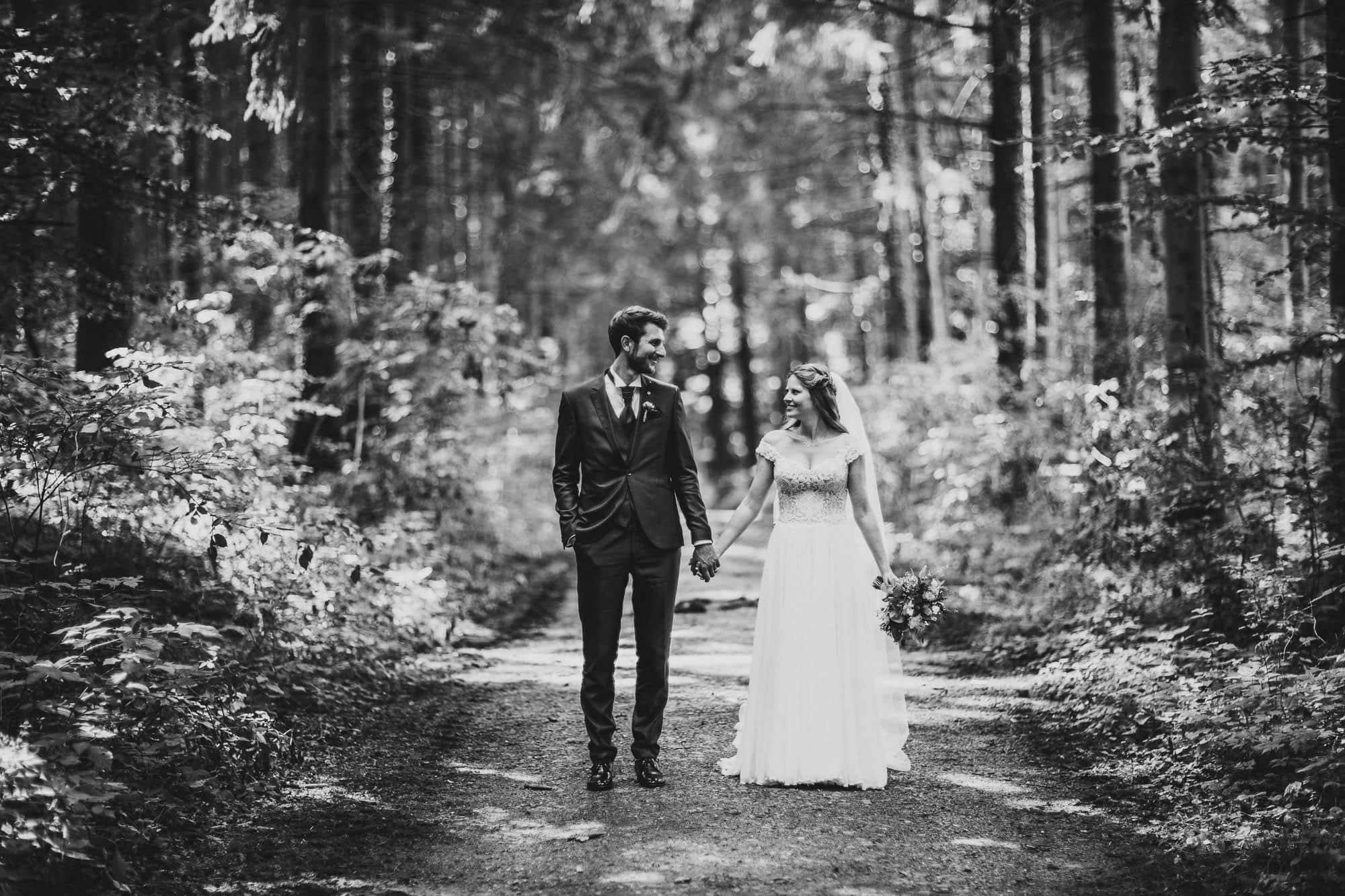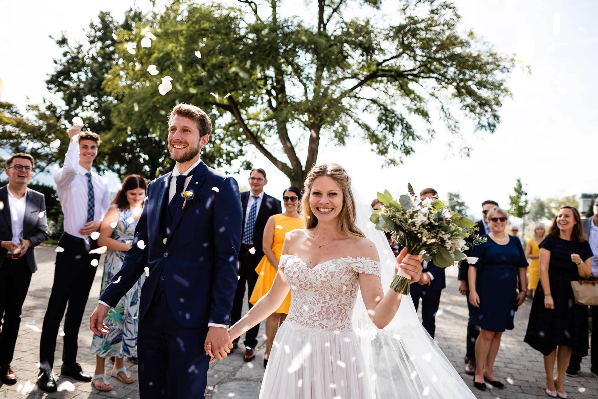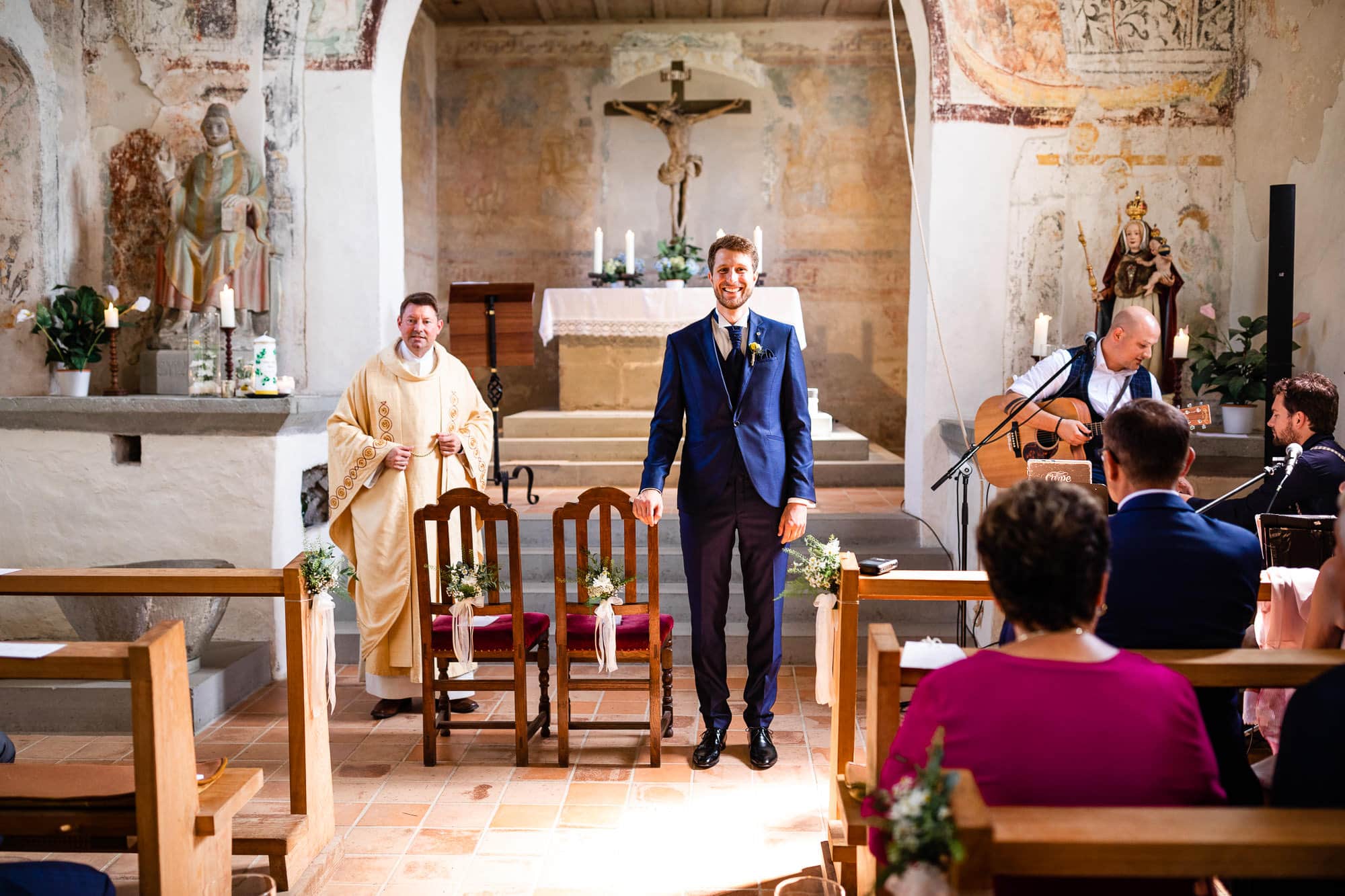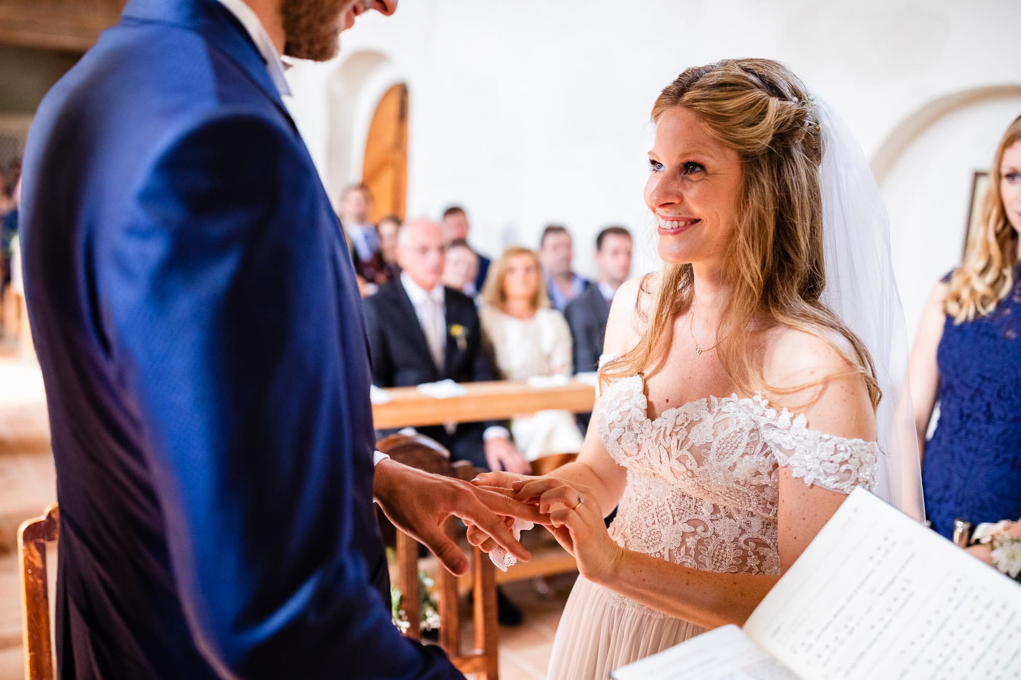 Anschließend fuhren wir gemeinsam zu der kleinen zauberhaften Kapelle im nahegelegenen Goldbach – St. Silvester-Kapelle. Dort wurde das Brautpaar von ihren Gästen herzlich empfangen. Stefan ging direkt in die Kapelle, um sich mit dem Pfarrer vor der Trauung upzudaten. Die Gäste nahmen nach und nach ihren Platz ein. Das Gemurmel wurde plötzlich ganz leise, als die Band anfing zu spielen und Nadine mit ihrem Vater an der Kapelleneingangstüre stand. Langsam und dem Takt entgegen liefen Nadine und ihr Vater den Gang entlang während ein raunen durch die Kapelle ging – die Hochzeitgäste waren vom Anblick der Braut sprachlos. Freude strahlend und unter Tränen übergab der Brautvater seine Tochter an den Bräutigam – immer wieder ein sehr emotionaler Moment. Stefan erhob den Schleicher aus Nadines Gesicht und strahlte sie gefühlt eine Ewigkeit an. Beide nahmen ihren Platz ein und die Hochzeitszeremonie nahm ihren Lauf. Die Trauung war sehr rührend und emotional – dieser Moment bleibt für immer in den Gedanken des Brautpaares sowie der geladenen Gäste. Nachdem Ja-Wort und der Trauung verließen Nadine und Stefan die Kapelle zuerst. Wir fuhren direkt in einen bezaubernden Wald in der Nähe von Sipplingen am Bodensee, um dort das Brautpaarshooting durchzuführen. Die Sonne hatte ihren perfekten Stand und das Licht schmeichelte der Kulisse. Kurze Zeit später waren die Aufnahmen gespeichert und wir fuhren zurück zur Feierlocation, an der bereits die Gäste im Spalier sehnsüchtig auf die Ehrengäste warteten.