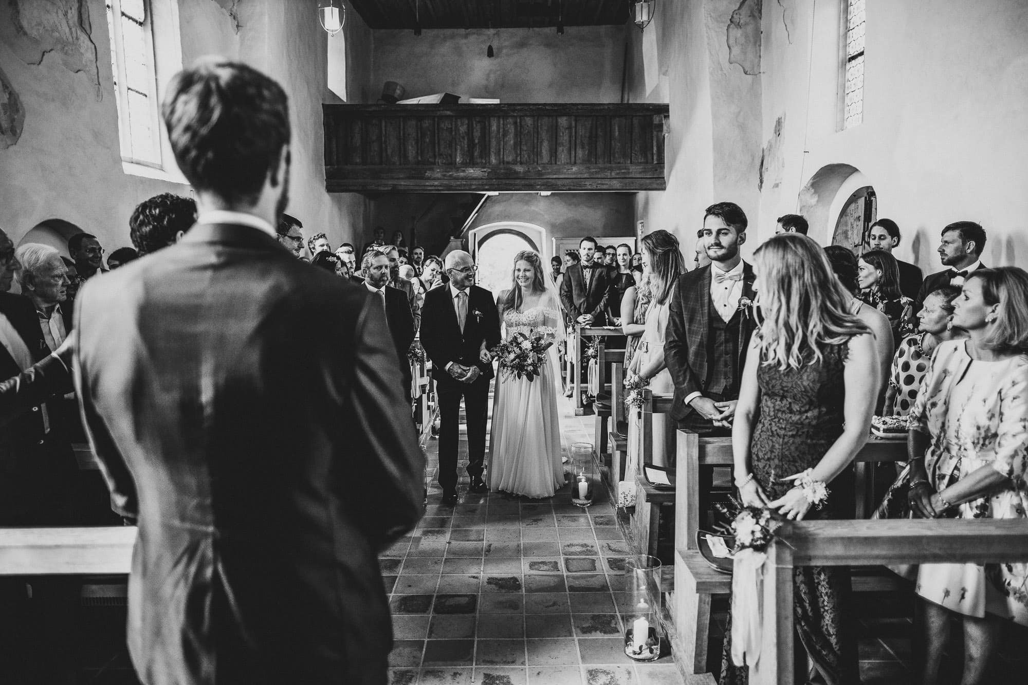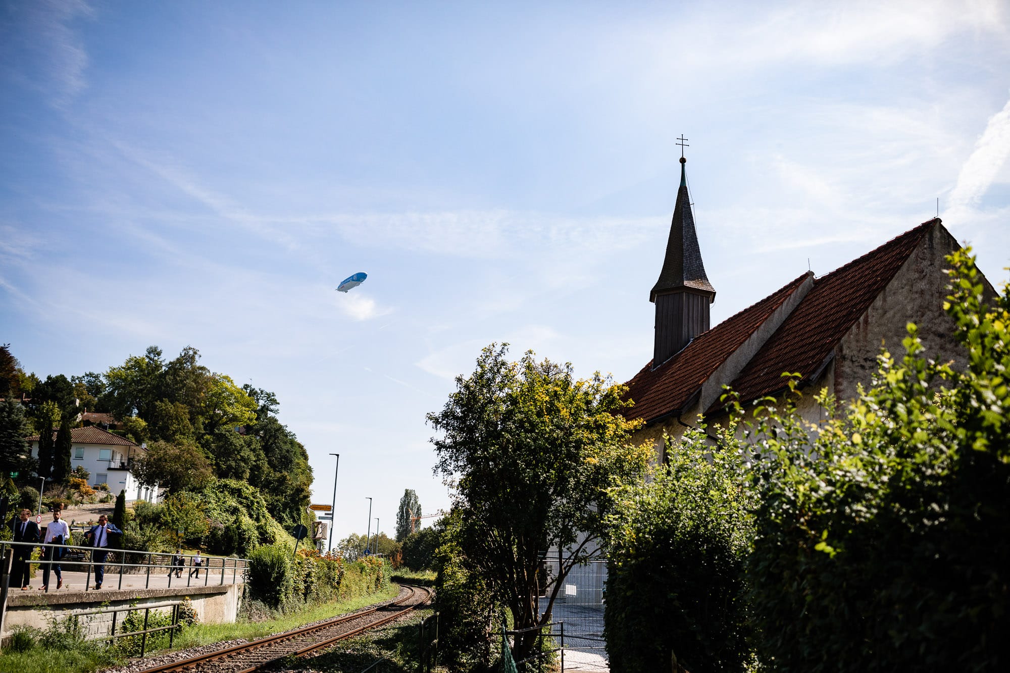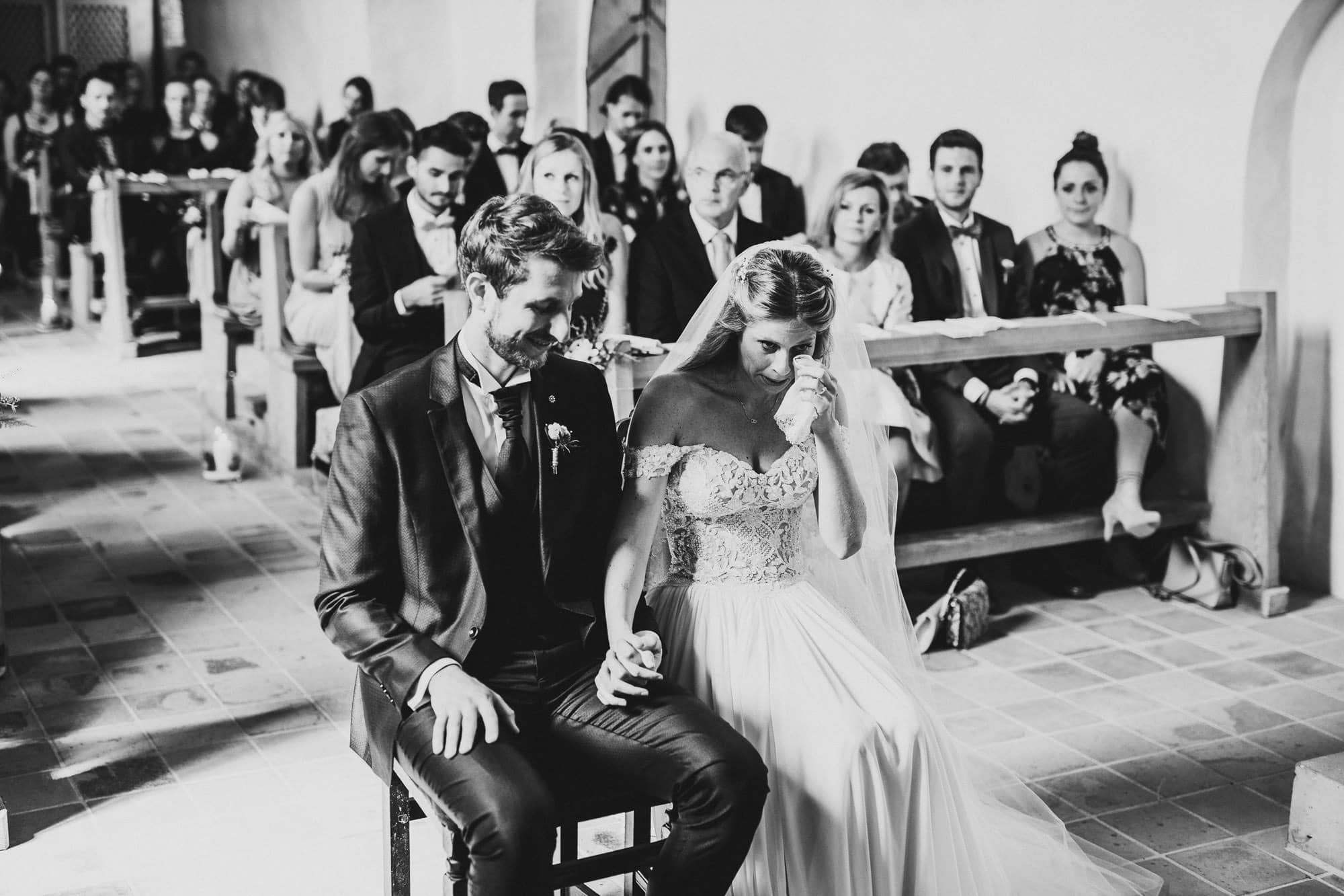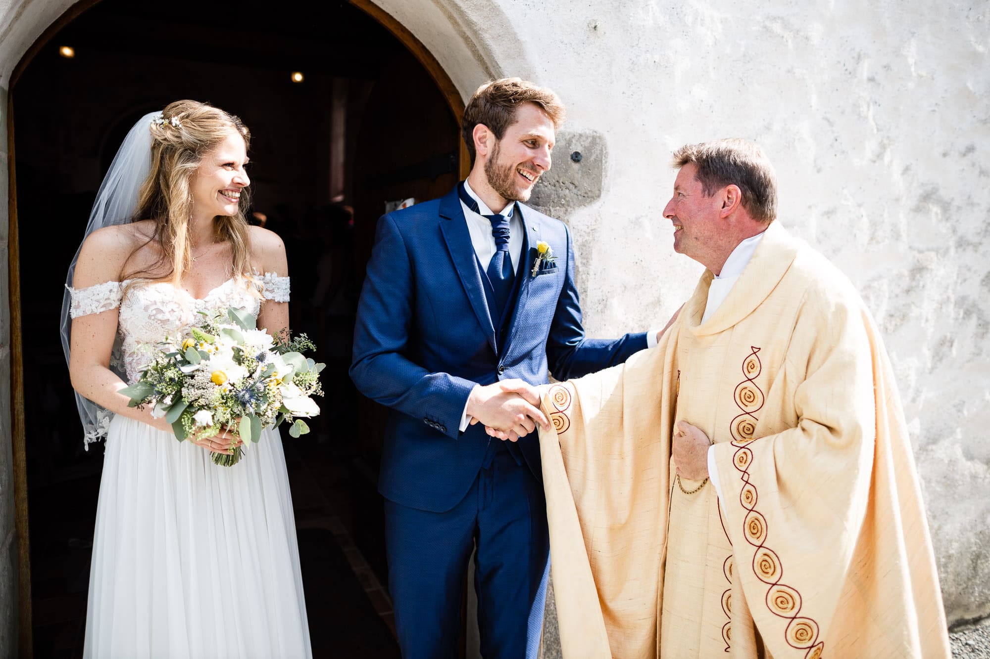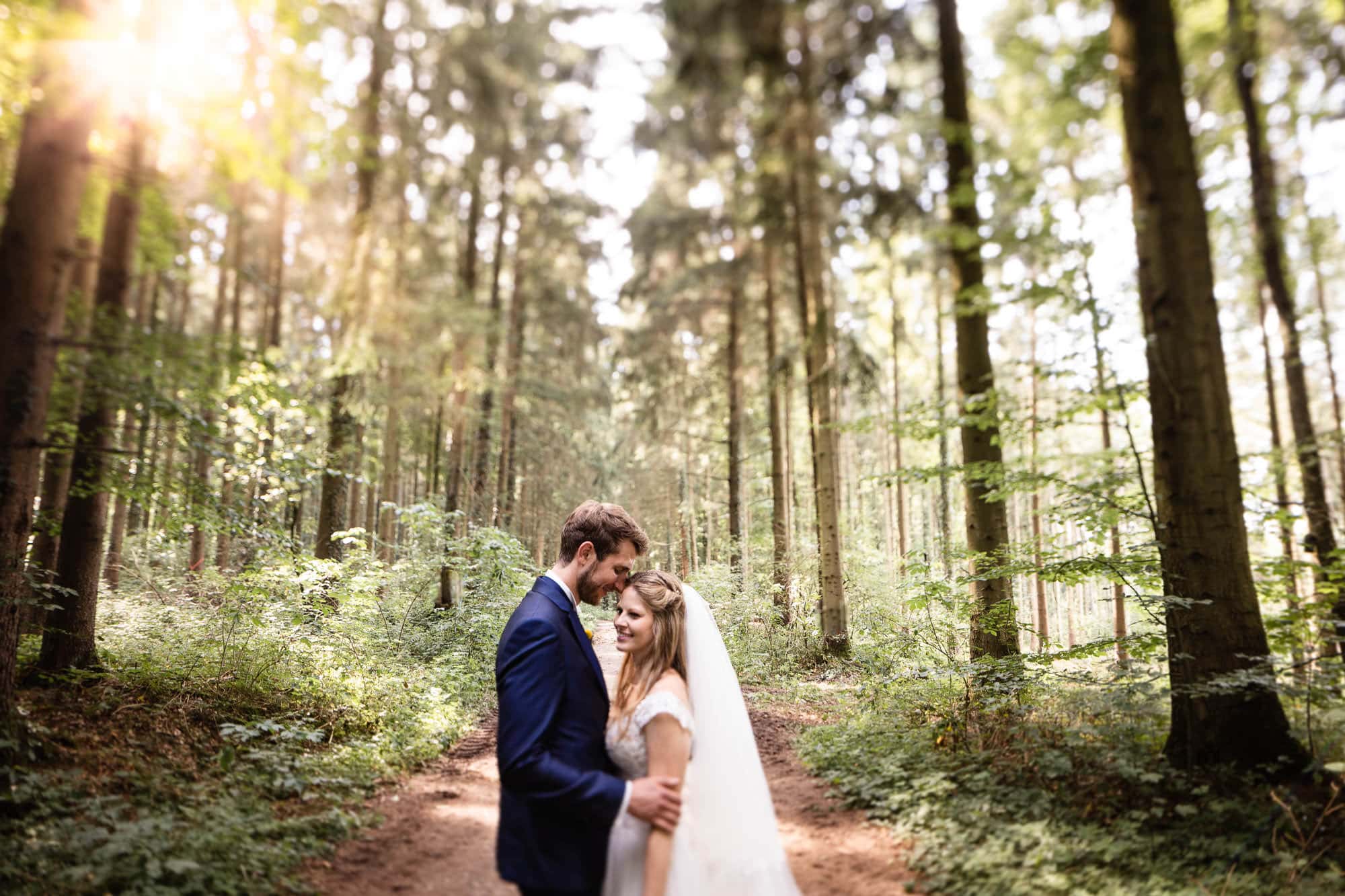Anschließend fuhren wir gemeinsam zu der kleinen zauberhaften Kapelle im nahegelegenen Goldbach – St. Silvester-Kapelle. Dort wurde das Brautpaar von ihren Gästen herzlich empfangen. Stefan ging direkt in die Kapelle, um sich mit dem Pfarrer vor der Trauung upzudaten. Die Gäste nahmen nach und nach ihren Platz ein. Das Gemurmel wurde plötzlich ganz leise, als die Band anfing zu spielen und Nadine mit ihrem Vater an der Kapelleneingangstüre stand. Langsam und dem Takt entgegen liefen Nadine und ihr Vater den Gang entlang während ein raunen durch die Kapelle ging – die Hochzeitgäste waren vom Anblick der Braut sprachlos. Freude strahlend und unter Tränen übergab der Brautvater seine Tochter an den Bräutigam – immer wieder ein sehr emotionaler Moment. Stefan erhob den Schleicher aus Nadines Gesicht und strahlte sie gefühlt eine Ewigkeit an. Beide nahmen ihren Platz ein und die Hochzeitszeremonie nahm ihren Lauf. Die Trauung war sehr rührend und emotional – dieser Moment bleibt für immer in den Gedanken des Brautpaares sowie der geladenen Gäste. Nachdem Ja-Wort und der Trauung verließen Nadine und Stefan die Kapelle zuerst. Wir fuhren direkt in einen bezaubernden Wald in der Nähe von Sipplingen am Bodensee, um dort das Brautpaarshooting durchzuführen. Die Sonne hatte ihren perfekten Stand und das Licht schmeichelte der Kulisse. Kurze Zeit später waren die Aufnahmen gespeichert und wir fuhren zurück zur Feierlocation, an der bereits die Gäste im Spalier sehnsüchtig auf die Ehrengäste warteten.