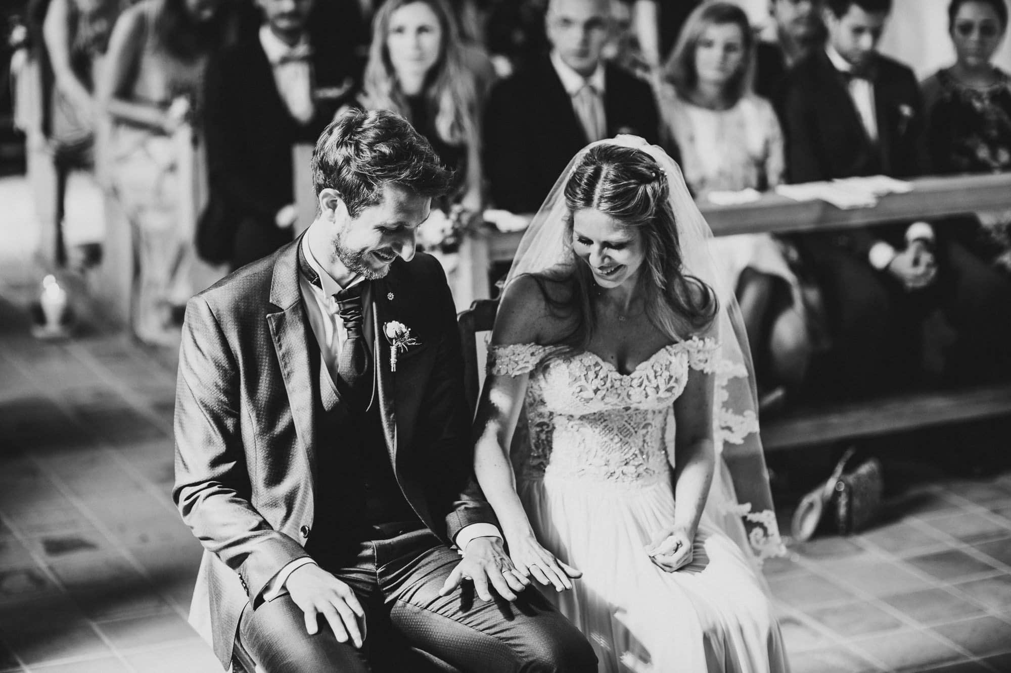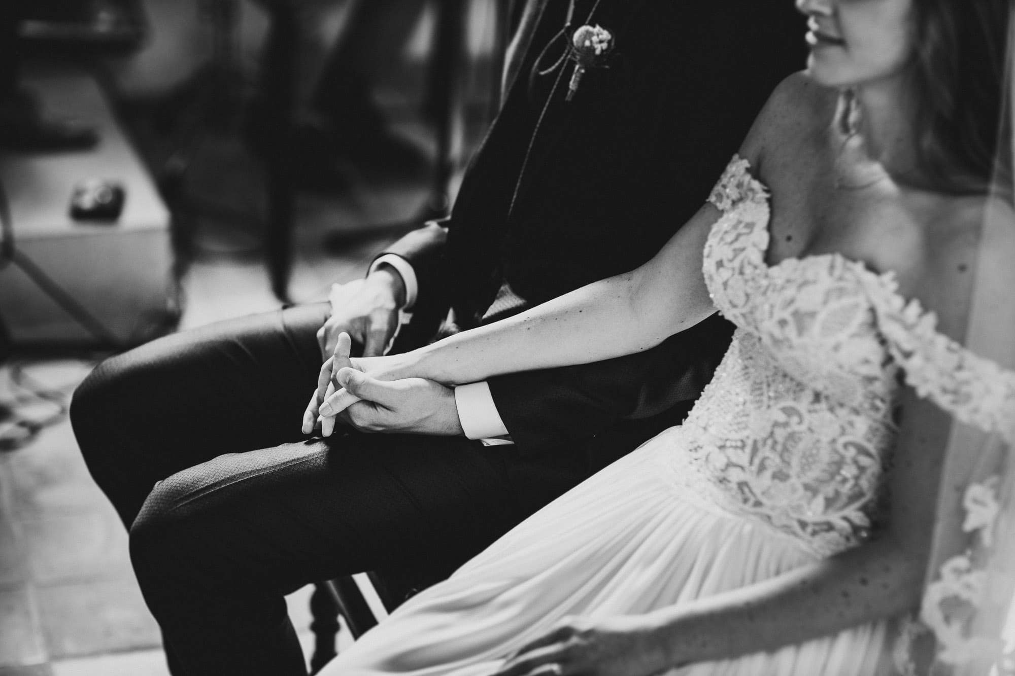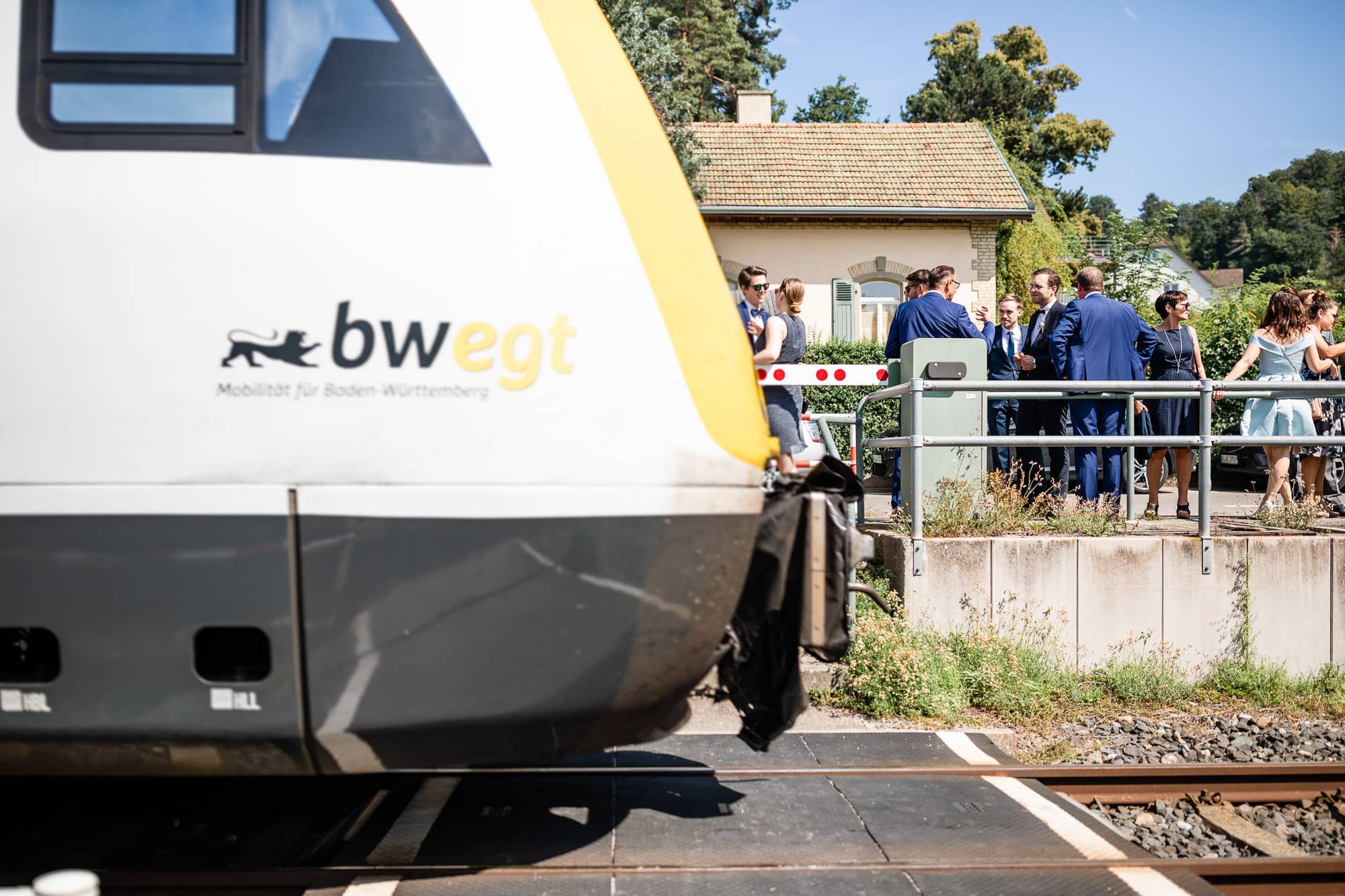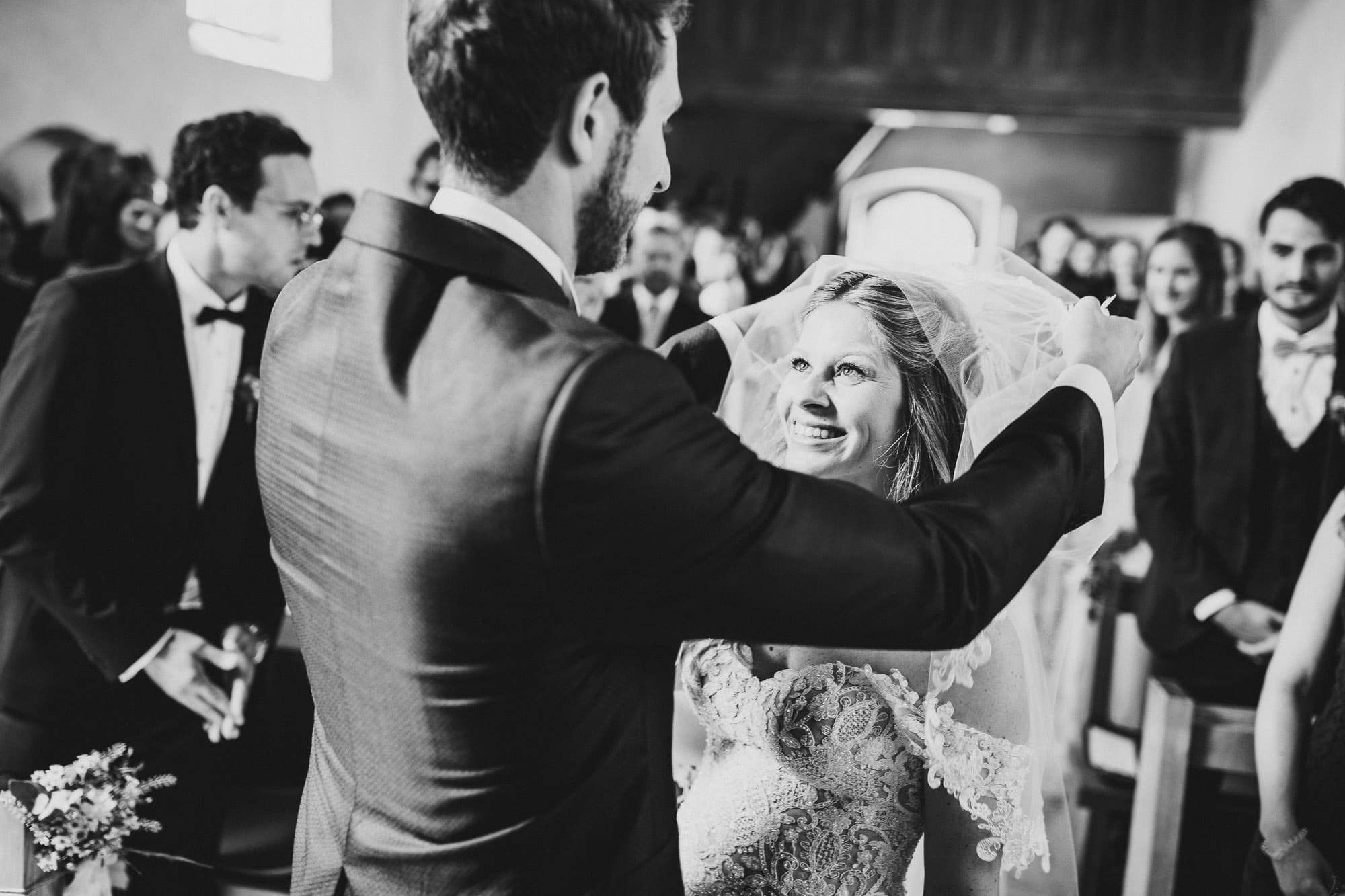 Anschließend fuhren wir gemeinsam zu der kleinen zauberhaften Kapelle im nahegelegenen Goldbach – St. Silvester-Kapelle. Dort wurde das Brautpaar von ihren Gästen herzlich empfangen. Stefan ging direkt in die Kapelle, um sich mit dem Pfarrer vor der Trauung upzudaten. Die Gäste nahmen nach und nach ihren Platz ein. Das Gemurmel wurde plötzlich ganz leise, als die Band anfing zu spielen und Nadine mit ihrem Vater an der Kapelleneingangstüre stand. Langsam und dem Takt entgegen liefen Nadine und ihr Vater den Gang entlang während ein raunen durch die Kapelle ging – die Hochzeitgäste waren vom Anblick der Braut sprachlos. Freude strahlend und unter Tränen übergab der Brautvater seine Tochter an den Bräutigam – immer wieder ein sehr emotionaler Moment. Stefan erhob den Schleicher aus Nadines Gesicht und strahlte sie gefühlt eine Ewigkeit an. Beide nahmen ihren Platz ein und die Hochzeitszeremonie nahm ihren Lauf. Die Trauung war sehr rührend und emotional – dieser Moment bleibt für immer in den Gedanken des Brautpaares sowie der geladenen Gäste. Nachdem Ja-Wort und der Trauung verließen Nadine und Stefan die Kapelle zuerst. Wir fuhren direkt in einen bezaubernden Wald in der Nähe von Sipplingen am Bodensee, um dort das Brautpaarshooting durchzuführen. Die Sonne hatte ihren perfekten Stand und das Licht schmeichelte der Kulisse. Kurze Zeit später waren die Aufnahmen gespeichert und wir fuhren zurück zur Feierlocation, an der bereits die Gäste im Spalier sehnsüchtig auf die Ehrengäste warteten.