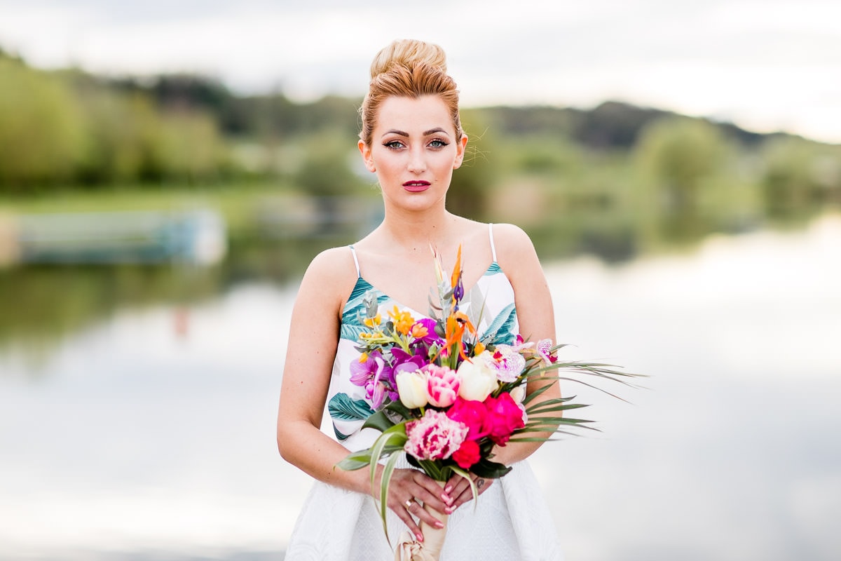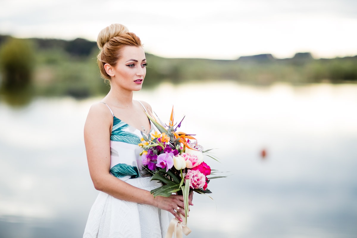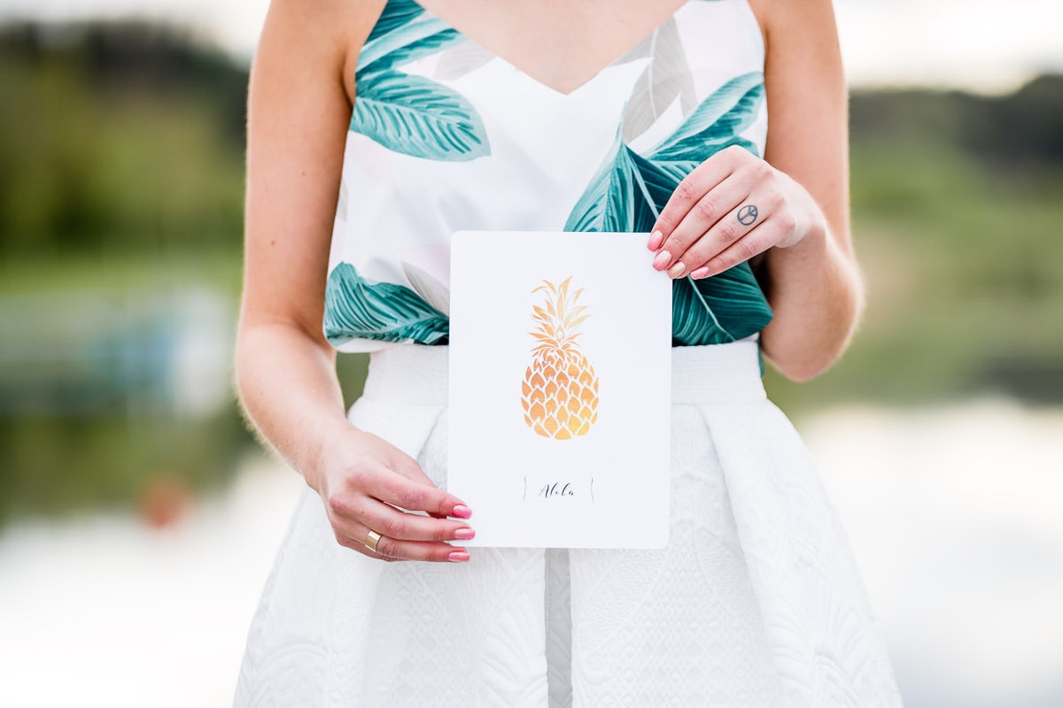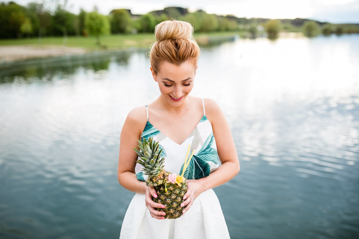 Zu unserem Team gehörten Christina Geiger von der Hochzeitsagentur Efi aus Ravensburg, die sich um die Organisation des Shootings gekümmert hat, sowie die Floristen von Florita aus Zumikon, die die prachtvolle Blumendekoration und den außergewöhnlichen Brautstrauß beisteuerten. Gemeinsam haben wir in der direkt am Wasser gelegenen Location Südsee 3 in Mengen eine tolle Atmosphäre geschaffen, in der ich unter dem Motto „Pineapple & Roségold“ ganz besondere Fotos von unserem Model Rosa machen durfte. Neben trendigen Accessoires im Ananas-Look setzten wir beim Shooting auf natürliche Farbtöne und Materialien. Die Gestaltung des Tisches wurde durch Blumenschmuck und florale Muster ergänzt, die sich auch auf dem Brautkleid wiederfinden. Roségoldene Elemente setzten nicht nur in der Dekoration, sondern auch im Styling der Braut edle Akzente.