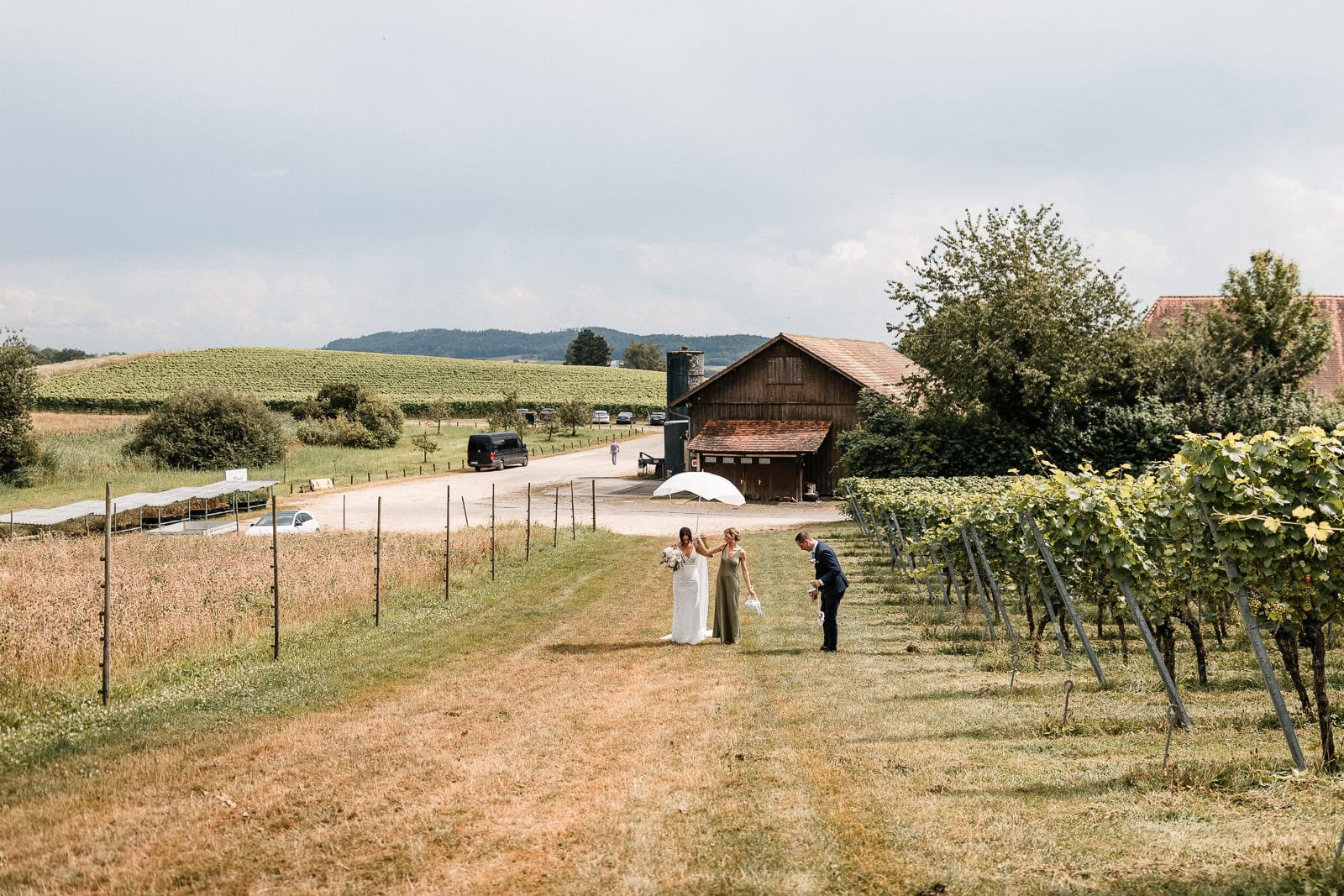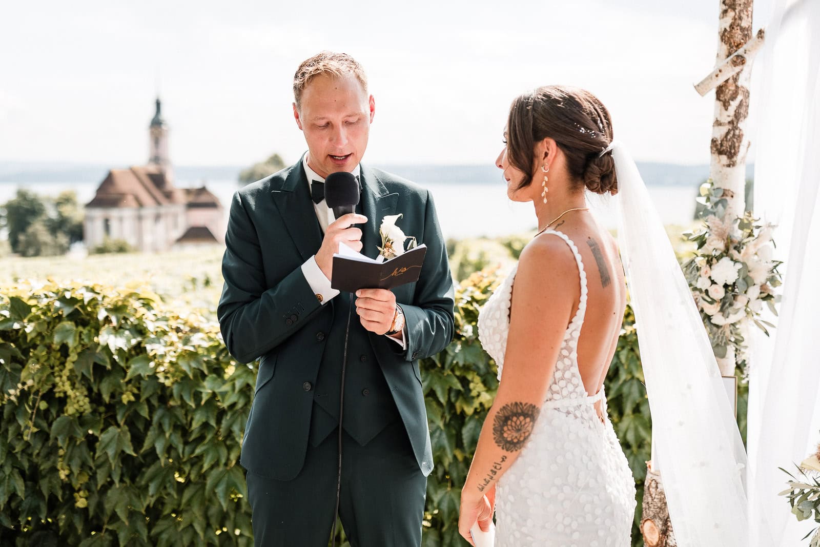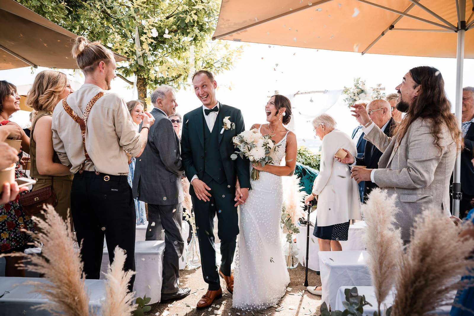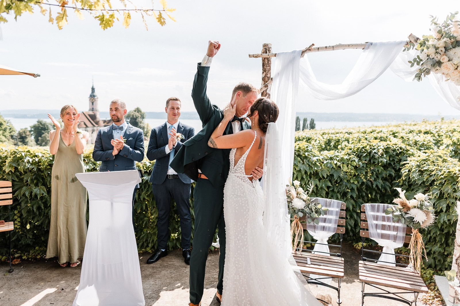 Für die freie Trauung im Birnauer Oberhof hatten Marie und Steve eine traumhafte Kulisse gewählt: umgeben von Weinreben mit Blick auf den Bodensee. Nach dem Regen verwandelte sich die Stimmung in pure Sommerfreude. Die Sonne zeigte sich nun von ihrer besten Seite – und brachte nicht nur die Gäste, sondern auch die Emotionen zum Strahlen.