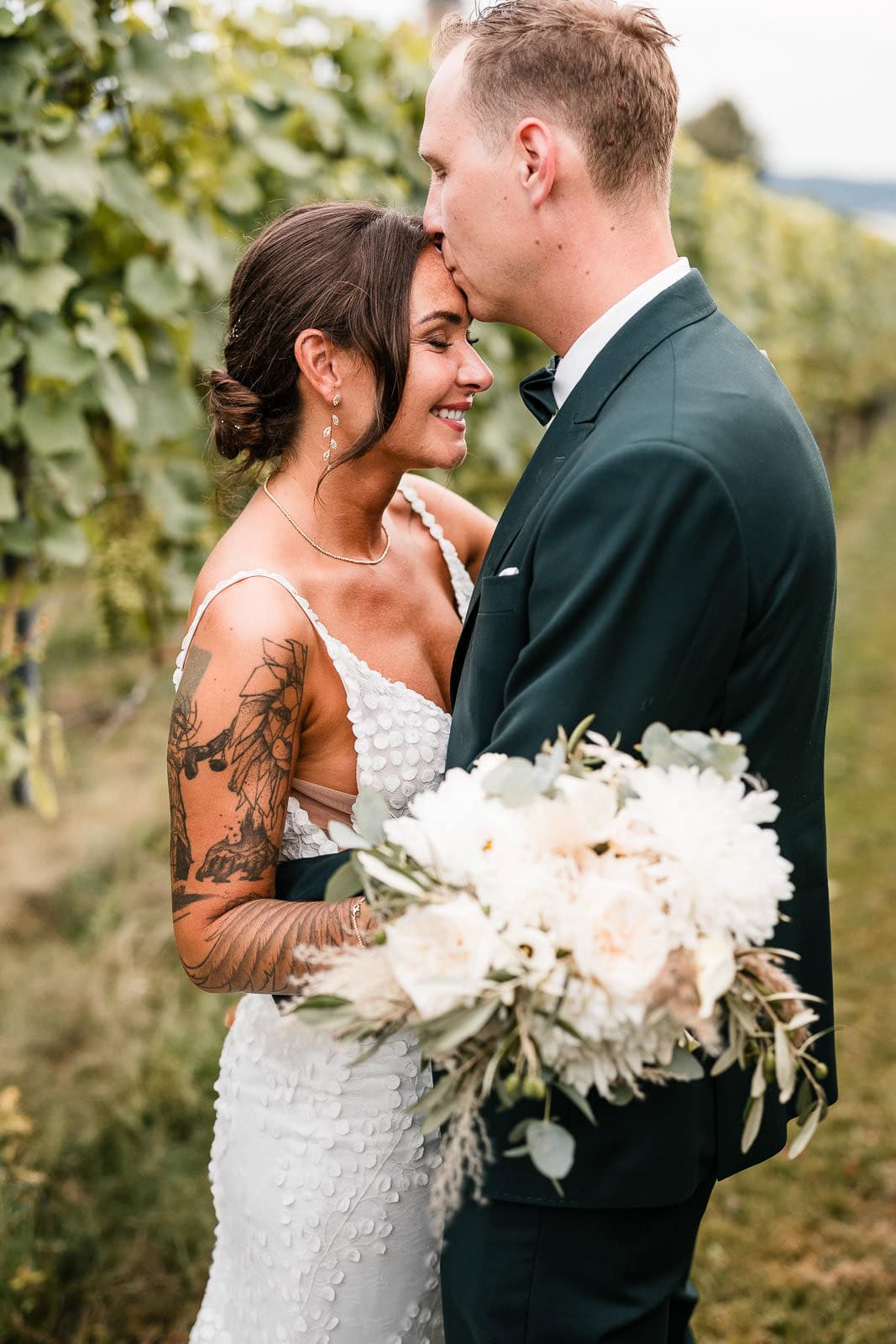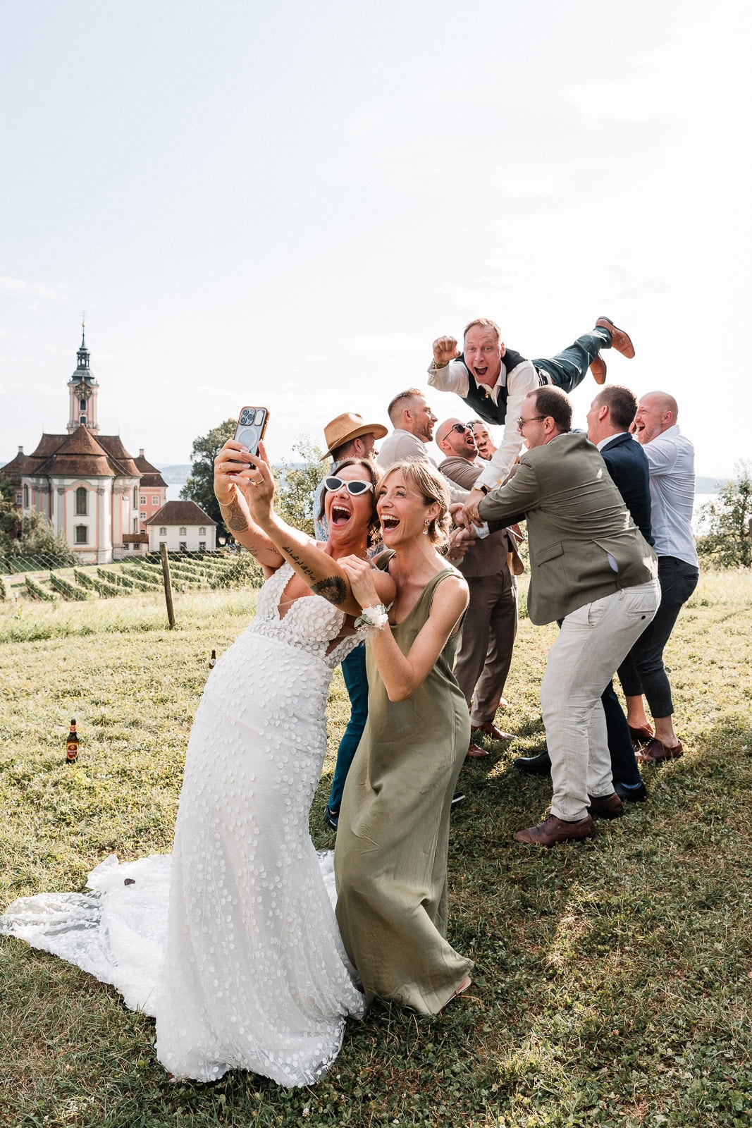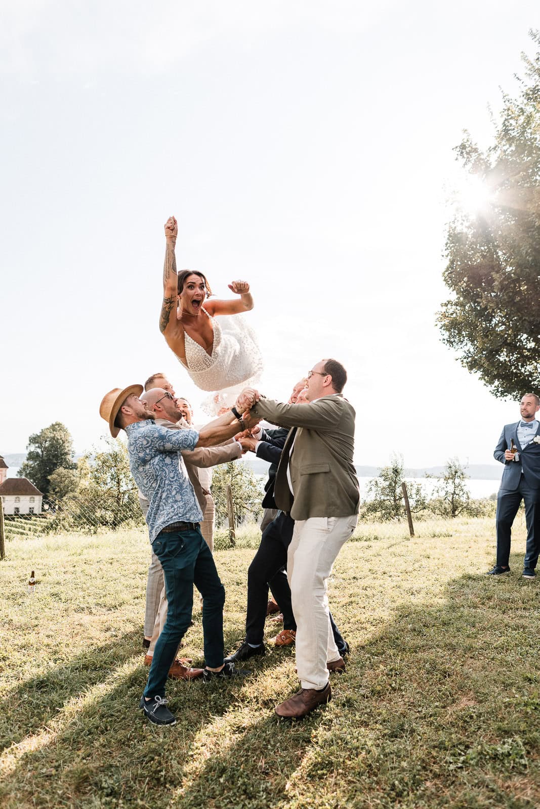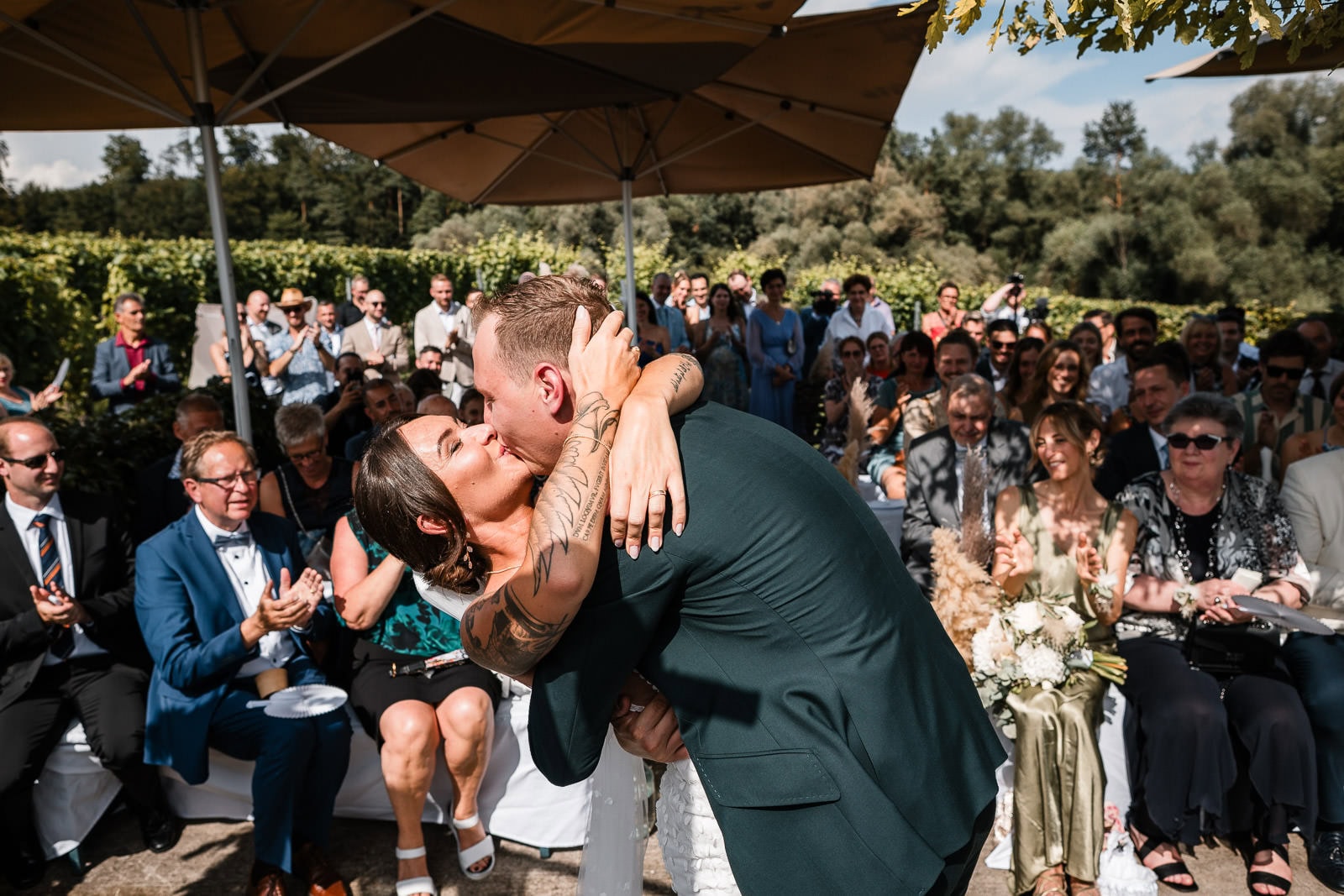 Für die freie Trauung im Birnauer Oberhof hatten Marie und Steve eine traumhafte Kulisse gewählt: umgeben von Weinreben mit Blick auf den Bodensee. Nach dem Regen verwandelte sich die Stimmung in pure Sommerfreude. Die Sonne zeigte sich nun von ihrer besten Seite – und brachte nicht nur die Gäste, sondern auch die Emotionen zum Strahlen.
