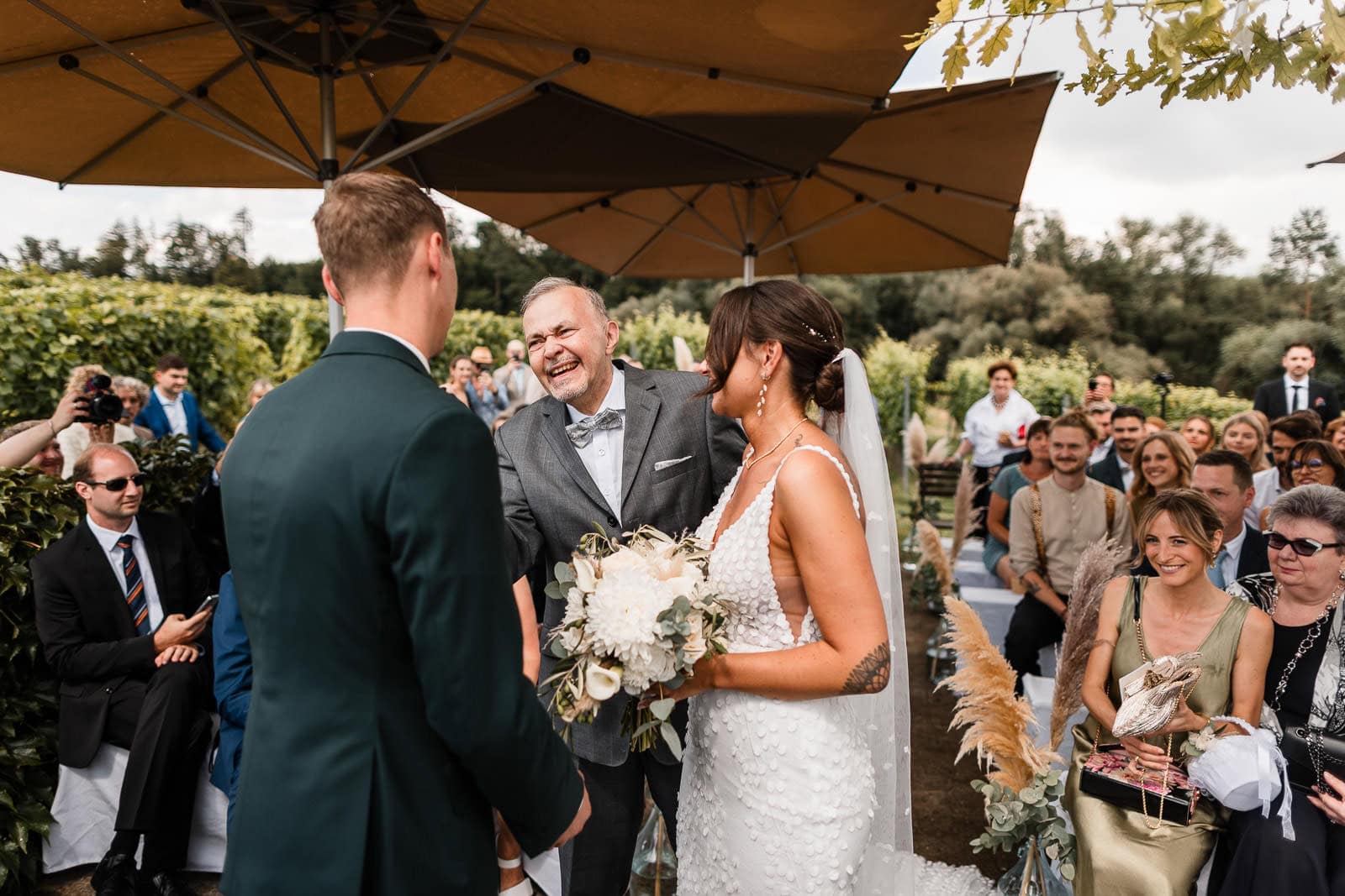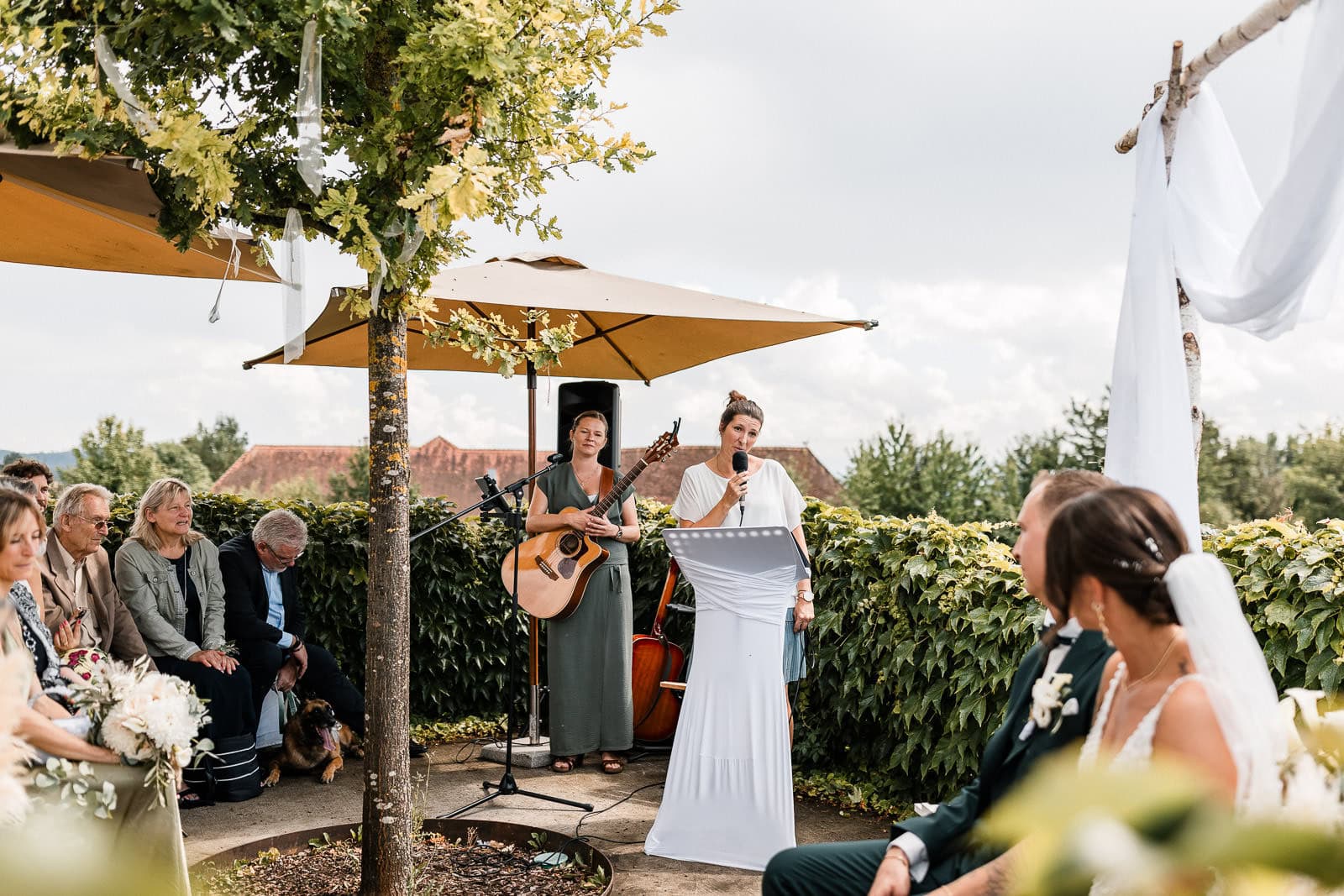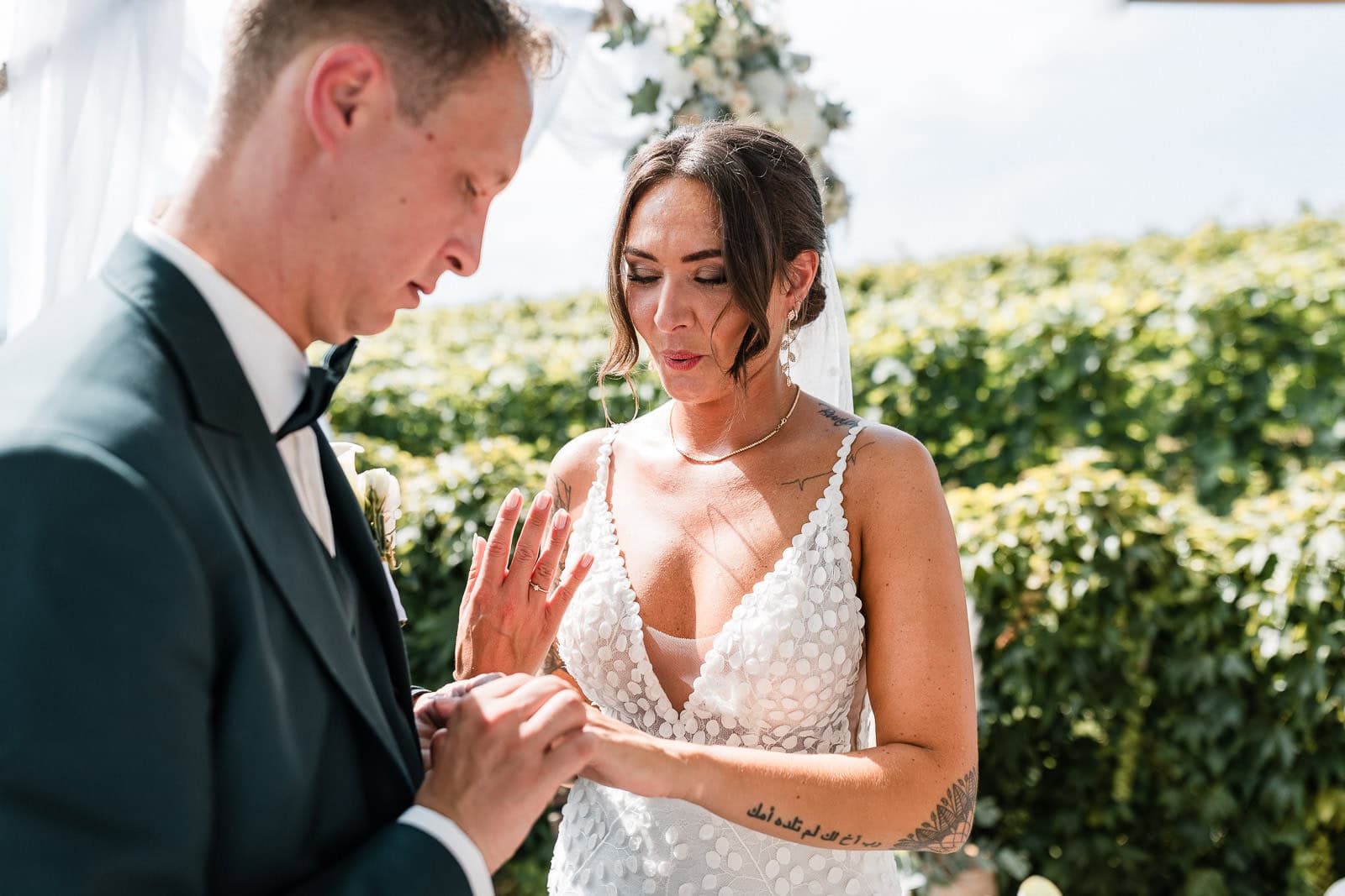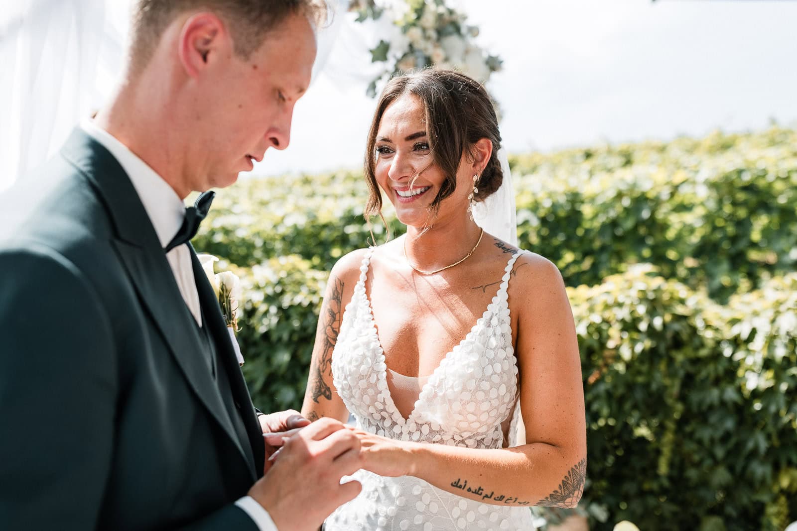 Für die freie Trauung im Birnauer Oberhof hatten Marie und Steve eine traumhafte Kulisse gewählt: umgeben von Weinreben mit Blick auf den Bodensee. Nach dem Regen verwandelte sich die Stimmung in pure Sommerfreude. Die Sonne zeigte sich nun von ihrer besten Seite – und brachte nicht nur die Gäste, sondern auch die Emotionen zum Strahlen.
