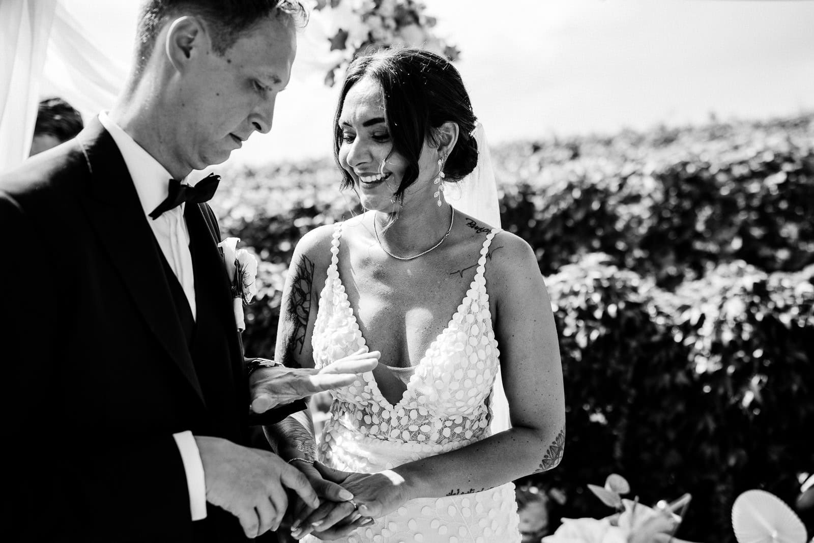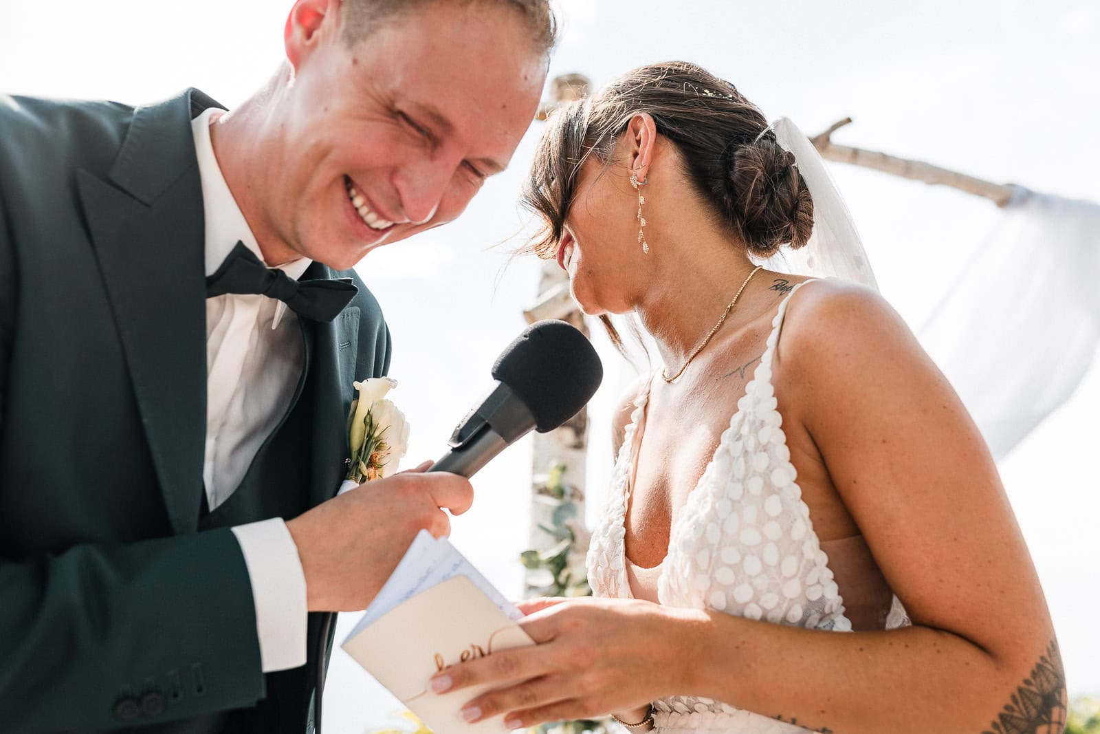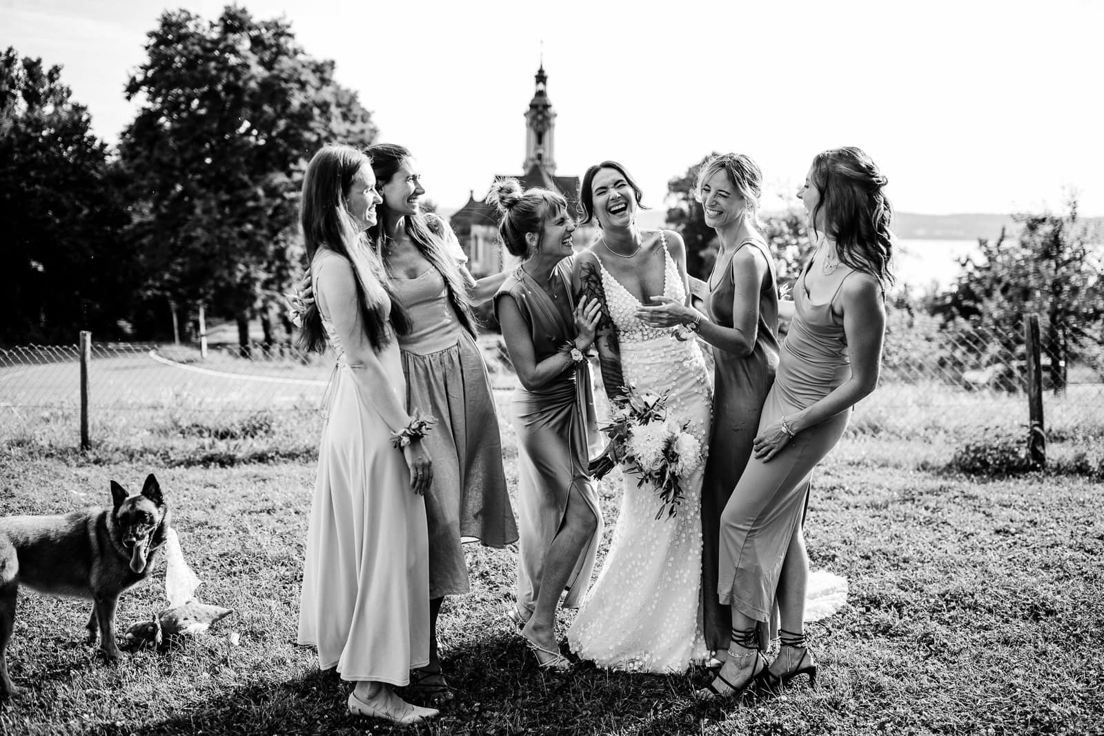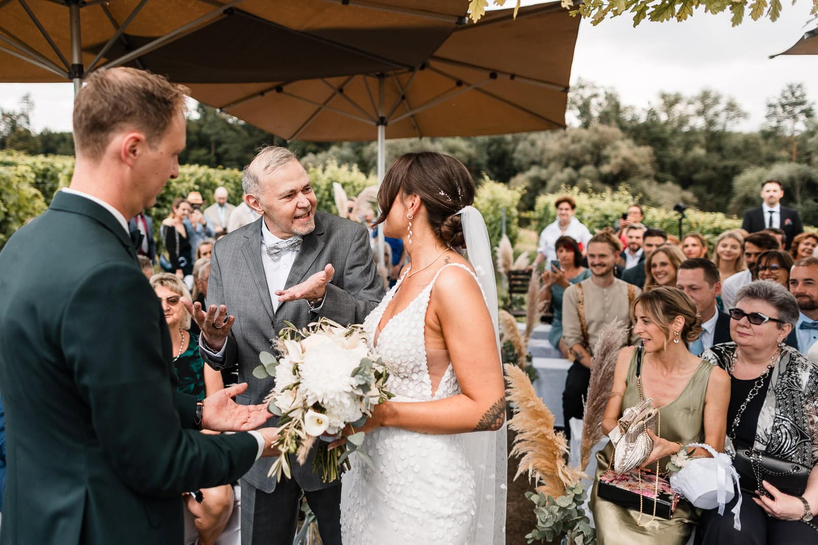 Für die freie Trauung im Birnauer Oberhof hatten Marie und Steve eine traumhafte Kulisse gewählt: umgeben von Weinreben mit Blick auf den Bodensee. Nach dem Regen verwandelte sich die Stimmung in pure Sommerfreude. Die Sonne zeigte sich nun von ihrer besten Seite – und brachte nicht nur die Gäste, sondern auch die Emotionen zum Strahlen.
