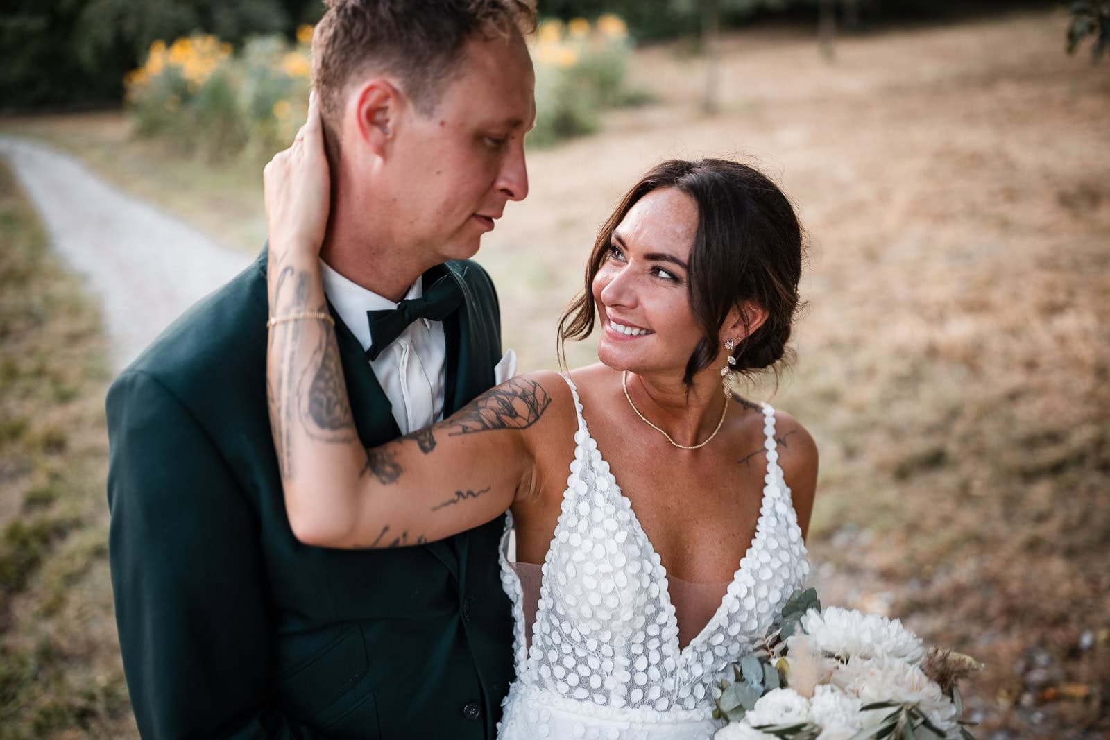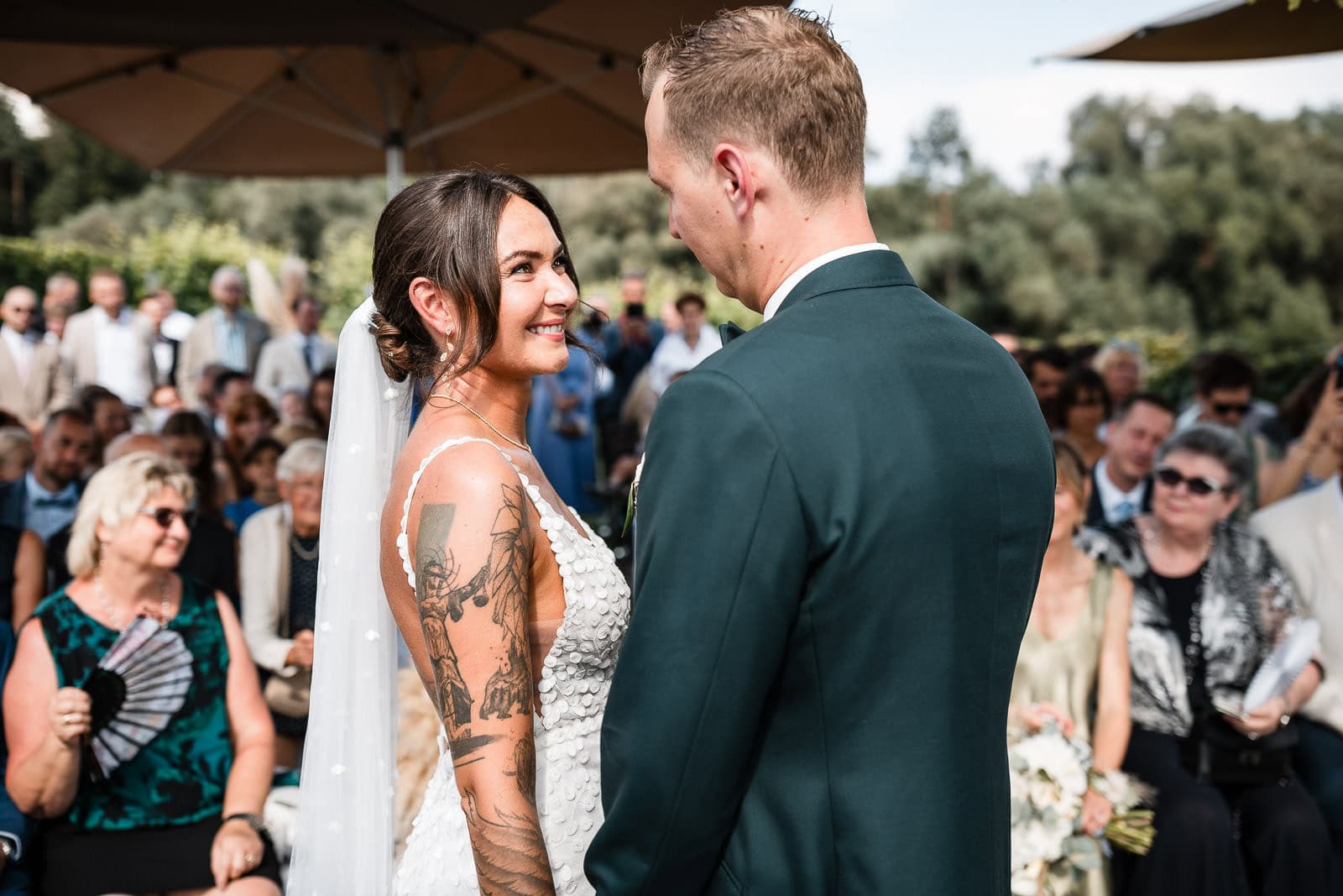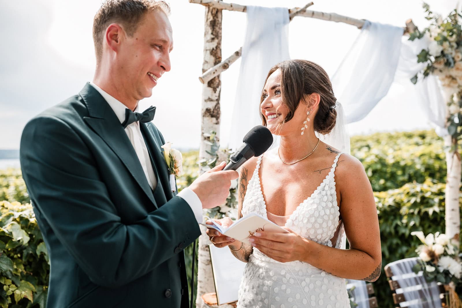 Und dann geschah das, was sich jedes Brautpaar wünscht – pünktlich zur freien Trauung klarte der Himmel auf. Die Sonne brach durch die Wolken, als hätte sie nur auf ihren Auftritt gewartet.
