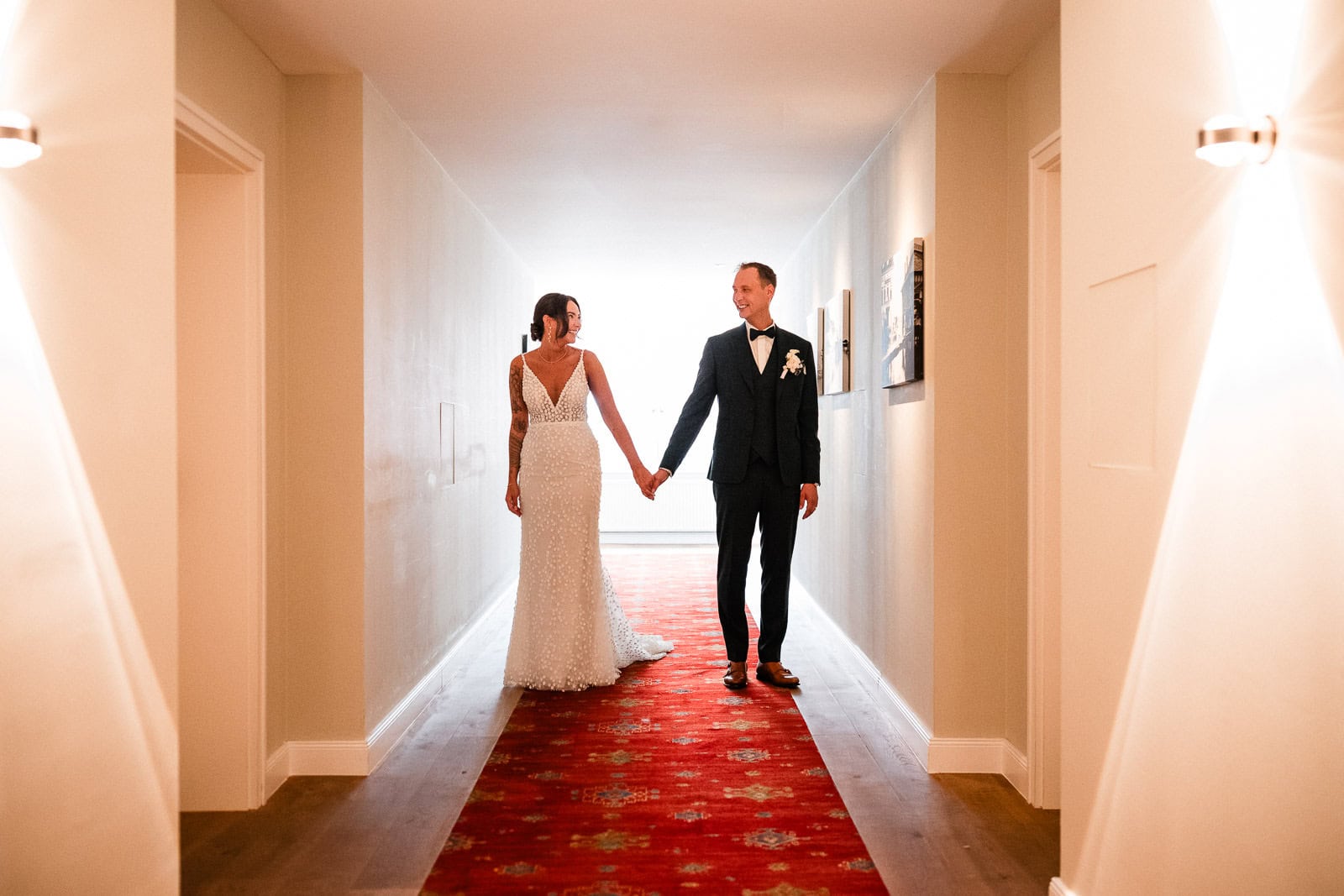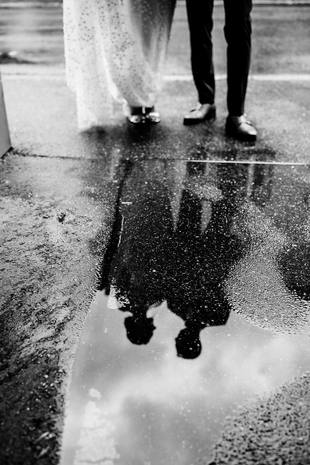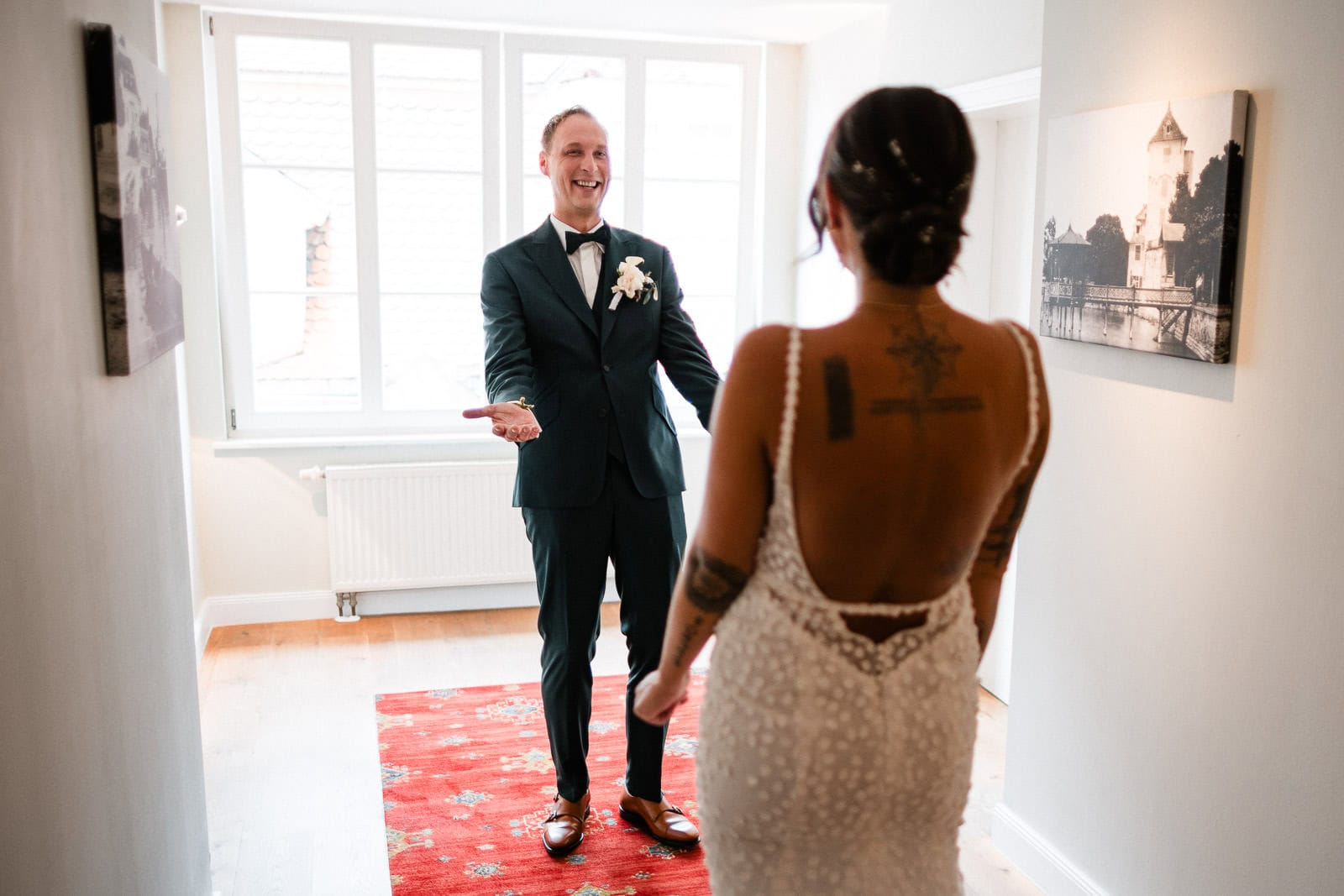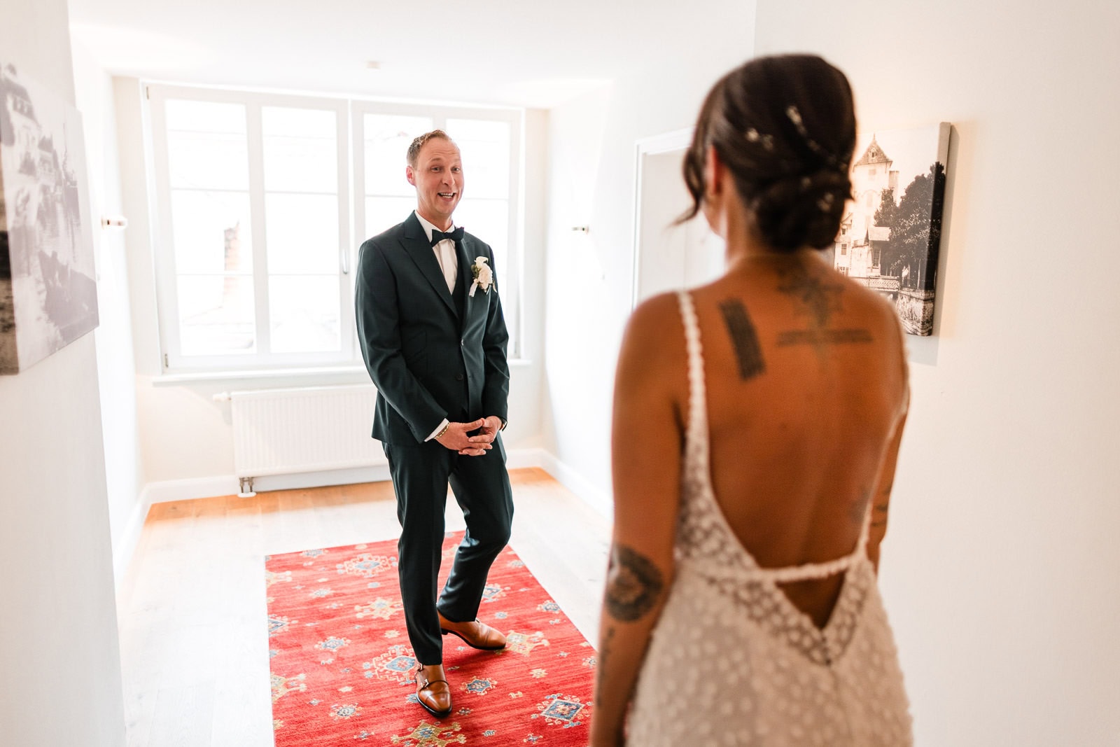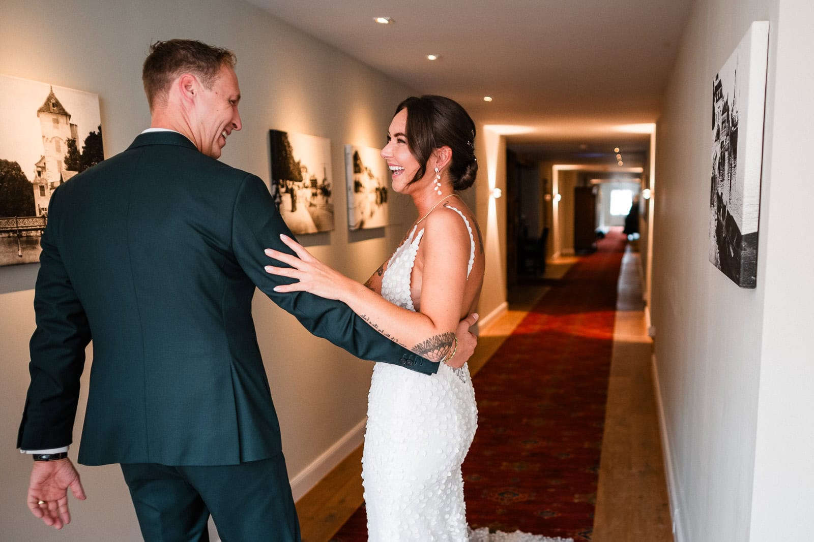 Bis kurz vor der Trauung zeigte sich das Wetter von seiner launischen Seite. Dichte Wolken und anhaltender Regen machten eine spontane Planänderung notwendig. Der First Look – ursprünglich im Freien geplant – musste kurzerhand ins Hotel verlegt werden.