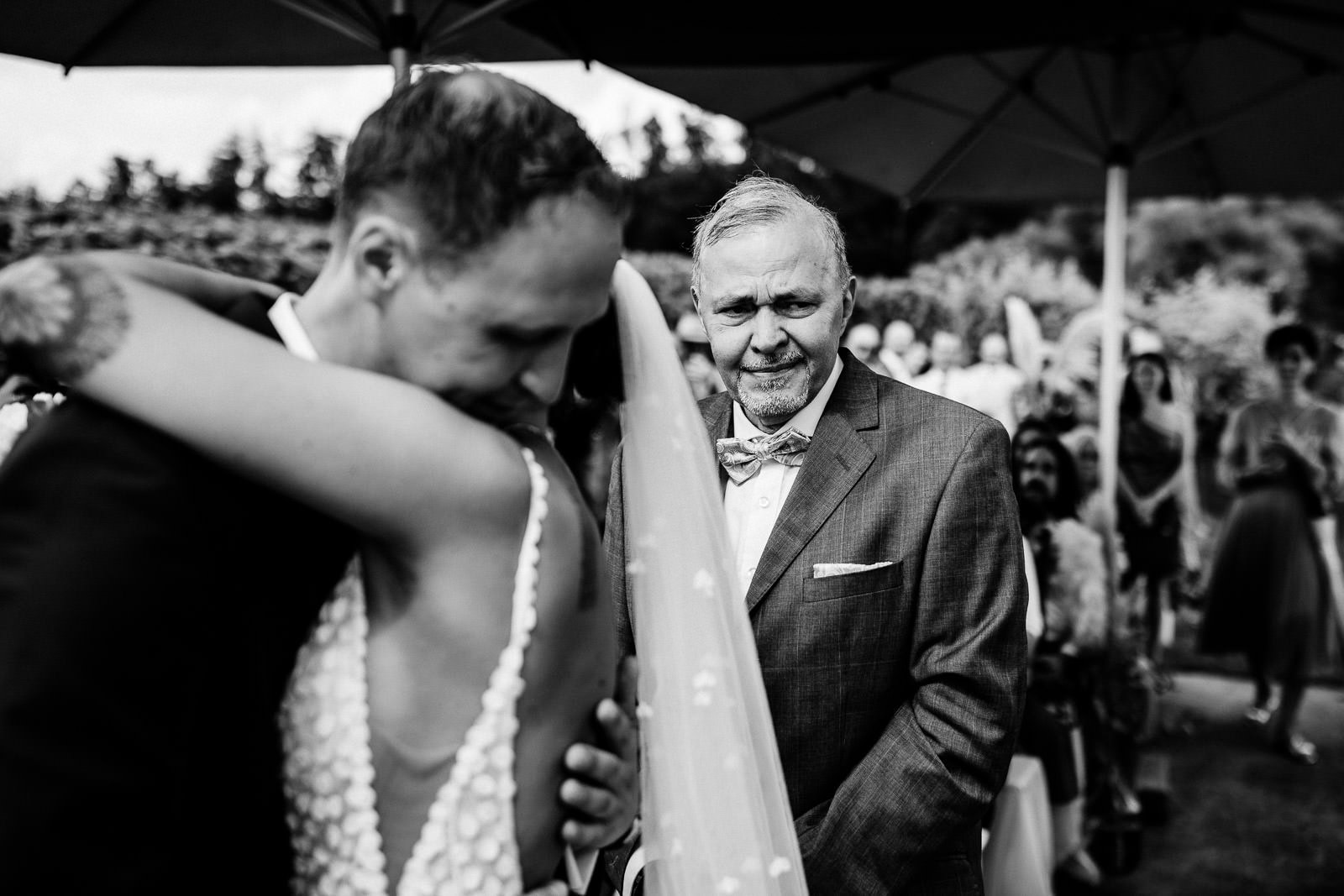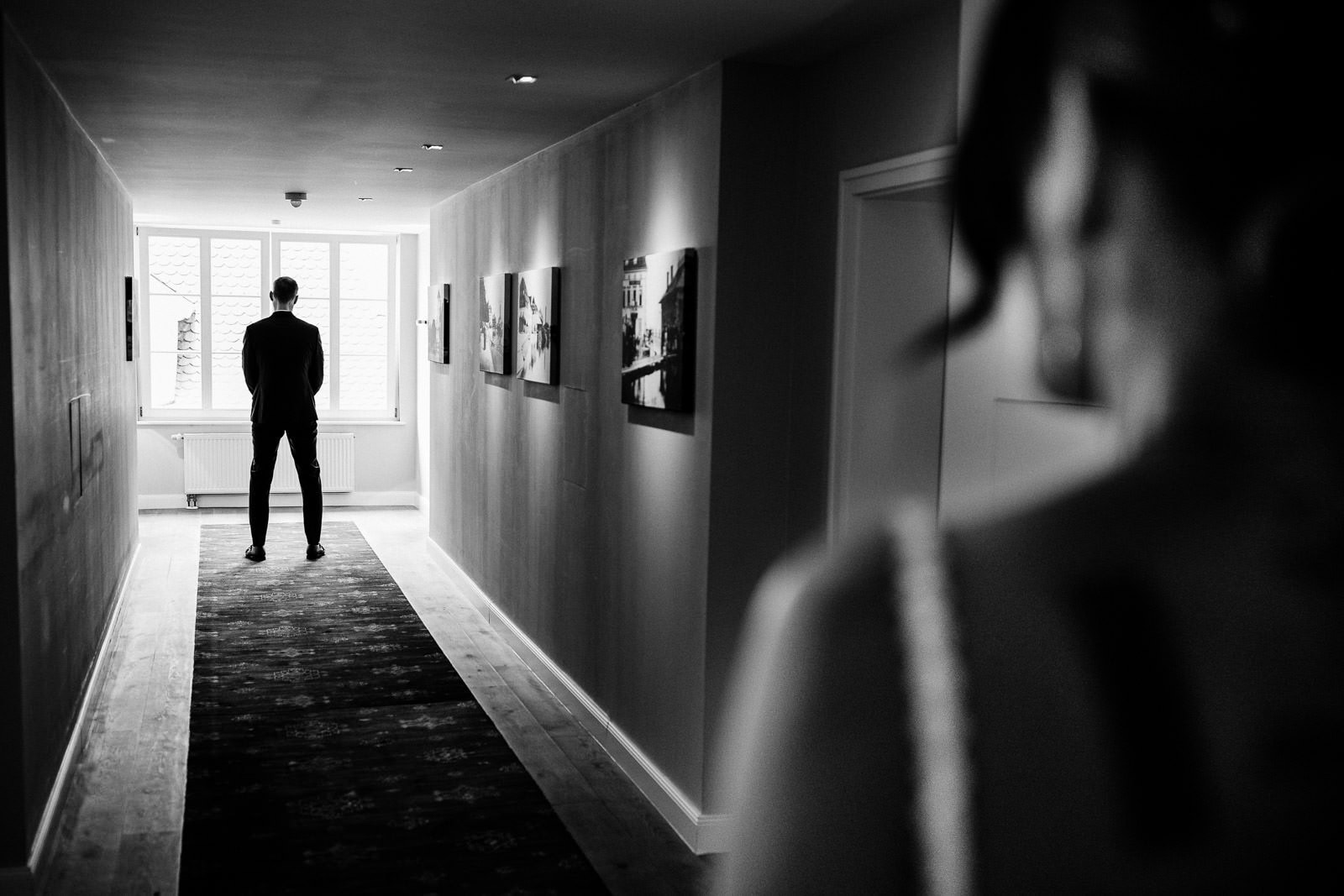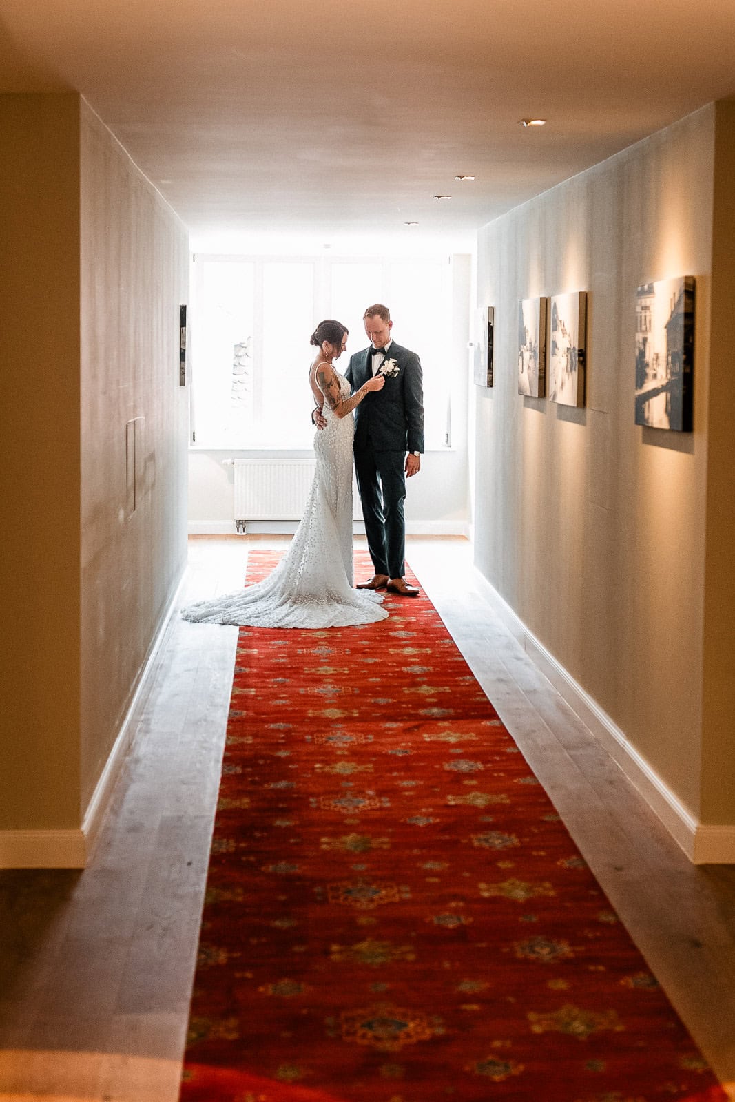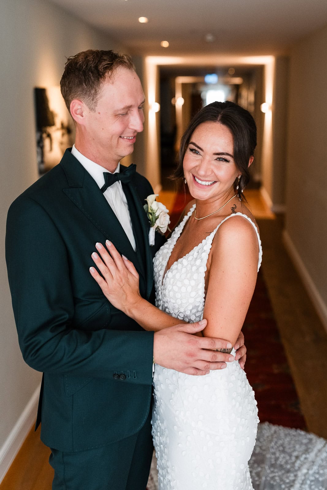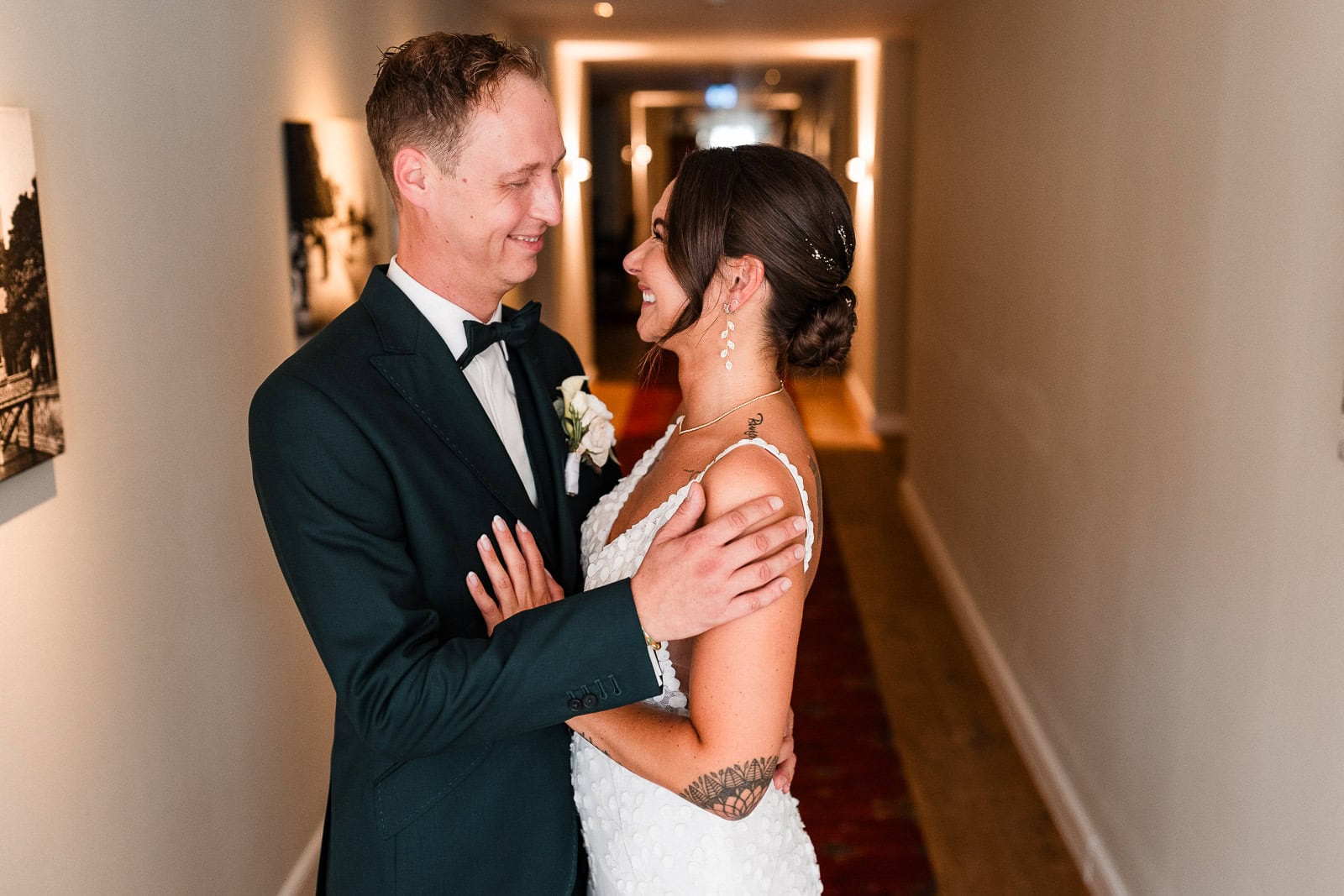 Bis kurz vor der Trauung zeigte sich das Wetter von seiner launischen Seite. Dichte Wolken und anhaltender Regen machten eine spontane Planänderung notwendig. Der First Look – ursprünglich im Freien geplant – musste kurzerhand ins Hotel verlegt werden.