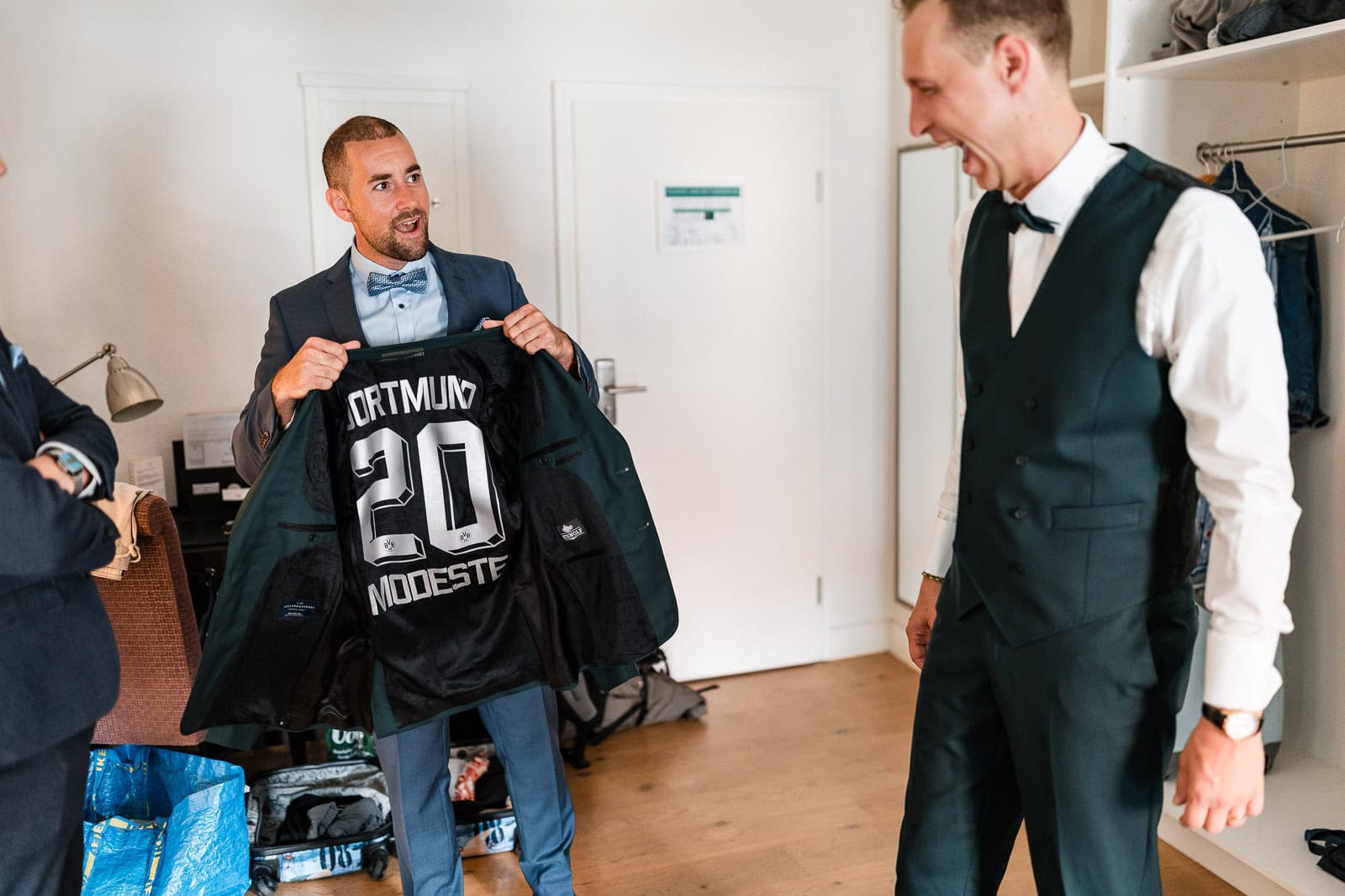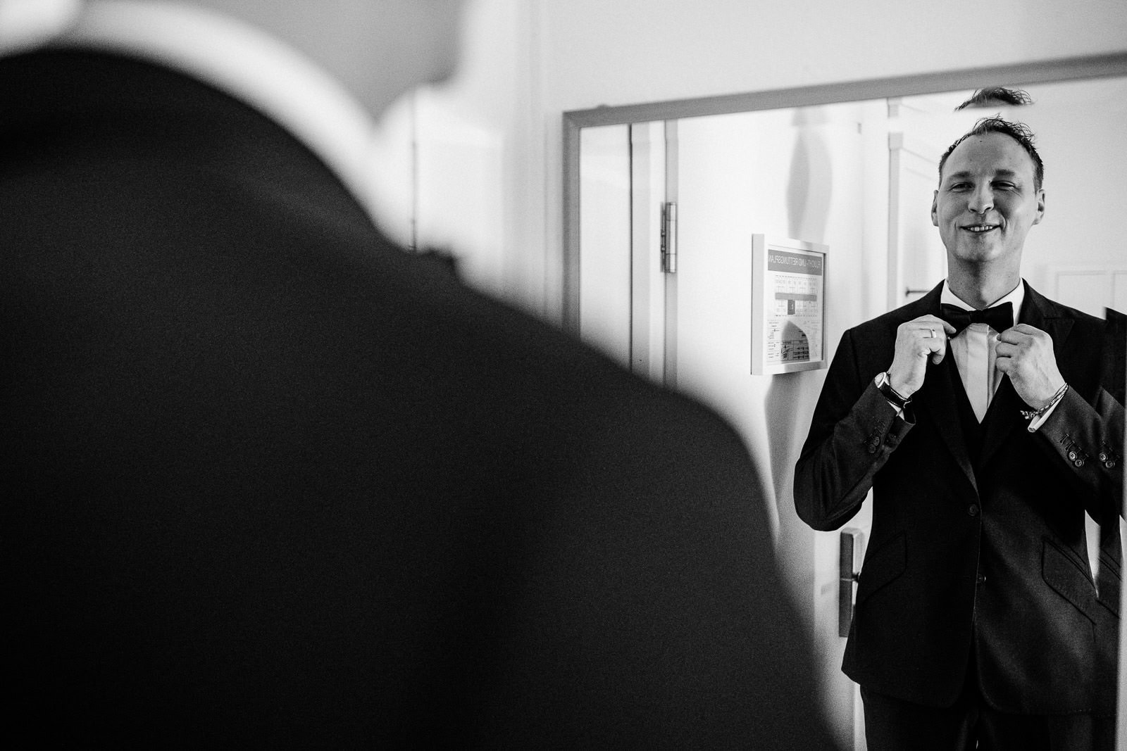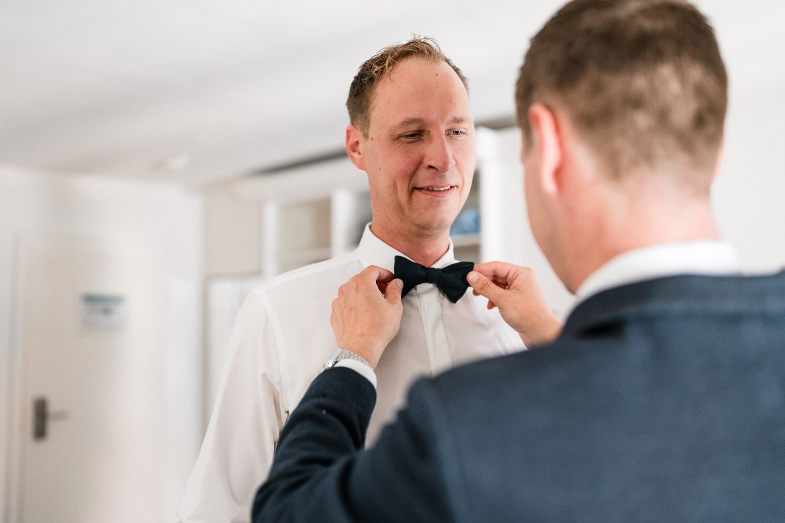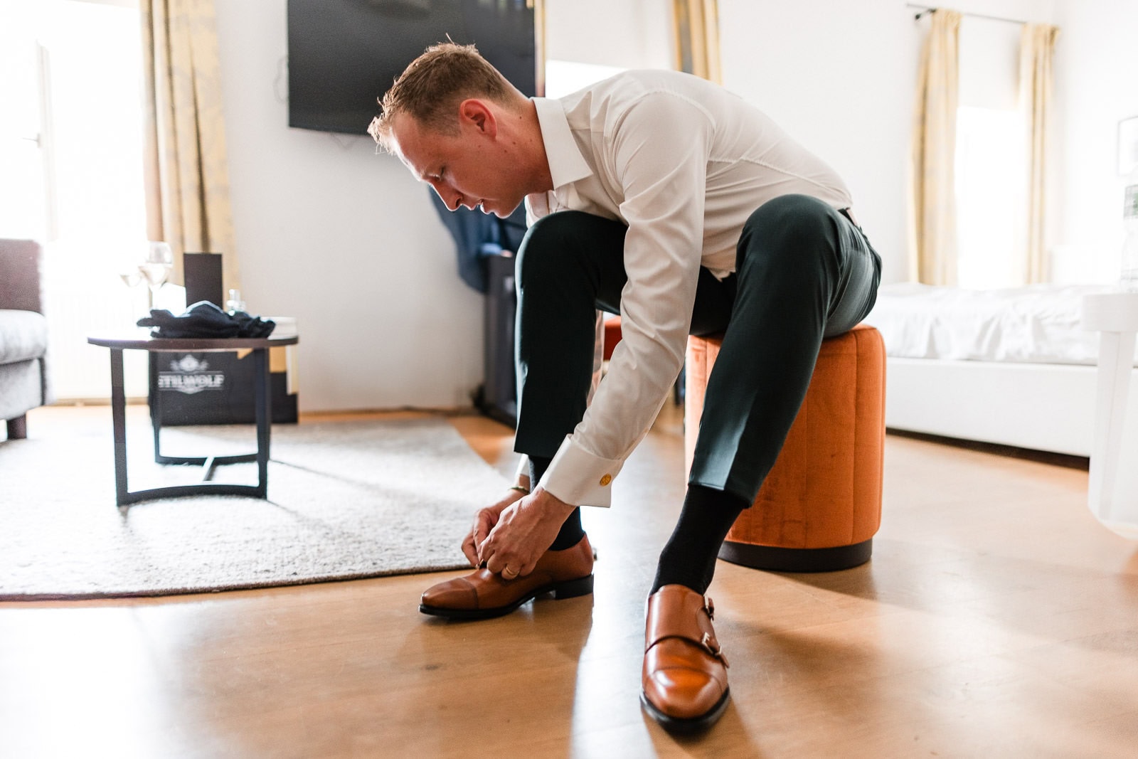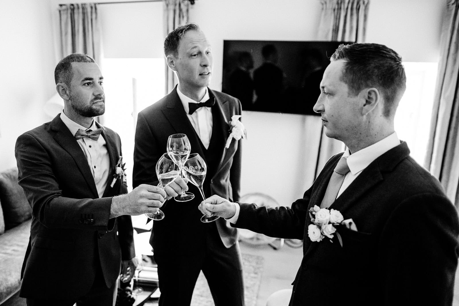 Auch Steve bereitete sich mit seinen Trauzeugen im BadHotel vor. Die Stimmung war entspannt, humorvoll und voller Vorfreude. Mit einem Glas Sekt in der Hand und dem stilvollen Anzug von Stilwolf Karlsruhe war er bereit für den großen Moment.