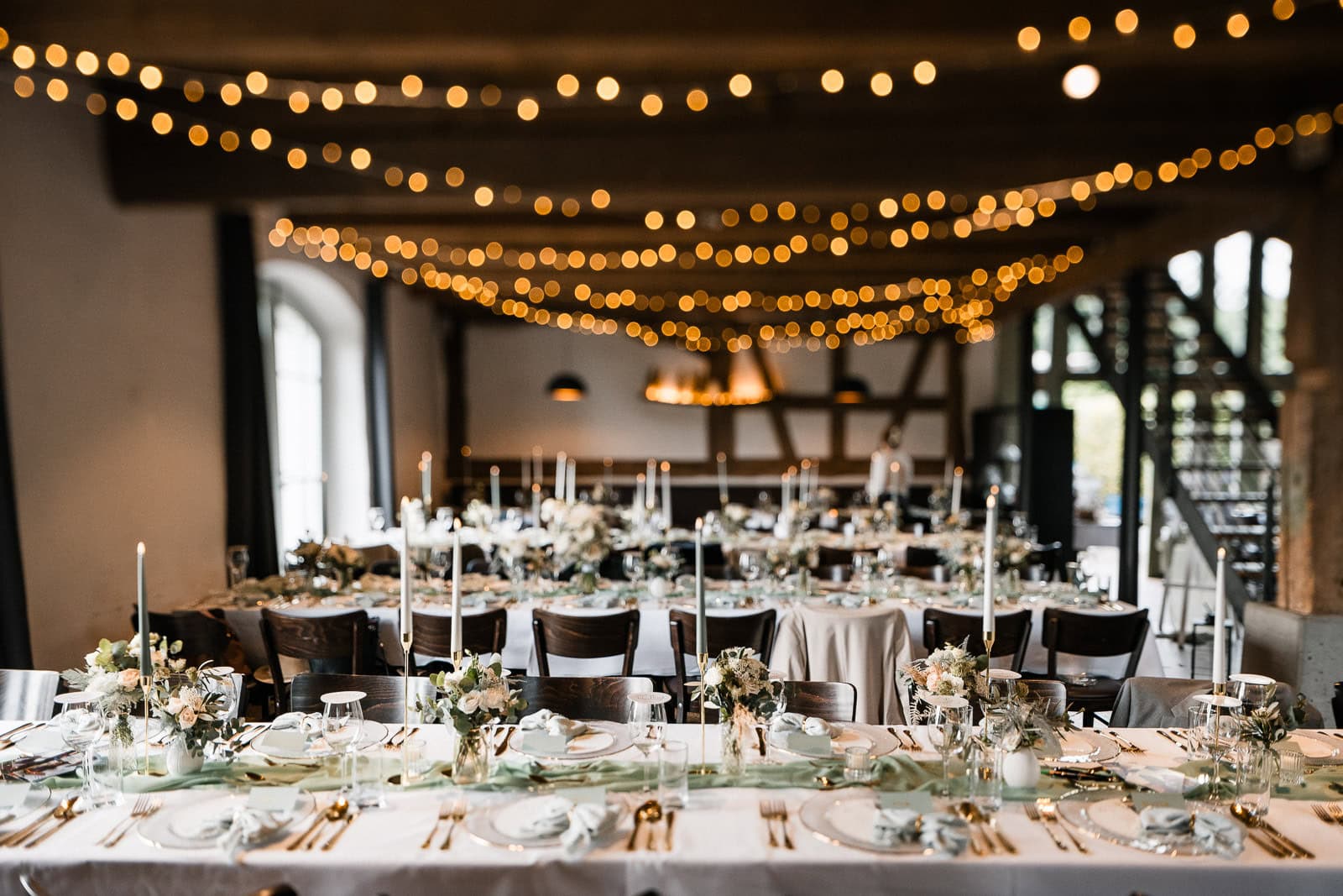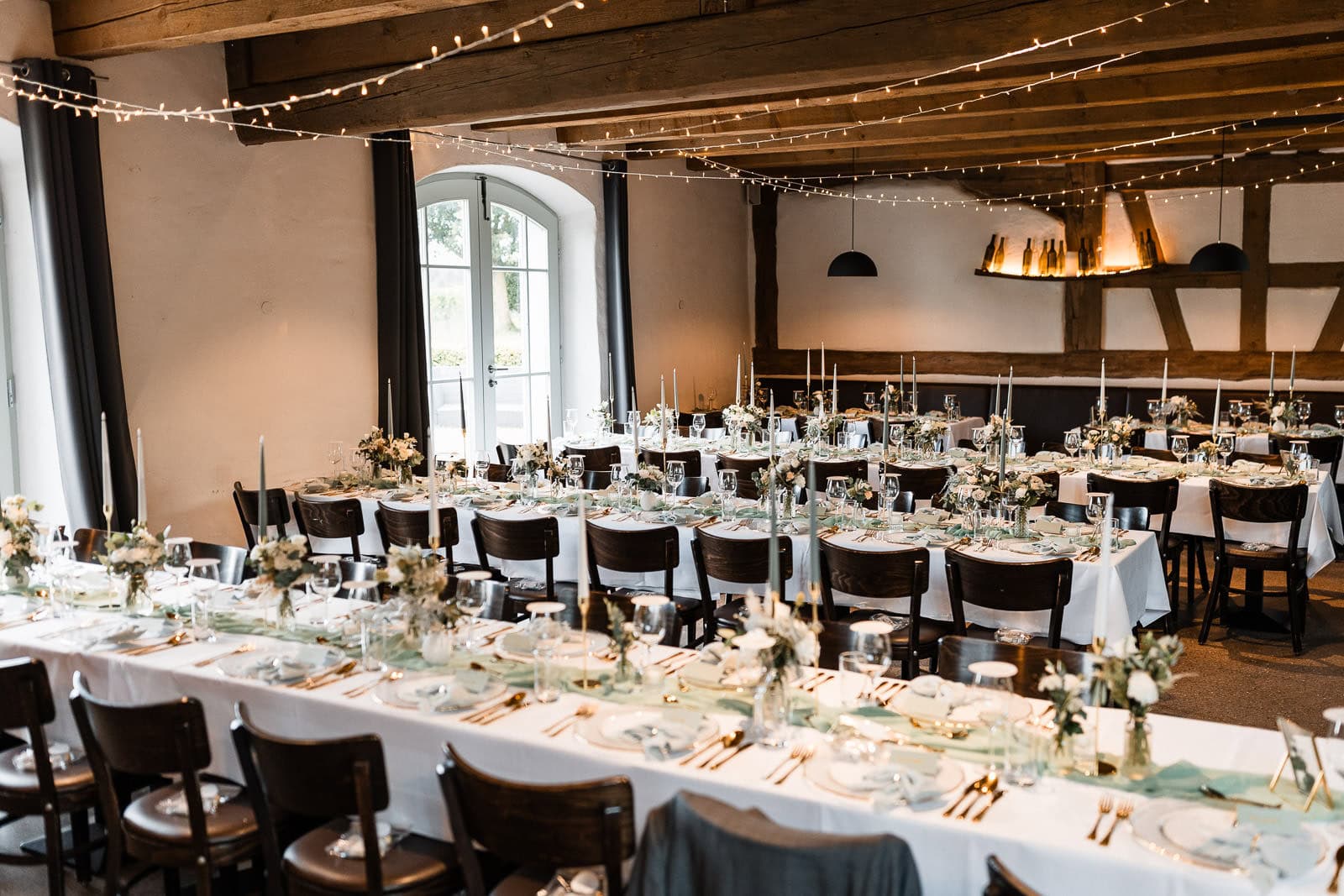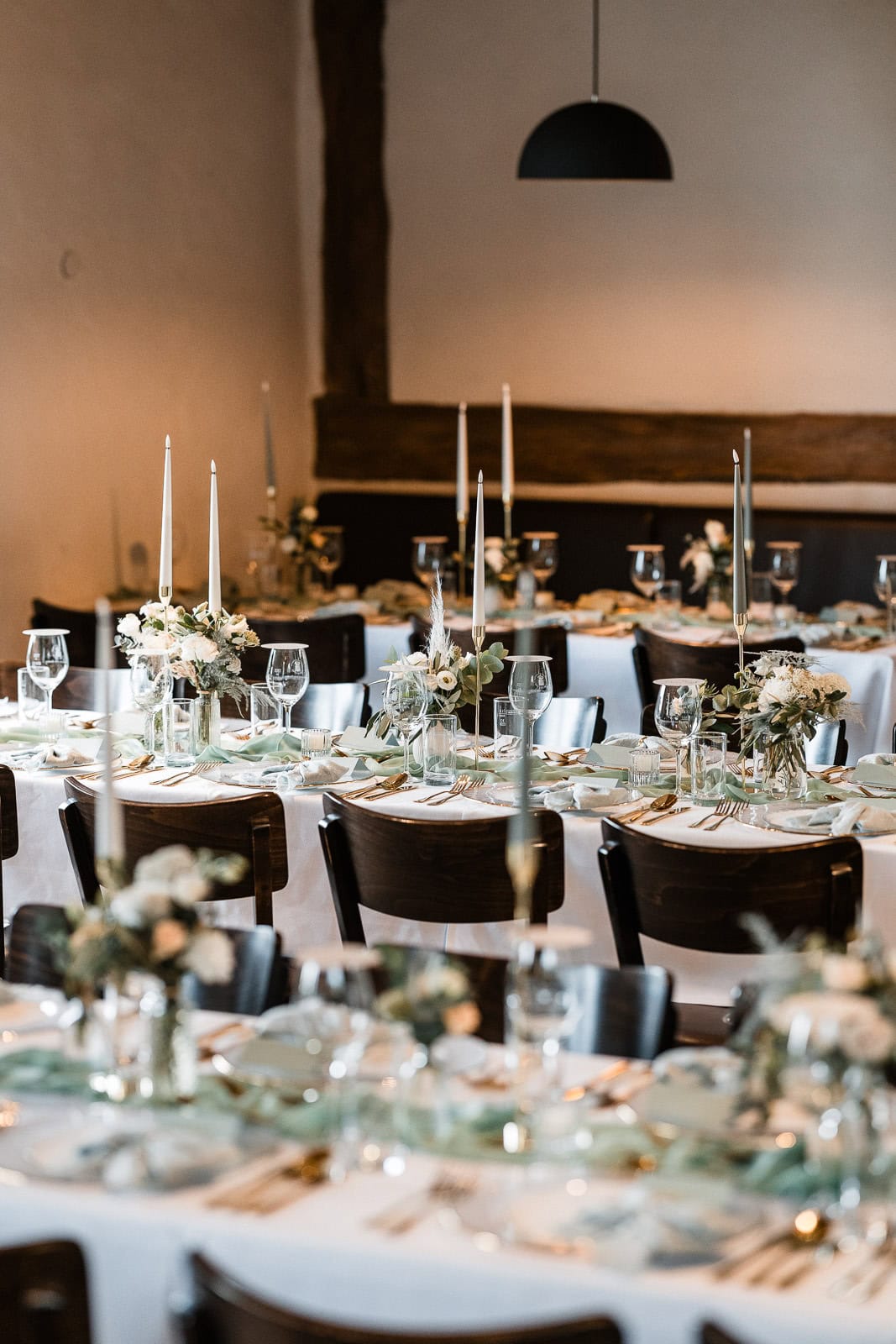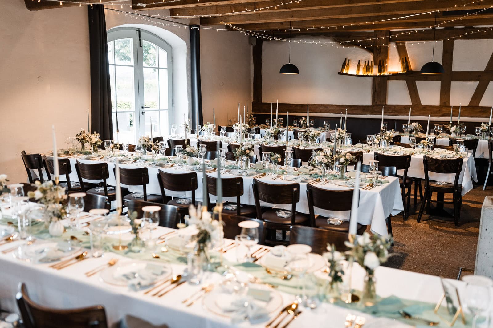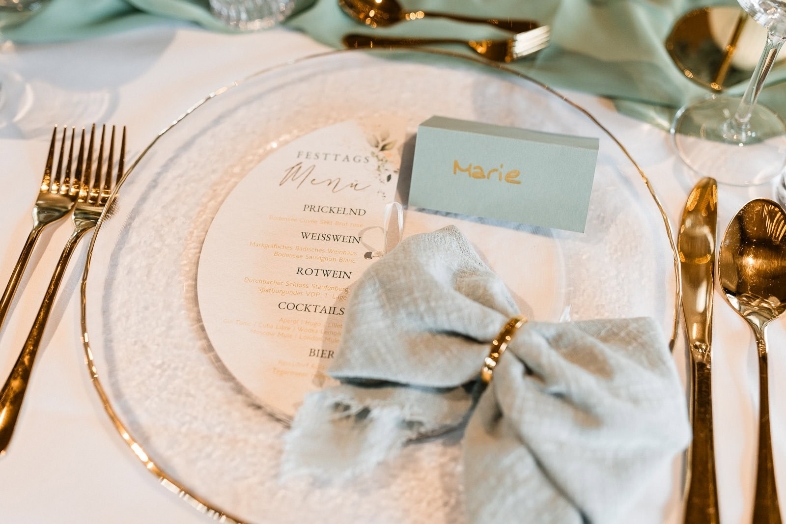 Nach der Trauung erwartete die Gäste eine stilvoll gedeckte Tafel – umgesetzt von Natalie von Hochzeit mit Herz, die für Floristik, Dekoration und das gesamte Farbkonzept verantwortlich war. Zarte Grüntöne, goldene Akzente und cremefarbene Blumen sorgten für ein elegantes, sommerliches Ambiente. Das Catering-Team des Birnauer Oberhofs verwöhnte die Gäste mit exzellentem Essen und kühlen Getränken – genau das Richtige nach einem heißen Nachmittag.